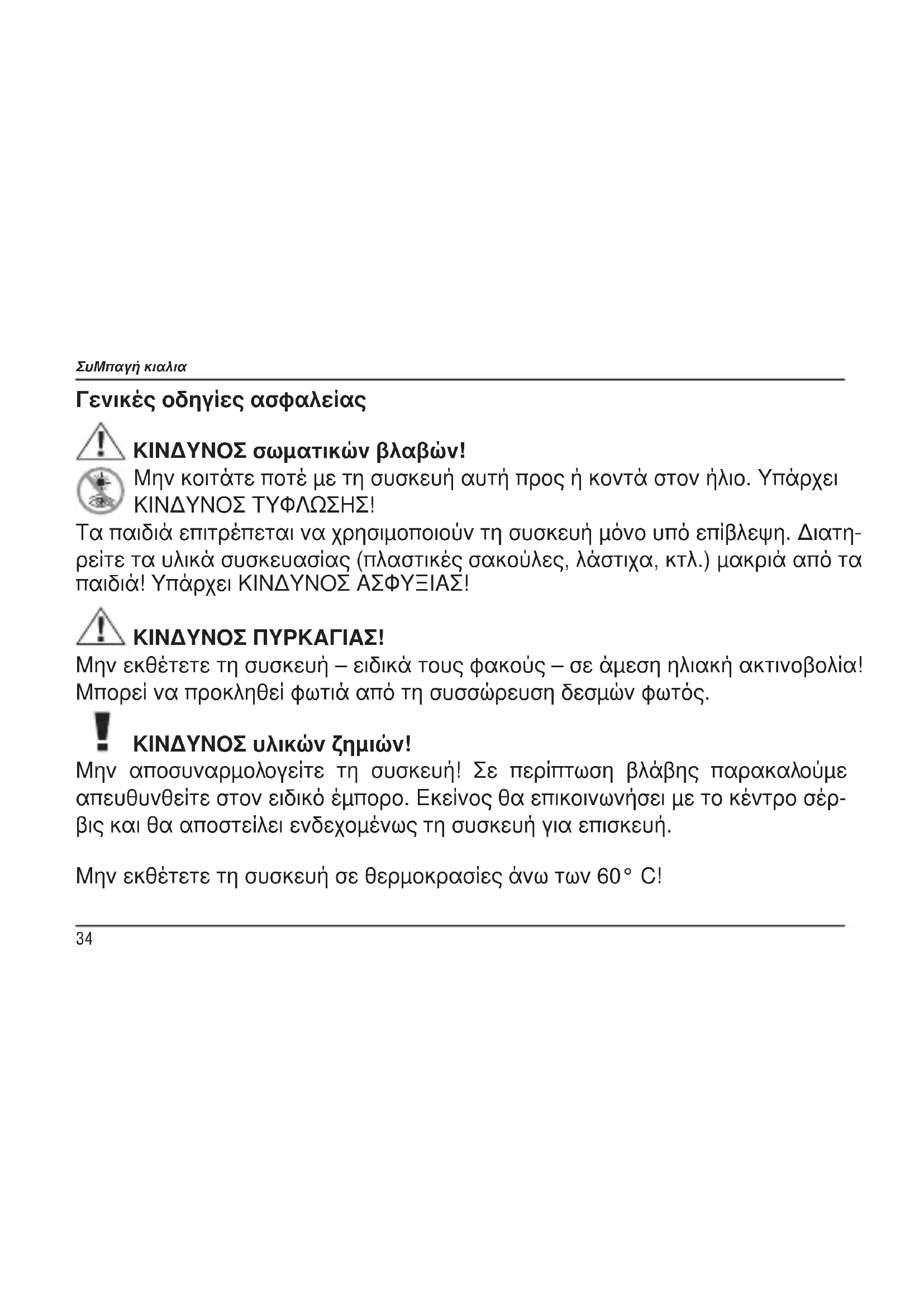 Para remover restos de sujidade mais difíceis humedeça o pano de limpeza com um líquido de limpeza para óculos e limpe as lentes, exercendo uma leve pressão. Proteja o aparelho do pó e da humidade! Após a utilização – sobretudo com uma humidade do ar elevada – deixe-o adaptar-se durante algum tempo à tem- peratura do compartimento, de forma que a humidade restante se possa dissi- par. Coloque as tampas protectoras do pó e guarde-o na bolsa fornecida.34 Γενικές οδηγίες ασφαλείας ΚΙΝΔΥΝΟΣ σωματικών βλαβών! Μην κοιτάτε ποτέ με τη συσκευή αυτή προς ή κοντά στον ήλιο. Υπάρχει ΚΙΝΔΥΝΟΣ ΤΥΦΛΩΣΗΣ! Τα παιδιά επιτρέπεται να χρησιμοποιούν τη συσκευή μόνο υπό επίβλεψη. Διατη- ρείτε τα υλικά συσκευασίας (πλαστικές σακούλες, λάστιχα, κτλ.) μακριά από τα παιδιά! Υπάρχει ΚΙΝΔΥΝΟΣ ΑΣΦΥΞΙΑΣ! ΚΙΝΔΥΝΟΣ ΠΥΡΚΑΓΙΑΣ! Μην εκθέτετε τη συσκευή – ειδικά τους φακούς – σε άμεση ηλιακή ακτινοβολία! Μπορεί να προκληθεί φωτιά από τη συσσώρευση δεσμών φωτός. ΚΙΝΔΥΝΟΣ υλικών ζημιών! Μην αποσυναρμολογείτε τη συσκευή! Σε περίπτωση βλάβης παρακαλούμε απευθυνθείτε στον ειδικό έμπορο. Εκείνος θα επικοινωνήσει με το κέντρο σέρ- βις και θα αποστείλει ενδεχομένως τη συσκευή για επισκευή. Μην εκθέτετε τη συσκευή σε θερμοκρασίες άνω των 60° C! Συμπαγή κιαλια35