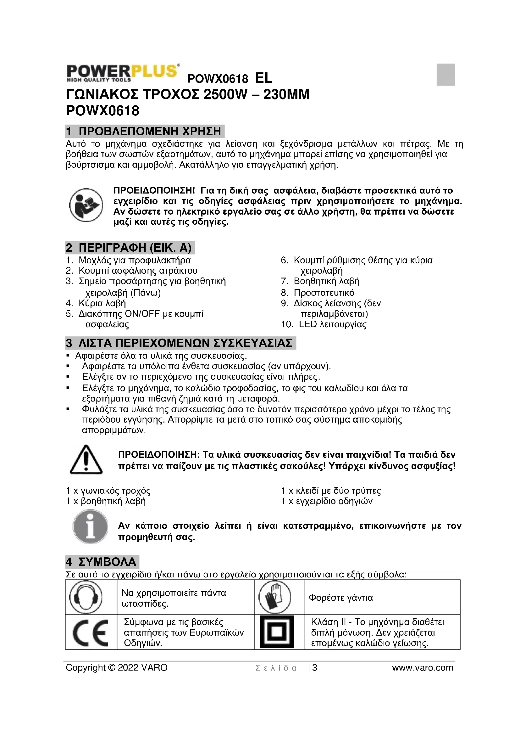 - 17 ΔΗΛΩΣΗ ΣΥΜΜΟΡΦΩΣΗΣ POWX0618 EL Copyright © 2022 VARO Σ ε λ ί δ α | 3 www.varo.com ΓΩΝΙΑΚΟΣ ΤΡΟΧΟΣ 2500W – 230MM POWX0618 1 ΠΡΟΒΛΕΠΟΜΕΝΗ ΧΡΗΣΗ Αυτό το μηχάνημα σχεδιάστηκε για λείανση και ξεχόνδρισμα μετάλλων και πέτρας. Με τη βοήθεια των σωστών εξαρτημάτων, αυτό το μηχάνημα μπορεί επίσης να χρησιμοποιηθεί για βούρτσισμα και αμμοβολή. Ακατάλληλο για επαγγελματική χρήση. ΠΡΟΕΙΔΟΠΟΙΗΣΗ! Για τη δική σας ασφάλεια, διαβάστε προσεκτικά αυτό το εγχειρίδιο και τις οδηγίες ασφάλειας πριν χρησιμοποιήσετε το μηχάνημα. Αν δώσετε το ηλεκτρικό εργαλείο σας σε άλλο χρήστη, θα πρέπει να δώσετε μαζί και αυτές τις οδηγίες. 2 ΠΕΡΙΓΡΑΦΗ (ΕΙΚ. A) p. 12