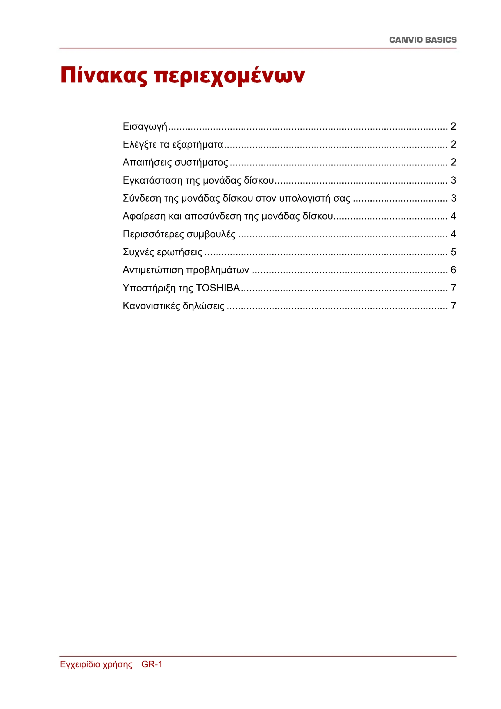 Σας ευχαριστούμε που επιλέξατε τη μονάδα σκληρού δίσκου Canvio Basics της TOSHIBA. ∆ιαβάστε προσεκτικά αυτό το Εγχειρίδιο χρήσης, καθώς περιέχει όλες τις σχετικές πληροφορίες για την εγκατάσταση, τη χρήση και τη συντήρηση της μονάδας δίσκου καθώς και συμβουλές για την ασφάλεια. Σε περίπτωση που η μονάδα δίσκου δεν συμπεριφέρεται όπως αναμένεται, ανατρέξτε στην ενότητα “Συχνές ερωτήσεις” στο τέλος αυτού του εγχειριδίου. Ελέγξτε τα εξαρτήματα Αυτό το Εγχειρίδιο χρήσης συμπεριλαμβάνεται στην ίδια τη μονάδα δίσκου. Συνιστούμε να δημιουργήσετε εφεδρικά αντίγραφα του εγχειριδίου χρήσης σε ένα CD ή στην τοπική μονάδα δίσκου αμέσως μετά την εγκατάσταση της μονάδας δίσκου. Ανατρέξτε στο “Εγχειρίδιο Οδηγιών για την Ασφάλεια και την Άνεση” που είναι προεγκατεστημένο σε αυτήν την εξωτερική μονάδα σκληρού δίσκ