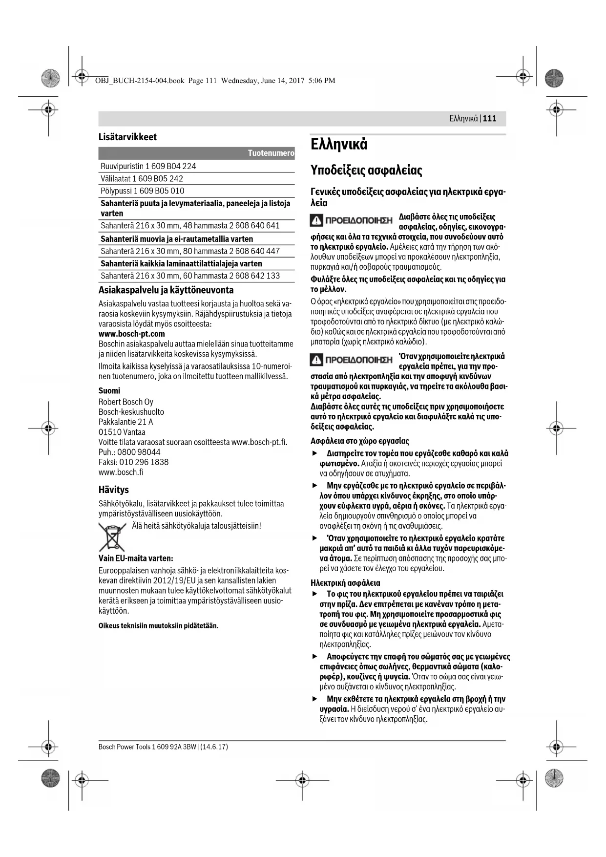 Ο όρος «ηλεκτρικό εργαλείο» που χρησιμοποιείται στις προειδο- ποιητικές υποδείξεις αναφέρεται σε ηλεκτρικά εργαλεία που τροφοδοτούνται από το ηλεκτρικό δίκτυο (με ηλεκτρικό καλώ- διο) καθώς και σε ηλεκτρικά εργαλεία που τροφοδοτούνται από μπαταρία (χωρίς ηλεκτρικό καλώδιο). Όταν χρησιμοποιείτε ηλεκτρικά εργαλεία πρέπει, για την προ- στασία από ηλεκτροπληξία και την αποφυγή κινδύνων τραυματισμού και πυρκαγιάς, να τηρείτε τα ακόλουθα βασι- κά μέτρα ασφαλείας. Διαβάστε όλες αυτές τις υποδείξεις πριν χρησιμοποιήσετε αυτό το ηλεκτρικό εργαλείο και διαφυλάξτε καλά τις υπο- δείξεις ασφαλείας. Ασφάλεια στο χώρο εργασίας Διατηρείτε τον τομέα που εργάζεσθε καθαρό και καλά φωτισμένο. Αταξία ή σκοτεινές περιοχές εργασίας μπορεί να οδηγήσουν σε ατυχήματα. Μην εργάζεσθε με το ηλεκτρικό εργαλείο σε περιβάλ- λον όπου υπάρχει κίνδυνος έκρηξης, στο οποίο υπάρ- χουν εύφλεκτα υγρά, αέρια ή σκόνες. Τα ηλεκτρικά εργα- λεία δημιουργούν σπινθηρισμό ο οποίος μπορεί να αναφλέξει τη σκόνη ή τις αναθυμιάσεις. Όταν χρησιμοποιείτε το ηλεκτρικό εργαλείο κρατάτε μακριά απ’ αυτό τα παιδιά κι άλλα τυχόν παρευρισκόμε- να άτομα. Σε περίπτωση απόσπασης της προσοχής σας μπο- ρεί να χάσετε τον έλεγχο του εργαλείου. Ηλεκτρική ασφάλεια Το φις του ηλεκτρικού εργαλείου πρέπει να ταιριάζει στην πρίζα. Δεν επιτρέπεται με κανέναν τρόπο η μετα- τροπή του φις. Μη χρησιμοποιείτε προσαρμοστικά φις σε συνδυασμό με γειωμένα ηλεκτρικά εργαλεία. Αμετα- ποίητα φις και κατάλληλες πρίζες μειώνουν τον κίνδυνο ηλεκτροπληξίας. Αποφεύγετε την επαφή του σώματός σας με γειωμένες επιφάνειες όπως σωλήνες, θερμαντικά σώματα (καλο- ριφέρ), κουζίνες ή ψυγεία. Όταν το σώμα σας είναι γειω- μένο αυξάνεται ο κίνδυνος ηλεκτροπληξίας. Μην εκθέτετε τα ηλεκτρικά εργαλεία στη βροχή ή την υγρασία. Η διείσδυση νερού σ’ ένα ηλεκτρικό εργαλείο αυ- ξάνει τον κίνδυνο ηλεκτροπληξίας. Tuotenumero Ruuvipuristin 1 609 B04 224 Välilaatat 1 609 B05 242 Pölypussi 1 609 B05 010 Sahanteriä puuta ja levymateriaalia, paneeleja ja listoja varten Sahanterä 216 x 30 mm, 48 hammasta 2 608 640 641 Sahanteriä muovia ja ei-rautametallia varten Sahanterä 216 x 30 mm, 80 hammasta 2 608 640 447 Sahanteriä kaikkia laminaattilattialajeja varten Sahanterä 216 x 30 mm, 60 hammasta 2 608 642 133 OBJ_BUCH-2154-004.book Page 111 Wednesday, June 14, 2017 5:06 PM112 | Ελληνικά 1 609 92A 3BW | (14.6.17) Bosch Power Tools Μη χρησιμοποιείτε το ηλεκτρικό καλώδιο για να μετα- φέρετε ή να αναρτήσετε το ηλεκτρικό εργαλείο, ή για να βγάλετε το φις από την πρίζα. Κρατάτε το ηλεκτρικό κα- λώδιο μακριά από υπερβολικές θερμοκρασίες, κοφτε- ρές ακμές και/ή από κινητά εξαρτήματα. Τυχόν χαλασμέ- να ή περιπλεγμένα ηλεκτρικά καλώδια αυξάνουν τον κίνδυνο ηλεκτροπληξίας. Όταν εργάζεσθε μ’ ένα ηλεκτρικό εργαλείο στην ύπαι- θρο να χρησιμοποιείτε καλώδια επιμήκυνσης (μπαλα- ντέζες) που είναι κατάλληλα και για χρήση στην ύπαι- θρο. Η χρήση καλωδίων επιμήκυνσης κατάλληλων για υπαίθριους χώρους ελαττώνει τον κίνδυνο ηλεκτροπληξίας. Όταν η χρήση του ηλεκτρικού εργαλείου σε υγρό περι- βάλλον είναι αναπόφευκτη, τότε χρησιμοποιήστε έναν προστατευτικό διακόπτη διαρροής (διακόπτη FI/RCD). Η χρήση ενός προστατευτικού διακόπτη διαρροής ελαττώνει τον κίνδυνο ηλεκτροπληξίας. Ασφάλεια προσώπων Να είστε πάντοτε προσεκτικός/προσεκτική, να δίνετε προσοχή στην εργασία που κάνετε και να χειρίζεστε ένα ηλεκτρικό εργαλείο με περίσκεψη. Μη χρησιμοποιήσε- τε ένα ηλεκτρικό εργαλείο όταν είστε κουρασ- μένος/κουρασμένη ή όταν βρίσκεστε υπό την επήρεια ναρκωτικών, οινοπνεύματος ή φαρμάκων. Μια στι