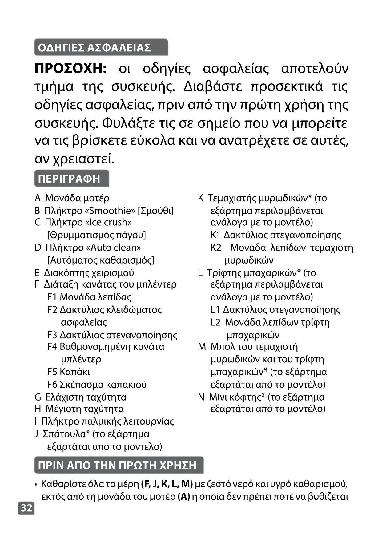 ΠΡΙΝ ΑΠΟ ΤΗΝ ΠΡΩΤΗ ΧΡΗΣΗ ΟΔΗΓΙΕΣ ΑΣΦΑΛΕΙΑΣ A Μονάδα μοτέρ B Πλήκτρο «Smoothie» [Σμούθι] C Πλήκτρο «Ice crush» [Θρυμματισμός πάγου] D Πλήκτρο «Auto clean» [Αυτόματος καθαρισμός] E Διακόπτης χειρισμού F Διάταξη κανάτας του μπλέντερ F1 Μονάδα λεπίδας F2 Δακτύλιος κλειδώματος