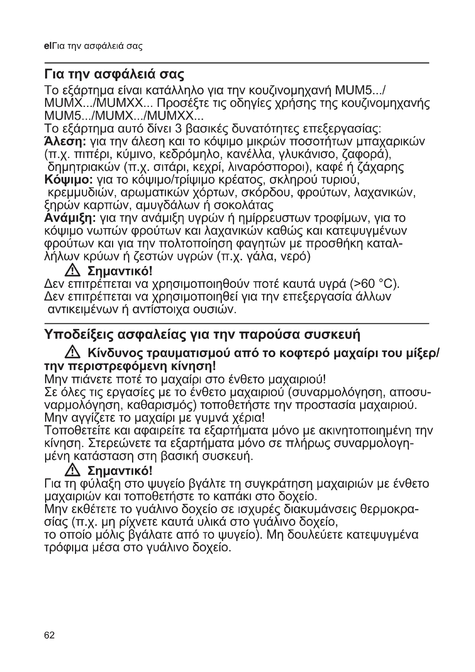 W Κίνδυνος τραυματισμού από το κοφτερό μαχαίρι! Μην πιάνετε ποτέ το μαχαίρι στο ένθετο μαχαιριού! Σε όλες τις εργασίες με το ένθετο μαχαιριού (συναρμολόγηση, αποσυναρ μολόγηση, καθαρισμός) τοποθετήστε την προστασία μαχαιριού. ■ Πριν την πρώτη χρήση καθαρίστε όλα τα μέρη, βλ. «Καθαρισμός και φροντίδα». Εικόνα D X MUM5... Εικόνα E X MUMX... Προετοιμασία προσαρτήματος Εικόνα λεπτομέρειας 1-5 ■ Βάλτε τα υλικά στο δοχείο. Μην υπερβαίνετε το σημάδι max! ■ Πιάστε το ένθετο μαχαιριού στην προστασία μαχαιριού και τοποθετήστε το στη συγκράτηση μαχαιριού. Πιέστε το προς τα κάτω μέχρι να κουμπώσει. ■ Αφαιρέστε την προστασία μαχαιριού. ■ Τοποθετήστε τη συγκράτηση μαχαιριού στο δοχείο και κλείστε το στρέφοντάς το αντίθετα προς τη φορά των δεικτών του