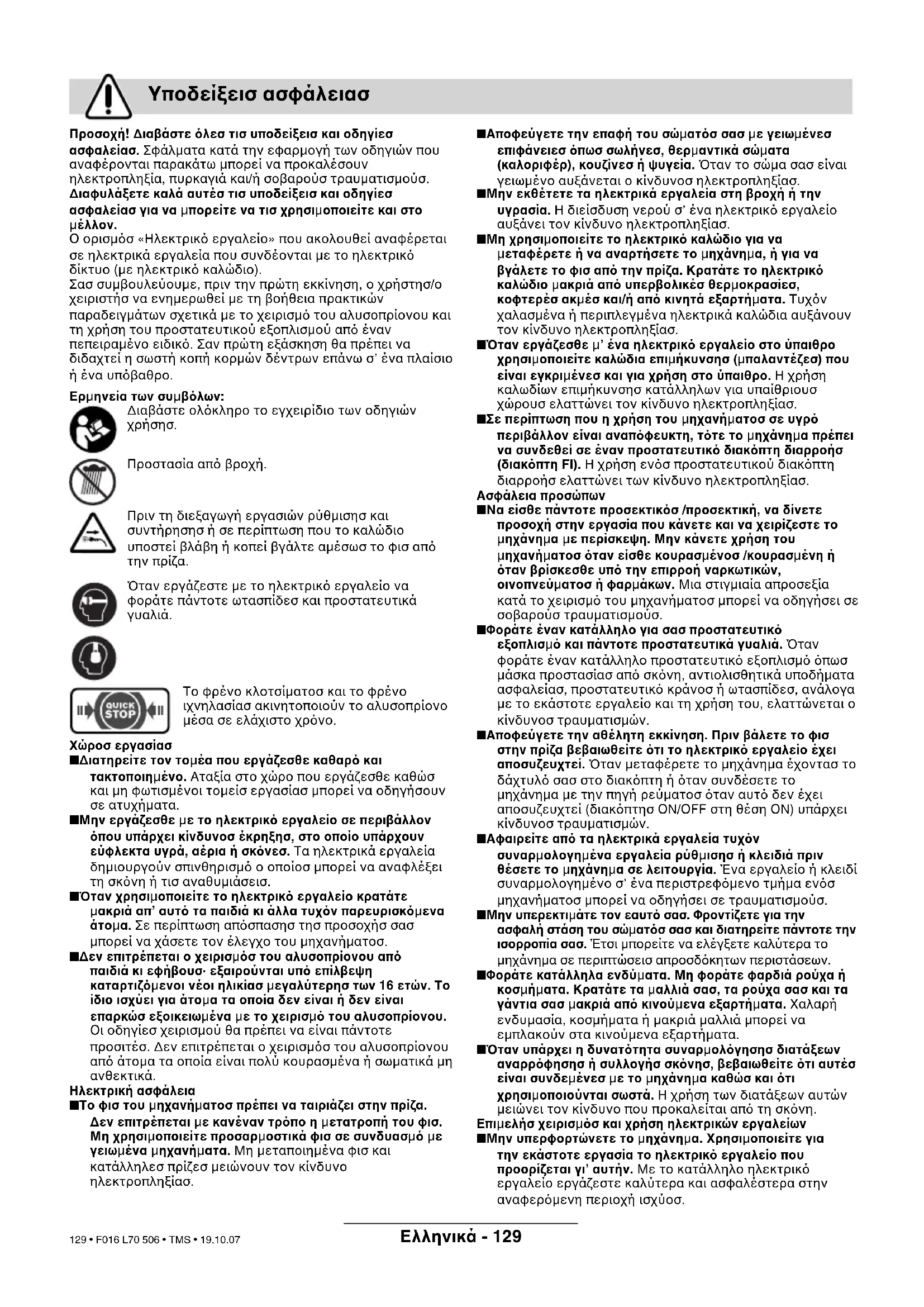 F016 L70 506 - Titel.book Seite 130 Dienstag, 23. Oktober 2007 1:28 13 130 • F016 L70 506 • TMS • 19.10.07Eλληνικά - 131 Το µηχάνηµα προορίζεται για το κψιµο δένδρων καθώσ και για το πρινισµα (την κοπή) κορµών, κλάδων, καδρονιών, σανίδων κτλ. και µπορεί να χρησιµοποιηθεί για κοπέσ και κατά µήκοσ των «νερών» του ξύλου και εγκάρσια σ’ αυτά. Το µηχάνηµα αυτ δεν είναι κατάλληλο για την κοπή ορυκτών υλικών. Το παρν εγχειρίδιο περιέχει οδηγίεσ για τη σωστή συναρµολγηση και τον ασφαλή χειρισµ του αλυσοπρίονού σασ. Είναι σηµαντικ, να διαβάσετε προσεκτικά τισ παρούσεσ οδηγίεσ. Αποσυσκευάστε προσεκτικά λα τα τµήµατα του µηχανήµατοσ και ελέγξτε την αρτιτητα τησ