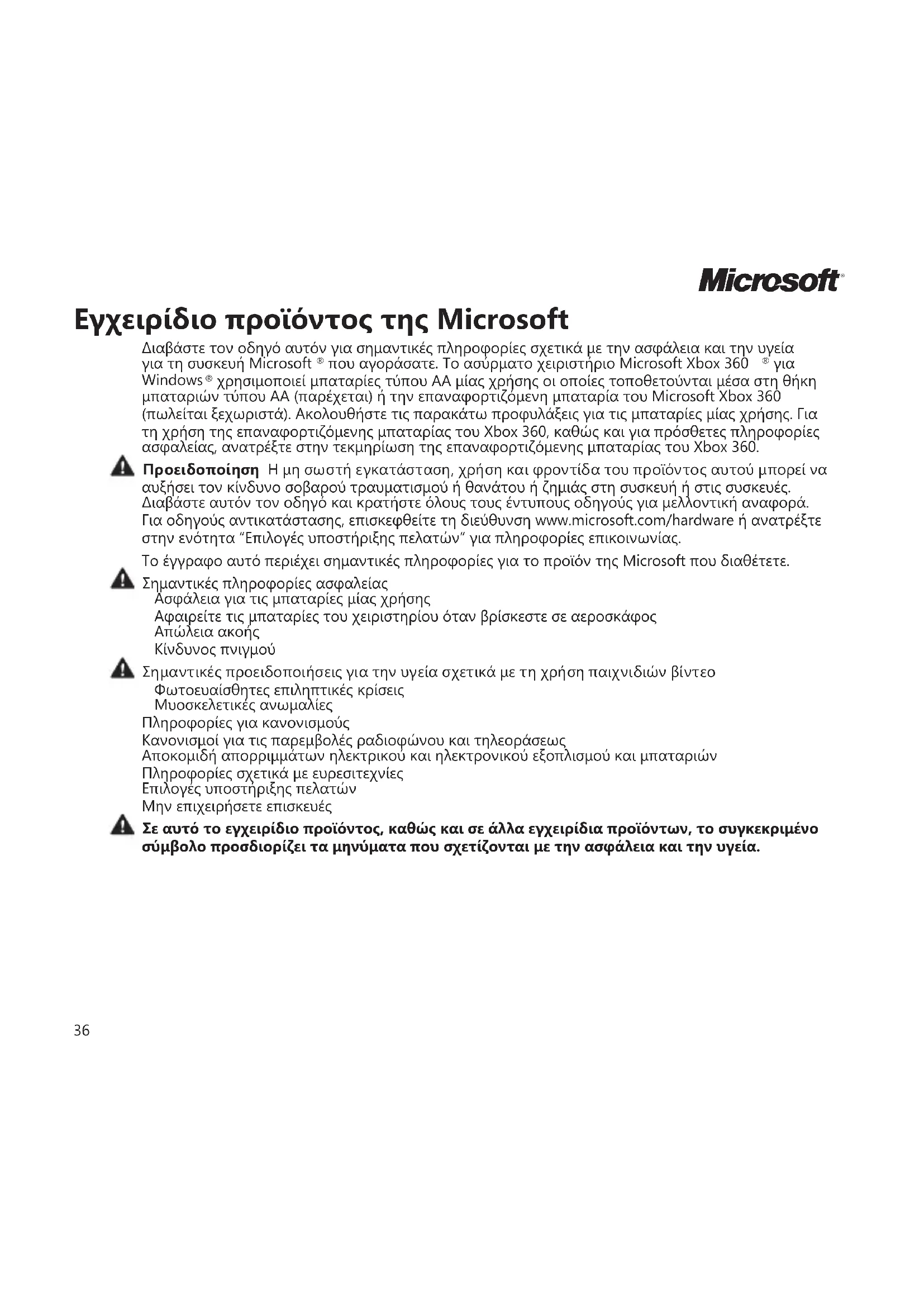 χρησιμοποιεί μπαταρίες τύπου AA μίας χρήσης οι οποίες τοποθετούνται μέσα στη θήκη μπαταριών τύπου AA (παρέχεται) ή την επαναφορτιζόμενη μπαταρία του Microsoft Xbox 360 (πωλείται ξεχωριστά). Ακολουθήστε τις παρακάτω προφυλάξεις για τις μπαταρίες μίας χρήσης. Για τη χρήση της επαναφορτιζόμενης μπαταρίας του Xbox 360, καθώς και για πρόσθετες πληροφορίες ασφαλείας, ανατρέξτε στην τεκμηρίωση της επαναφορτιζόμενης μπαταρίας του Xbox 360. Προειδοποίηση Η μη σωστή εγκατάσταση, χρήση και φροντίδα του προϊόντος αυτού μπορεί να αυξήσει τον κίνδυνο σοβαρού τραυματισμού ή θανάτου ή ζημιάς στη συσκευή ή στις συσκευές. Διαβάστε αυτόν τον οδηγό και κρατήστε όλους τους έντυπους οδηγούς για μελλοντική αναφορά. Για οδηγούς αντικατάστασης, επισκεφθείτε τη διεύθυνση www.microsoft.com/hardware ή ανατρέξτε στην ενότητα “Επιλογές υποστήριξης πελατών” για πληροφορίες επικοινωνίας. Το έγγραφο αυτό περιέχει σημαντικές πληροφορίες για το προϊόν της Microsoft που διαθέτετε. Σημαντικές πληροφορίες ασφαλείας Ασφάλεια για τις μπαταρίες μίας χρήσης Αφαιρείτε τις μπαταρίες του χειριστηρίου όταν βρίσκεστε σε αεροσκάφος Απώλεια ακοής Κίνδυνος πνιγμού Σημαντικές προειδοποιήσεις για την υγεία σχετικά με τη χρήση παιχνιδιών βίντεο Φωτοευαίσθητες επιληπτικές κρίσεις Μυοσκελετικές ανωμαλίες Πληροφορίες για κανονισμούς Κανονισμοί για τις παρεμβολές ραδιοφώνου και τηλεοράσεως Αποκομιδή απορριμμάτων ηλεκτρικού και ηλεκτρονικού εξοπλισμού και μπαταριών Πληροφορίες σχετικά με ευρεσιτεχνίες Επιλογές υποστήριξης πελατών Μην επιχειρήσετε επισκευές Σε αυτό το εγχειρίδιο προϊόντος, καθώς και σε άλλα εγχειρίδια προϊόντων, το συγκεκριμένο σύμβολο προσδιορίζει τα μηνύματα που σχετίζονται με την ασφάλεια και την υγεία.