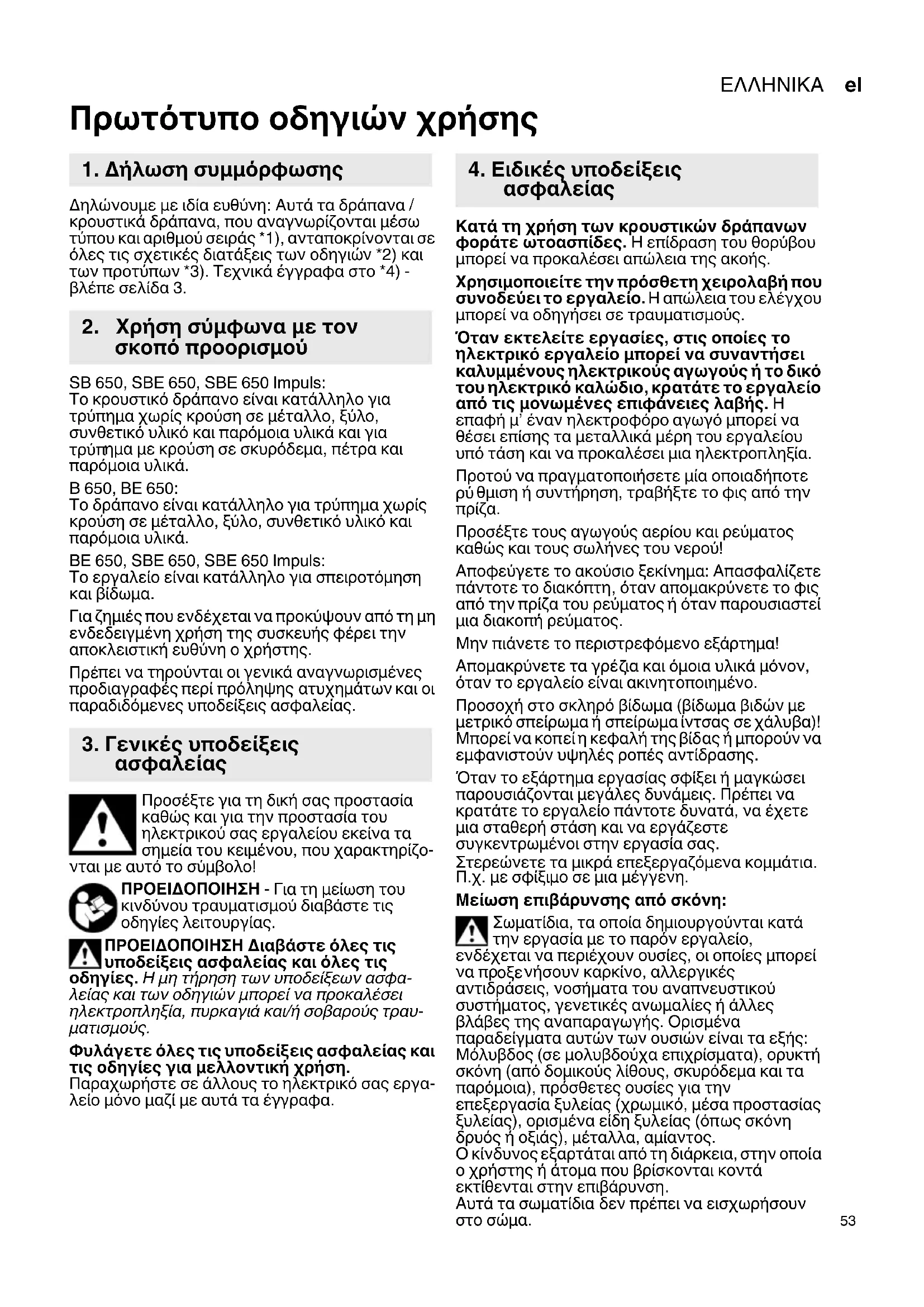 ημα με κρούση σε σκυρόδεμα, πέτρα και παρόμοια υλικά. B 650, BE 650: Το δράπανο είναι κατάλληλο για τρύπημα χωρίς κρούση σε μέταλλο, ξύλο, συνθετικό υλικό και παρόμοια υλικά. BE 650, SBE 650, SBE 650 Impuls: Το εργαλείο είναι κατάλληλο για σπειροτόμηση και βίδωμα. Για ζημιές που ενδέχεται να προκύψουν από τη μη ενδεδειγμένη χρήση της συσκευής φέρει την αποκλειστική ευθύνη ο χρήστης.