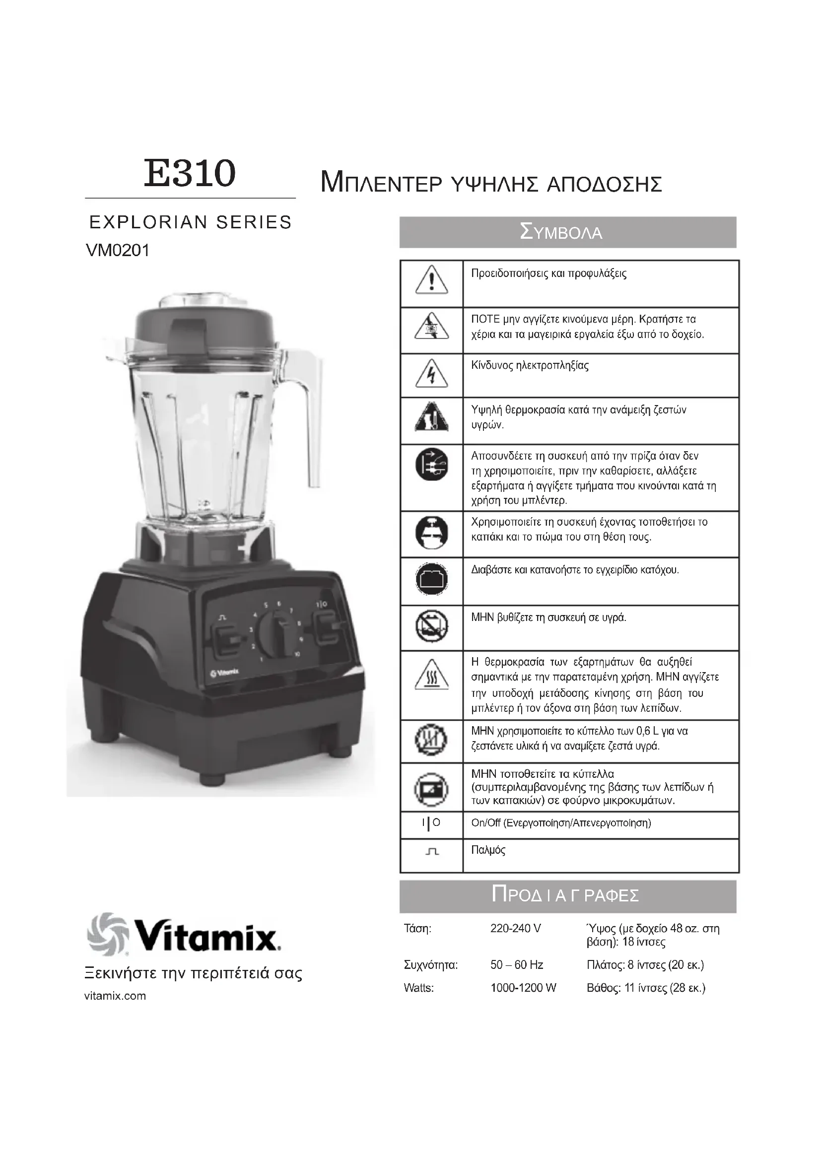 4Homes FZCO PO Box 61379, Dubai UAE. Tel: +971 4 3807611 Fax: +971 4 387612 4homes@4homes.ae www.tavolashop.com UNITED ARAB EMIRATES 4Homes FZCO PO Box 61379, Dubai UAE. Tel: +971 4 3807611 Fax: +971 4 387612 4homes@4homes.ae www.tavolashop.com AUSTRALIA & NEW ZEALAND Vitamix ANZ Pty Limited 167 King St Newcastle NSW2300 Australia Tel: 1-800-766437 (AUS) Tel: 050-853-0697 (NZ) www.vitamix.com.au www.vitamix.co.nzΞεκινήστε την περιπέτειά σαςvitamix.comVM0201 Προειδοποιήσεις και προφυλάξειςΠΟΤΕ μην αγγίζετε κινούμενα μέρη. Κρατήστε τα χέρια και τα μαγειρικά εργαλεία έξω από το δοχείο.Κίνδυνος ηλεκτροπληξίαςΥψηλή θερμοκρασία κατά την ανάμειξη ζεστών υγρών.Αποσυνδέετε τη συσκευή από την πρίζα όταν δεν τη χρησιμοποιείτε, πριν την καθαρίσετε, αλλάξετε εξαρτήματα ή αγγίξετε τμήματα που κινούνται κατά τη χρήση του μπλέντερ.Χρησιμοποιείτε τη συσκευή έχοντας τοποθετήσει το καπάκι και το πώμα του στη θέση τους.Διαβάστε και κατανοήστε το εγχειρίδιο κατόχου.ΜΗΝ βυθίζετε τη συσκευή σε υγρά.Η θερμοκρασία των εξαρτημάτων θα αυξηθεί σημαντικά με την παρατεταμένη χρήση. ΜΗΝ αγγίζετε την υποδοχή μετάδοσης κίνησης στη βάση του μπλέντερ ή τον άξονα στη βάση των λεπίδων.ΜΗΝ χρησιμοποιείτε το κύπελλο των 0,6 L για να ζεστάνετε υλικά ή να αναμίξετε ζεστά υγρά. ΜΗΝ τοποθετείτε τα κύπελλα (συμπεριλαμβανομένης της βάσης των λεπίδων ή των καπακιών) σε φούρνο μικροκυμάτων.I OOn/Off (Ενεργοποίηση/Απενεργοποίηση)Παλμός μπλέντέρ ύψηληΣ αποδοΣηΣ προδ ι α γ ραφέΣ E310 EXPLORIAN SERIES Τάση: 220-240 V Ύψος (με δοχείο 48 oz. στη βάση): 18 ίντσες Συχνότητα: 50 – 60 Hz Πλάτος: 8 ίντσες (20 εκ.) Watts: 1000-1200 W Βάθος: 11 ίντσες (28 εκ.)172 ΣημαντικέΣ οδηγιέΣ γ ι α α Σ φα λ η χ ρ η Σ η ΠΡΟΕΙΔΟΠΟΙΗΣΗ: Για να αποφύγετε τον κίνδυνο σοβαρού τραυματισμού όταν χρησιμοποιείτε το μπλέντερ της Vitamix®, θα πρέπει να τηρείτε τις βασικές προφυλάξεις ασφαλείας, συμπεριλαμβανομένων των