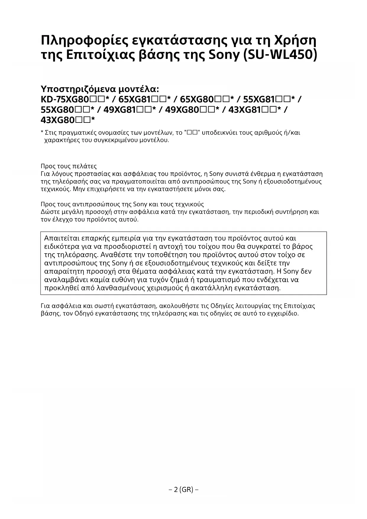 - Στις πραγματικές ονομασίες των μοντέλων, το "" υποδεικνύει τους αριθμούς ή/και χαρακτήρες του συγκεκριμένου μοντέλου. Προς τους πελάτες Για λόγους προστασίας και ασφάλειας του προϊόντος, η Sony συνιστά ένθερμα η εγκατάσταση της τηλεόρασής σας να πραγματοποιείται από αντιπροσώπους της Sony ή εξουσιοδοτημένους τεχνικούς. Μην επιχειρήσετε να την εγκαταστήσετε μόνοι σας. Προς τους αντιπροσώπους της Sony και τους τεχνικούς Δώστε μεγάλη προσοχή στην ασφάλεια κατά την εγκατάσταση, την περιοδική συντήρηση και τον έλεγχο του προϊόντος αυτού. Απαιτείται επαρκής εμπειρία για την εγκατάσταση του προϊόντος αυτού και ειδικότερα για να προσδιοριστεί η αντοχή του τοίχου που θα συγκρατεί το βάρος της τηλεόρασης. Αναθέστε την τοποθέτηση του προϊόντος αυτού στον τοίχο σε αντιπροσώπους της Sony ή σε εξουσιοδοτημένους τεχνικούς και δείξτε την απαραίτητη προσοχή στα θέματα ασφάλειας κατά την εγκατάσταση. Η Sony δεν αναλαμβάνει καμία ευθύνη για τυχόν ζημιά ή τραυματισμό που ενδέχεται να προκληθεί από λανθασμένους χειρισμούς ή ακατάλληλη εγκατάσταση. Για ασφάλεια και σωστή εγκατάσταση, ακολουθήστε τις Οδηγίες λειτουργίας της Επιτοίχιας βάσης, τον Οδηγό εγκατάστασης της τηλεόρασης και τις οδηγίες σε αυτό το εγχειρίδιο.− 3 (GR) −
