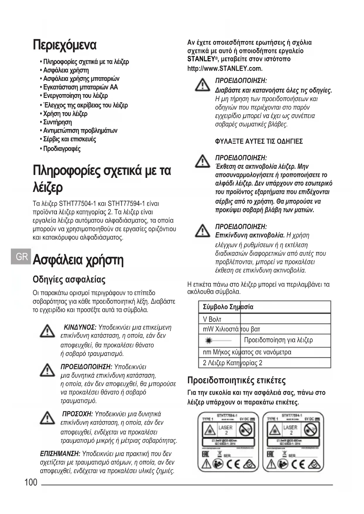 , μεταβείτε στον ιστότοπο http://www.STANLEY.com. ΠΡΟΕΙΔΟΠΟΙΗΣΗ: Διαβάστε και κατανοήστε όλες τις οδηγίες. Η μη τήρηση των προειδοποιήσεων και οδηγιών που περιέχονται στο παρόν εγχειρίδιο μπορεί να έχει ως συνέπεια σοβαρές σωματικές βλάβες. ΦΥΛΑΞΤΕ ΑΥΤΕΣ ΤΙΣ ΟΔΗΓΙΕΣ ΠΡΟΕΙΔΟΠΟΙΗΣΗ: Έκθεση σε ακτινοβολία λέιζερ. Μην αποσυναρμολογήσετε ή τροποποιήσετε το αλφάδι λέιζερ. Δεν υπάρχουν στο εσωτερικό του προϊόντος εξαρτήματα που επιδέχονται σέρβις από το χρήστη. Θα μπορούσε να προκύψει σοβαρή βλάβη των ματιών. ΠΡΟΕΙΔΟΠΟΙΗΣΗ: Επικίνδυνη ακτινοβολία. Η χρήση ελέγχων ή ρυθμίσεων ή η εκτέλεση διαδικασιών διαφορετικών από αυτές που προβλέπονται, μπορεί να προκαλέσει έκθεση σε επικίνδυνη ακτινοβολία. Η ετικέτα πάνω στο λέιζερ μπορεί να περιλαμβάνει τα ακόλουθα σύμβολα. Σύμβολο Σημασία V Βολτ mW Χιλιοστά του βατ Προειδοποίηση για λέιζερ nm Μήκος κύματος σε νανόμετρα 2 Λέιζερ Κατηγορίας 2 Προειδοποιητικές ετικέτες Για την ευκολία και την ασφάλειά σας, πάνω στο λέιζερ υπάρχουν οι παρακάτω ετικέτες.101