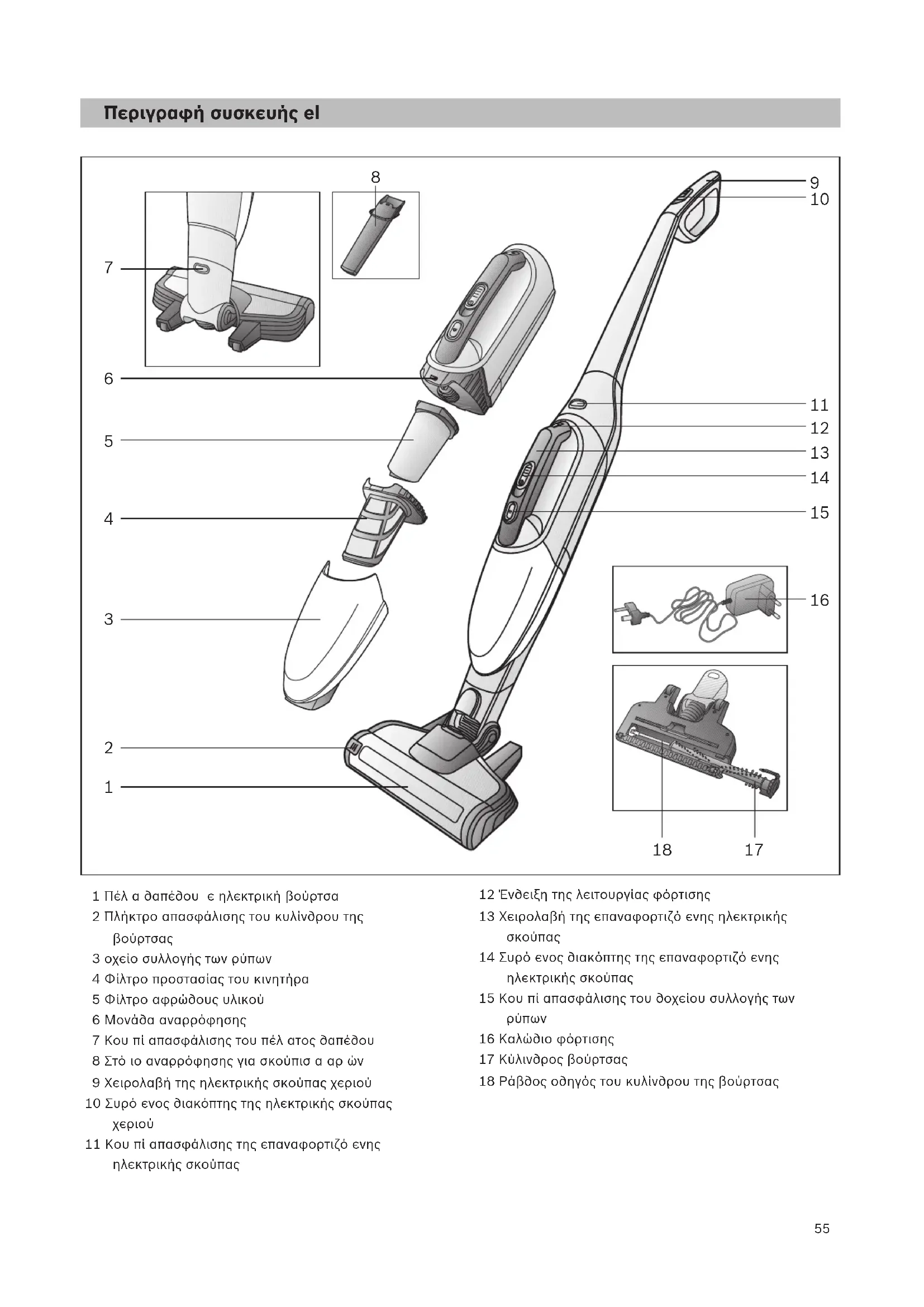 3 οχείο συλλογής των ρύπων 4 Φίλτρο προστασίας του κινητήρα 5 Φίλτρο αφρώδους υλικού 6 Μονάδα αναρρόφησης 7 Κου πί απασφάλισης του πέλ ατος δαπέδου 8 Στό ιο αναρρόφησης για σκούπισ α αρ ών 9 Χειρολαβή της ηλεκτρικής σκούπας χεριού 10 Συρό ενος διακόπτης της ηλεκτρικής σκούπας