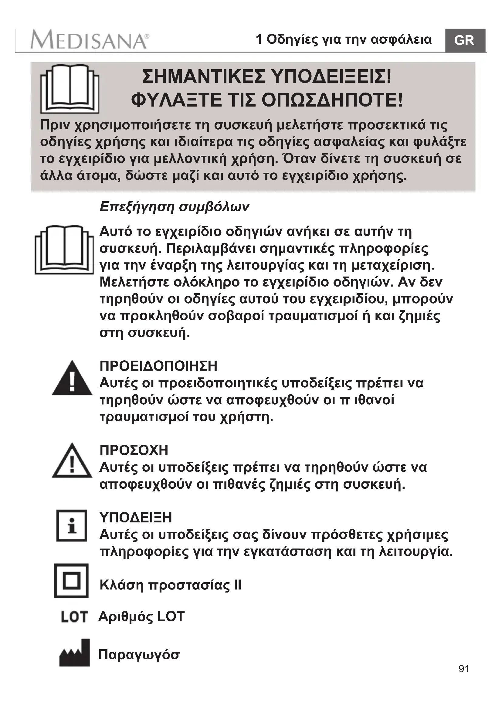 ΣΗΜΑΝΤΙΚΕΣ ΥΠΟΔΕΙΞΕΙΣ! ΦΥΛΑΞΤΕ ΤΙΣ ΟΠΩΣΔΗΠΟΤΕ! Πριν χρησιμοποιήσετε τη συσκευή μελετήστε προσεκτικά τις οδηγίες χρήσης και ιδιαίτερα τις οδηγίες ασφαλείας και φυλάξτε το εγχειρίδιο για μελλοντική χρήση. Όταν δίνετε τη συσκευή σε άλλα άτομα, δώστε μαζί και αυτό το εγχειρίδιο χρήσης. Επεξήγηση συμβόλων Αυτό το εγχειρίδιο οδηγιών ανήκει σε αυτήν τη συσκευή. Περιλαμβάνει σημαντικές πληροφορίες για την έναρξη της λειτουργίας και τη μεταχείριση. Μελετήστε ολόκληρο το εγχειρίδιο οδηγιών. Αν δεν τηρηθούν οι οδηγίες αυτού του εγχειριδίου, μπορούν να προκληθούν σοβαροί τραυματισμοί ή και ζημιές στη συσκευή. ΠΡΟΕΙΔΟΠΟΙΗΣΗ Αυτές οι προειδοποιητικές υποδείξεις πρέπει να τηρηθούν ώστε να αποφευχθούν οι π ιθανοί τραυματισμοί του χρήστη.