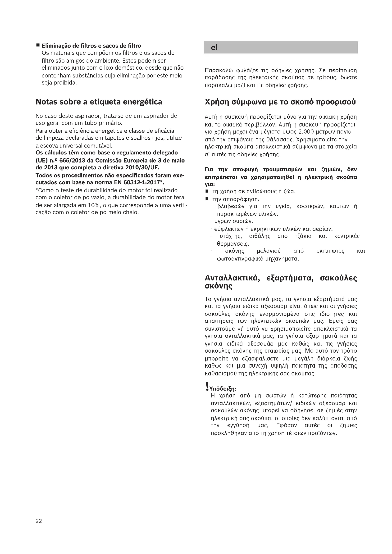 Τα γνήσια ανταλλακτικά μας, τα γνήσια εξαρτήματά μας και τα γνήσια ειδικά αξεσουάρ είναι όπως και οι γνήσιες σακούλες σκόνης εναρμονισμένα στις ιδιότητες και απαιτήσεις των ηλεκτρικών σκουπών μας. Εμείς σας συνιστούμε γι’ αυτό να χρησιμοποιείτε αποκλειστικά τα γνήσια ανταλλακτικά μας, τα γνήσια εξαρτήματά και τα γνήσια ειδικά αξεσουάρ μας καθώς και τις γνήσιες σακούλες σκόνης της εταιρείας μας. Με αυτό τον τρόπο μπορείτε να εξασφαλίσετε μια μεγάλη διάρκεια ζωής καθώς και μια συνεχή υψηλή ποιότητα της απόδοσης καθαρισμού της ηλεκτρικής σας σκούπας.