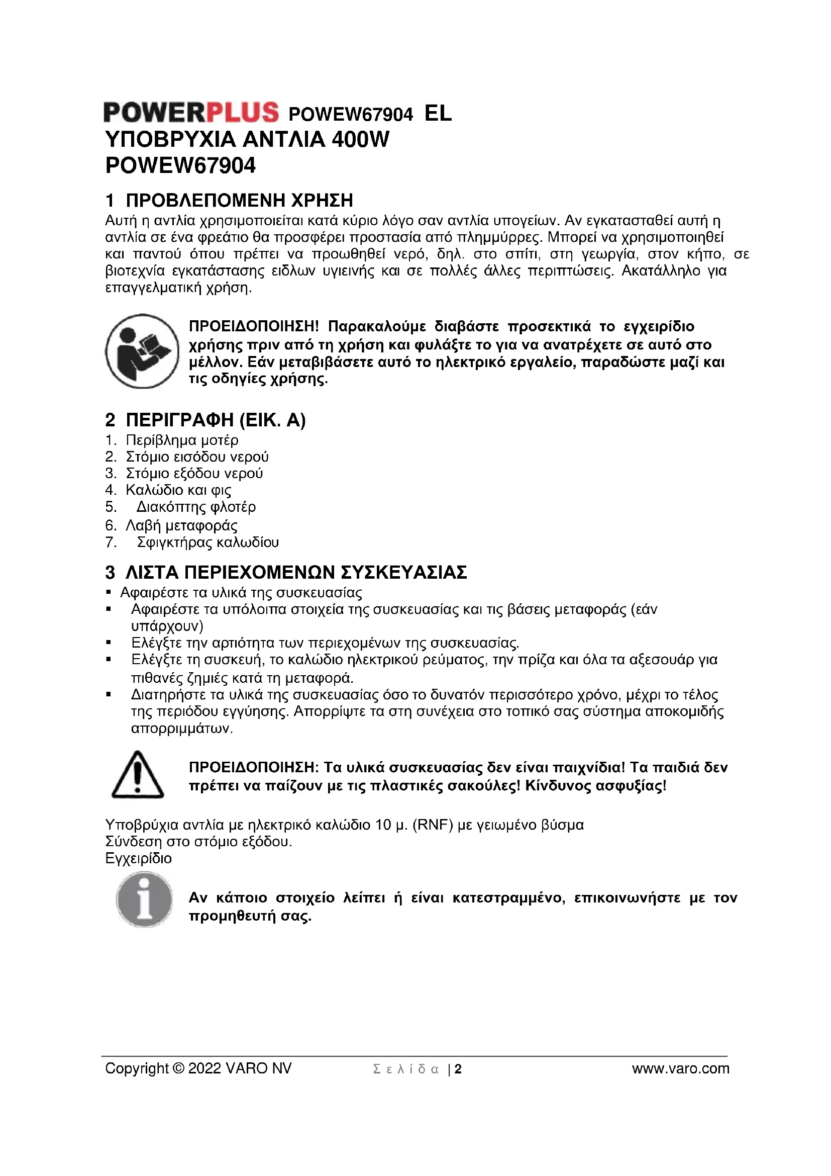 - 16 ΔΗΛΩΣΗ ΣΥΜΜΟΡΦΩΣΗΣ POWEW67904 EL Copyright © 2022 VARO NV Σ ε λ ί δ α | 2 www.varo.com ΥΠΟΒΡΥΧΙΑ ΑΝΤΛΙΑ 400W POWEW67904 1 ΠΡΟΒΛΕΠΟΜΕΝΗ ΧΡΗΣΗ Αυτή η αντλία χρησιμοποιείται κατά κύριο λόγο σαν αντλία υπογείων. Αν εγκατασταθεί αυτή η αντλία σε ένα φρεάτιο θα προσφέρει προστασία από πλημμύρρες. Μπορεί να χρησιμοποιηθεί και παντού όπου πρέπει να προωθηθεί νερό, δηλ. στο σπίτι, στη γεωργία, στον κήπο, σε βιοτεχνία εγκατάστασης ειδλων υγιεινής και σε πολλές άλλες περιπτώσεις. Ακατάλληλο για επαγγελματική χρήση. ΠΡΟΕΙΔΟΠΟΙΗΣΗ! Παρακαλούμε διαβάστε προσεκτικά το εγχειρίδιο χρήσης πριν από τη χρήση και φυλάξτε το για να ανατρέχετε σε αυτό στο μέλλον. Εάν μεταβιβάσετε αυτό το ηλεκτρικό εργαλείο, παραδώστε μαζί και τις οδηγίες χρήσης. 2 ΠΕΡΙΓΡΑΦΗ (ΕΙΚ. A) p. 8