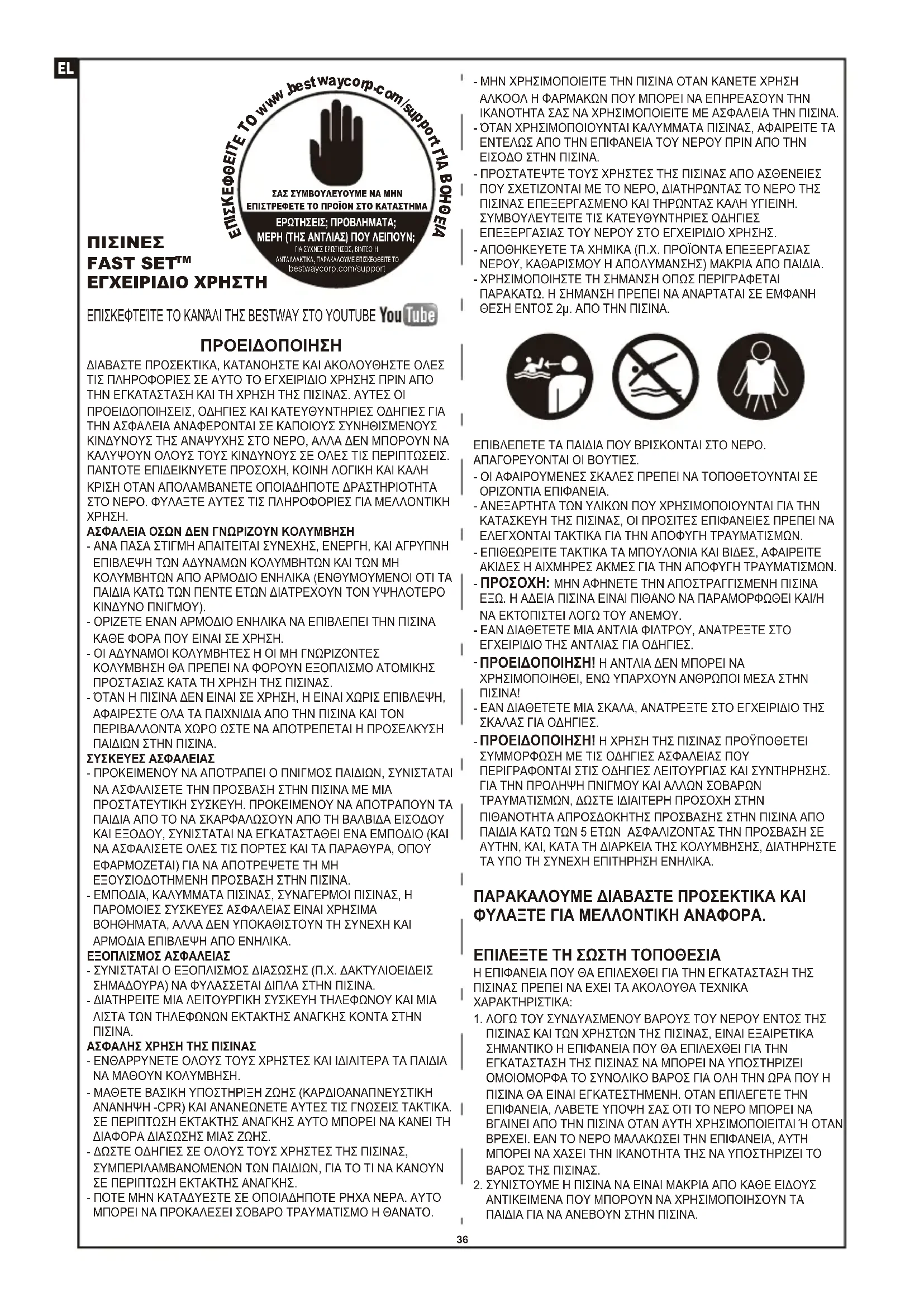 ΑΣΦΑΛΗΣ ΧΡΗΣΗ ΤΗΣ ΠΙΣΙΝΑΣ - ΕΝΘΑΡΡΥΝΕΤΕ ΟΛΟΥΣ ΤΟΥΣ ΧΡΗΣΤΕΣ ΚΑΙ ΙΔΙΑΙΤΕΡΑ ΤΑ ΠΑΙΔΙΑ ΝΑ ΜΑΘΟΥΝ ΚΟΛΥΜΒΗΣΗ. - ΜΑΘΕΤΕ ΒΑΣΙΚΗ ΥΠΟΣΤΗΡΙΞΗ ΖΩΗΣ (ΚΑΡΔΙΟΑΝΑΠΝΕΥΣΤΙΚΗ ΑΝΑΝΗΨΗ -CPR) ΚΑΙ ΑΝΑΝΕΩΝΕΤΕ ΑΥΤΕΣ ΤΙΣ ΓΝΩΣΕΙΣ ΤΑΚΤΙΚΑ. ΣΕ ΠΕΡΙΠΤΩΣΗ ΕΚΤΑΚΤΗΣ ΑΝΑΓΚΗΣ ΑΥΤΟ ΜΠΟΡΕΙ ΝΑ ΚΑΝΕΙ ΤΗ ΔΙΑΦΟΡΑ ΔΙΑΣΩΣΗΣ ΜΙΑΣ ΖΩΗΣ. - ΔΩΣΤΕ ΟΔΗΓΙΕΣ ΣΕ ΟΛΟΥΣ ΤΟΥΣ ΧΡΗΣΤΕΣ ΤΗΣ ΠΙΣΙΝΑΣ, ΣΥΜΠΕΡΙΛΑΜΒΑΝΟΜΕΝΩΝ ΤΩΝ ΠΑΙΔΙΩΝ, ΓΙΑ ΤΟ ΤΙ ΝΑ ΚΑΝΟΥΝ ΣΕ ΠΕΡΙΠΤΩΣΗ ΕΚΤΑΚΤΗΣ ΑΝΑΓΚΗΣ. - ΠΟΤΕ ΜΗΝ ΚΑΤΑΔΥΕΣΤΕ ΣΕ ΟΠΟΙΑΔΗΠΟΤΕ ΡΗΧΑ ΝΕΡΑ. ΑΥΤΟ ΜΠΟΡΕΙ ΝΑ ΠΡΟΚΑΛΕΣΕΙ ΣΟΒΑΡΟ ΤΡΑΥΜΑΤΙΣΜΟ Η ΘΑΝΑΤΟ. - ΜΗΝ ΧΡΗΣΙΜΟΠΟΙΕΙΤΕ ΤΗΝ ΠΙΣΙΝΑ ΟΤΑΝ ΚΑΝΕΤΕ ΧΡΗΣΗ ΑΛΚΟΟΛ Η ΦΑΡΜΑΚΩΝ ΠΟΥ ΜΠΟΡΕΙ ΝΑ ΕΠΗΡΕΑΣΟΥΝ ΤΗΝ ΙΚΑΝΟΤΗΤΑ ΣΑΣ ΝΑ ΧΡΗΣΙΜΟΠΟΙΕΙΤΕ ΜΕ ΑΣΦΑΛΕΙΑ ΤΗΝ ΠΙΣΙΝΑ. - ΌΤΑΝ ΧΡΗΣΙΜΟΠΟΙΟΥΝΤΑΙ ΚΑΛΥΜΜΑΤΑ ΠΙΣΙΝΑΣ, ΑΦΑΙΡΕΙΤΕ ΤΑ ΕΝΤΕΛΩΣ ΑΠΟ ΤΗΝ ΕΠΙΦΑΝΕΙΑ ΤΟΥ ΝΕΡΟΥ ΠΡΙΝ ΑΠΟ ΤΗΝ ΕΙΣΟΔΟ ΣΤΗΝ ΠΙΣΙΝΑ. - ΠΡΟΣΤΑΤΕΨΤΕ ΤΟΥΣ ΧΡΗΣΤΕΣ ΤΗΣ ΠΙΣΙΝΑΣ ΑΠΟ ΑΣΘΕΝΕΙΕΣ ΠΟΥ ΣΧΕΤΙΖΟΝΤΑΙ ΜΕ ΤΟ ΝΕΡΟ, ΔΙΑΤΗΡΩΝΤΑΣ ΤΟ ΝΕΡΟ ΤΗΣ ΠΙΣΙΝΑΣ ΕΠΕΞΕΡΓΑΣΜΕΝΟ ΚΑΙ ΤΗΡΩΝΤΑΣ ΚΑΛΗ ΥΓΙΕΙΝΗ. ΣΥΜΒΟΥΛΕΥΤΕΙΤΕ ΤΙΣ ΚΑΤΕΥΘΥΝΤΗΡΙΕΣ ΟΔΗΓΙΕΣ ΕΠΕΞΕΡΓΑΣΙΑΣ ΤΟΥ ΝΕΡΟΥ ΣΤΟ ΕΓΧΕΙΡΙΔΙΟ ΧΡΗΣΗΣ. - ΑΠΟΘΗΚΕΥΕΤΕ ΤΑ ΧΗΜΙΚΑ (Π.Χ. ΠΡΟΪΟΝΤΑ ΕΠΕΞΕΡΓΑΣΙΑΣ ΝΕΡΟΥ, ΚΑΘΑΡΙΣΜΟΥ Η ΑΠΟΛΥΜΑΝΣΗΣ) ΜΑΚΡΙΑ ΑΠΟ ΠΑΙΔΙΑ. - ΧΡΗΣΙΜΟΠΟΙΗΣΤΕ ΤΗ ΣΗΜΑΝΣΗ ΟΠΩΣ ΠΕΡΙΓΡΑΦΕΤΑΙ ΠΑΡΑΚΑΤΩ. Η ΣΗΜΑΝΣΗ ΠΡΕΠΕΙ ΝΑ ΑΝΑΡΤΑΤΑΙ ΣΕ ΕΜΦΑΝΗ ΘΕΣΗ ΕΝΤΟΣ 2μ. ΑΠΟ ΤΗΝ ΠΙΣΙΝΑ. ΕΠΙΒΛΕΠΕΤΕ ΤΑ ΠΑΙΔΙΑ ΠΟΥ ΒΡΙΣΚΟΝΤΑΙ ΣΤΟ ΝΕΡΟ. ΑΠΑΓΟΡΕΥΟΝΤΑΙ ΟΙ ΒΟΥΤΙΕΣ. - ΟΙ ΑΦΑΙΡΟΥΜΕΝΕΣ ΣΚΑΛΕΣ ΠΡΕΠΕΙ ΝΑ ΤΟΠΟΘΕΤΟΥΝΤΑΙ ΣΕ ΟΡΙΖΟΝΤΙΑ ΕΠΙΦΑΝΕΙΑ. - ΑΝΕΞΑΡΤΗΤΑ ΤΩΝ ΥΛΙΚΩΝ ΠΟΥ ΧΡΗΣΙΜΟΠΟΙΟΥΝΤΑΙ ΓΙΑ ΤΗΝ ΚΑΤΑΣΚΕΥΗ ΤΗΣ ΠΙΣΙΝΑΣ, ΟΙ ΠΡΟΣΙΤΕΣ ΕΠΙΦΑΝΕΙΕΣ ΠΡΕΠΕΙ ΝΑ ΕΛΕΓΧΟΝΤΑΙ ΤΑΚΤΙΚΑ ΓΙΑ ΤΗΝ ΑΠΟΦΥΓΗ ΤΡΑΥΜΑΤΙΣΜΩΝ. - ΕΠΙΘΕΩΡΕΙΤΕ ΤΑΚΤΙΚΑ ΤΑ ΜΠΟΥΛΟΝΙΑ ΚΑΙ ΒΙΔΕΣ, ΑΦΑΙΡΕΙΤΕ ΑΚΙΔΕΣ Η ΑΙΧΜΗΡΕΣ ΑΚΜΕΣ ΓΙΑ ΤΗΝ ΑΠΟΦΥΓΗ ΤΡΑΥΜΑΤΙΣΜΩΝ. - ΠΡΟΣΟΧΗ: ΜΗΝ ΑΦΗΝΕΤΕ ΤΗΝ ΑΠΟΣΤΡΑΓΓΙΣΜΕΝΗ ΠΙΣΙΝΑ ΕΞΩ. Η ΑΔΕΙΑ ΠΙΣΙΝΑ ΕΙΝΑΙ ΠΙΘΑΝΟ ΝΑ ΠΑΡΑΜΟΡΦΩΘΕΙ ΚΑΙ/Η ΝΑ ΕΚΤΟΠΙΣΤΕΙ ΛΟΓΩ ΤΟΥ ΑΝΕΜΟΥ. - ΕΑΝ ΔΙΑΘΕΤΕΤΕ ΜΙΑ ΑΝΤΛΙΑ ΦΙΛΤΡΟΥ, ΑΝΑΤΡΕΞΤΕ ΣΤΟ ΕΓΧΕΙΡΙΔΙΟ ΤΗΣ ΑΝΤΛΙΑΣ ΓΙΑ ΟΔΗΓΙΕΣ.