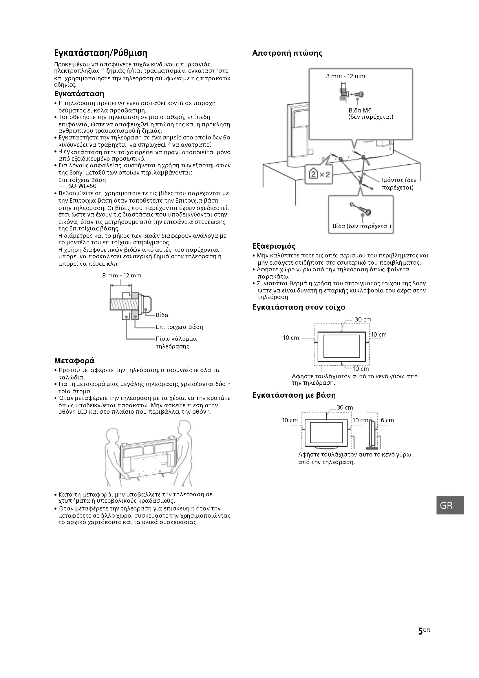 Εγκατάσταση της τηλεόρασης στον τοίχο Το εγχειρίδιο οδηγιών αυτής της τηλεόρασης παρουσιάζει μόνο τα βήματα για την προετοιμασία της εγκατάστασης της τηλεόρασης πριν από την εγκατάσταση στον τοίχο. Προς τους πελάτες: Για λόγους προστασίας και ασφάλειας του προϊόντος, η Sony συνιστά ένθερμα η εγκατάσταση της τηλεόρασής σας να πραγματοποιείται από αντιπροσώπους της Sony ή εξουσιοδοτημένους τεχνικούς. Μην επιχειρήσετε να τη ν εγκαταστήσετε μόνοι σας. Προς τους αντιπροσώπους της Sony και τους τεχνικούς: Δώστε μεγάλη προσοχή στην ασφάλεια κατά την εγκατάσταση, την περιοδική συντήρηση και τον έλεγχο του προϊόντος αυτού. Χρησιμοποιήστε την Επιτοίχια βάση SU-WL450 (δεν παρέχεται), για να εγκαταστήσετε την τηλεόραση στον τοίχο. Κατά την εγκατάσταση της Επιτοίχιας βάσης, συμβουλευτείτε επίσης τις Οδη γίες Χρήσης και τον Οδηγό εγκατάστασης που συνοδεύουν την Επιτοίχια βάση.