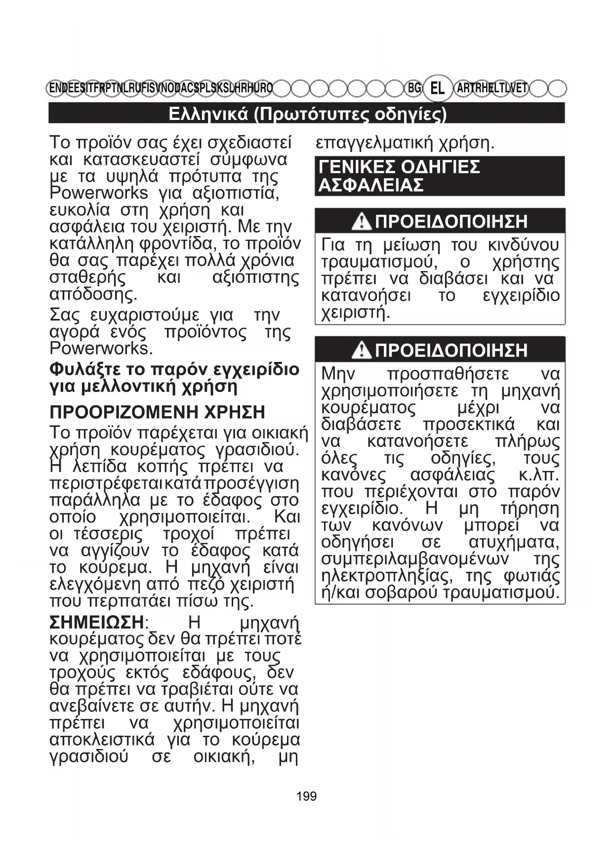 Σας ευχαριστούμε για την αγορά ενός προϊόντος της Powerworks. Φυλάξτε το παρόν εγχειρίδιο για μελλοντική χρήση ΠΡΟΟΡΙΖΟΜΕΝΗ ΧΡΗΣΗ Το προϊόν παρέχεται για οικιακή χρήση κουρέματος γρασιδιού. Η λεπίδα κοπής πρέπει να περιστρέφεται κατά προσέγγιση παράλληλα με το έδαφος στο οποίο χρησιμοποιείται. Και οι τέσσερις τροχοί πρέπει να αγγίζουν το έδαφος κατά το κούρεμα. Η μηχανή είναι ελεγχόμενη από πεζό χειριστή που περπατάει πίσω της. ΣΗΜΕΙΩΣΗ: Η μηχανή κουρέματος δεν θα πρέπει ποτέ να χρησιμοποιείται με τους τροχούς εκτός εδάφους, δεν θα πρέπει να τραβιέται ούτε να ανεβαίνετε σε αυτήν. Η μηχανή πρέπει να χρησιμοποιείται αποκλειστικά για το κούρεμα γρασιδιού σε οικιακή, μη επαγγελματική χρήση. ΓΕΝΙΚΕΣ ΟΔΗΓΙΕΣ