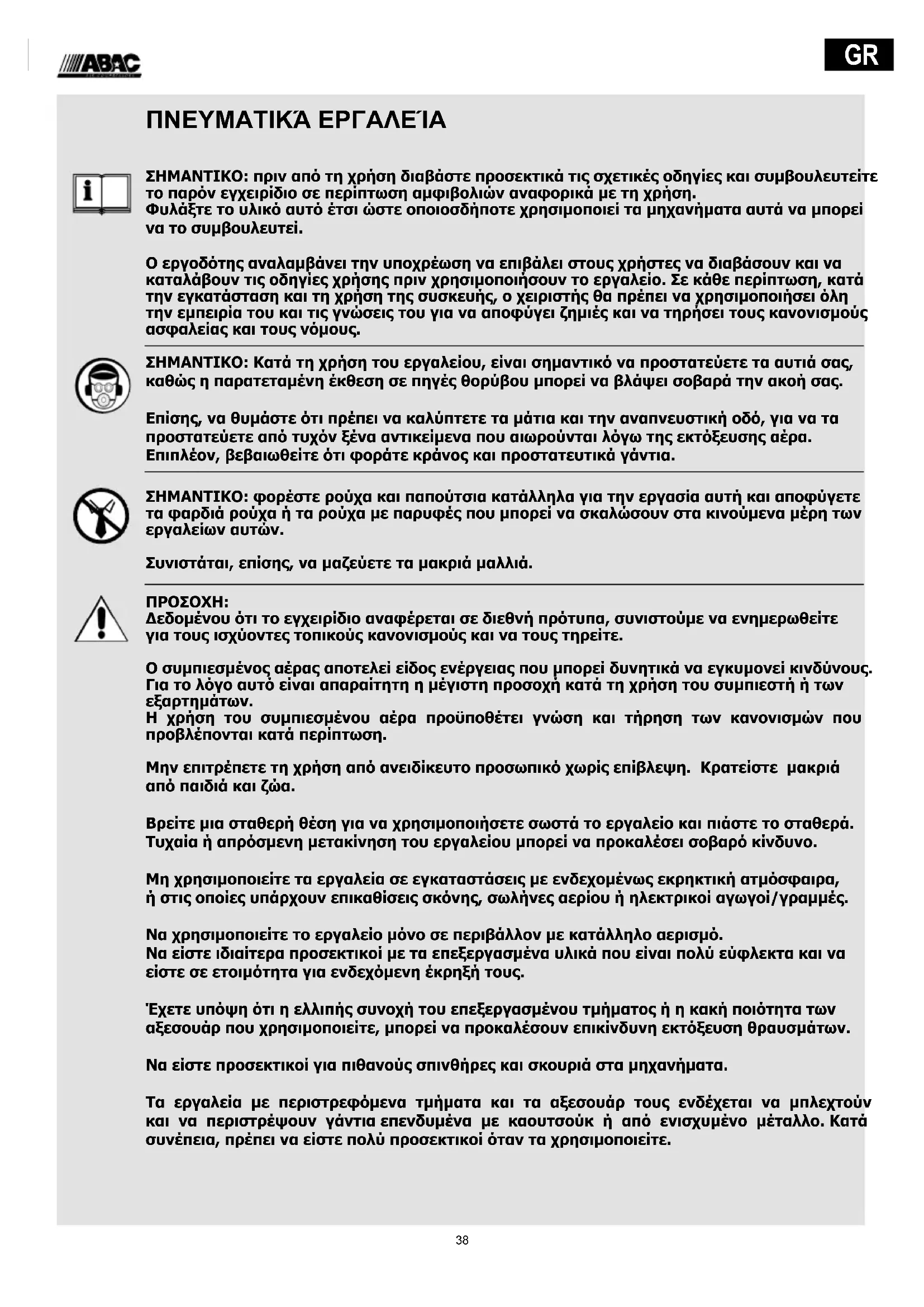 Δεδομένου ότι το εγχειρίδιο αναφέρεται σε διεθνή πρότυπα, συνιστούμε να ενημερωθείτε για τους ισχύοντες τοπικούς κανονισμούς και να τους τηρείτε. Ο συμπιεσμένος αέρας αποτελεί είδος ενέργειας που μπορεί δυνητικά να εγκυμονεί κινδύνους. Για το λόγο αυτό είναι απαραίτητη η μέγιστη προσοχή κατά τη χρήση του συμπιεστή ή των εξαρτημάτων. Η χρήση του συμπιεσμένου αέρα προϋποθέτει γνώση και τήρηση των κανονισμών που προβλέπονται κατά περίπτωση. Μην επιτρέπετε τη χρήση από ανειδίκευτο προσωπικό χωρίς επίβλεψη. Κρατείστε μακριά από παιδιά και ζώα. Βρείτε μια σταθερή θέση για να χρησιμοποιήσετε σωστά το εργαλείο και πιάστε το σταθερά. Τυχαία ή απρόσμενη μετακίνηση του εργαλείου μπορεί να προκαλέσει σοβαρό κίνδυνο. Μη χρησιμοποιείτε τα εργαλεία σε εγκαταστάσεις με ενδεχομένως εκρηκτική ατμόσφαιρα, ή στις οποίες υπάρχουν επικαθίσεις σκόνης, σωλήνες αερίου ή ηλεκτρικοί αγωγοί/γραμμές. Να χρησιμοποιείτε το εργαλείο μόνο σε περιβάλλον με κατάλληλο αερισμό. Να είστε ιδιαίτερα προσεκτικοί με τα επεξεργασμένα υλικά που είναι πολύ εύφλεκτα και να είστε σε ετοιμότητα για ενδεχόμενη έκρηξή τους. Έχετε υπόψη ότι η ελλιπής συνοχή του επεξεργασμένου τμήματος ή η κακή ποιότητα των αξεσουάρ που χρησιμοποιείτε, μπορεί να προκαλέσουν επικίνδυνη εκτόξευση θραυσμάτων. Να είστε προσεκτικοί για πιθανούς σπινθήρες και σκουριά στα μηχανήματα. Τα εργαλεία με περιστρεφόμενα τμήματα και τα αξεσουάρ τους ενδέχεται να μπλεχτούν και να περιστρέψουν γάντια επενδυμένα με καουτσούκ ή από ενισχυμένο μέταλλο. Κατά συνέπεια, πρέπει να είστε πολύ προσεκτικοί όταν τα χρησιμοποιείτε.39