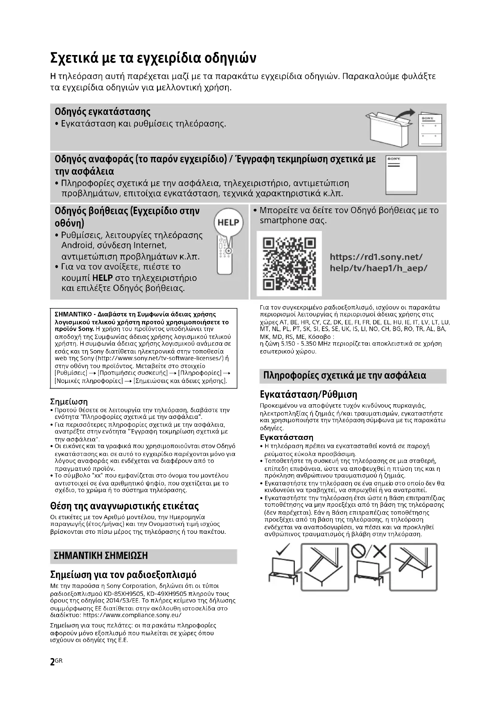 Με την παρούσα η Sony Corporation, δηλώνει ότι οι τύποι ραδιοεξοπλισμού KD-85XH9505, KD-49XH9505 πληρούν τους όρους της οδηγίας 2014/53/ΕΕ. Το πλήρες κείμενο της δήλωσης συμμόρφωσης ΕΕ διατίθεται στην ακόλουθη ιστοσελίδα στο διαδίκτυο: https://www.compliance.sony.eu/ Σημείωση για τους πελάτες: οι πα ρακάτω πληροφορίες αφορούν μόνο εξοπλισμό που πωλείται σε χώρες όπου ισχύουν οι οδηγίες της Ε.Ε. Για τον συγκεκριμένο ραδιοεξοπλισμό, ισ χύουν οι παρακάτω περιορισμοί λειτουργίας ή περιορισμοί άδειας χρήσης στις χώρες AT, BE, HR, CY, CZ, DK, EE, FI, FR, DE, EL, HU, IE, IT, LV, LT, LU, MT, NL, PL, PT, SK, SI, ES, SE, UK, IS, LI, NO, CH, BG, RO, TR, AL, BA, MK, MD, RS, ME, Κόσοβο :η ζών η 5.150 - 5.350 MHz περιορίζε ται αποκλειστικά σε χρήση εσωτερικού χώρου. Πληροφορίες σχετικά με την ασφάλεια Εγκατάσταση/Ρύθμιση Προκειμένου να αποφύγετε τυχόν κινδύνους πυρκαγιάς, ηλεκτροπληξίας ή ζημιάς ή/και τραυματισμών, εγκαταστήστε και χρησιμοποιήστε την τηλεόραση σύμφωνα με τις παρακάτω Εγκατάσταση