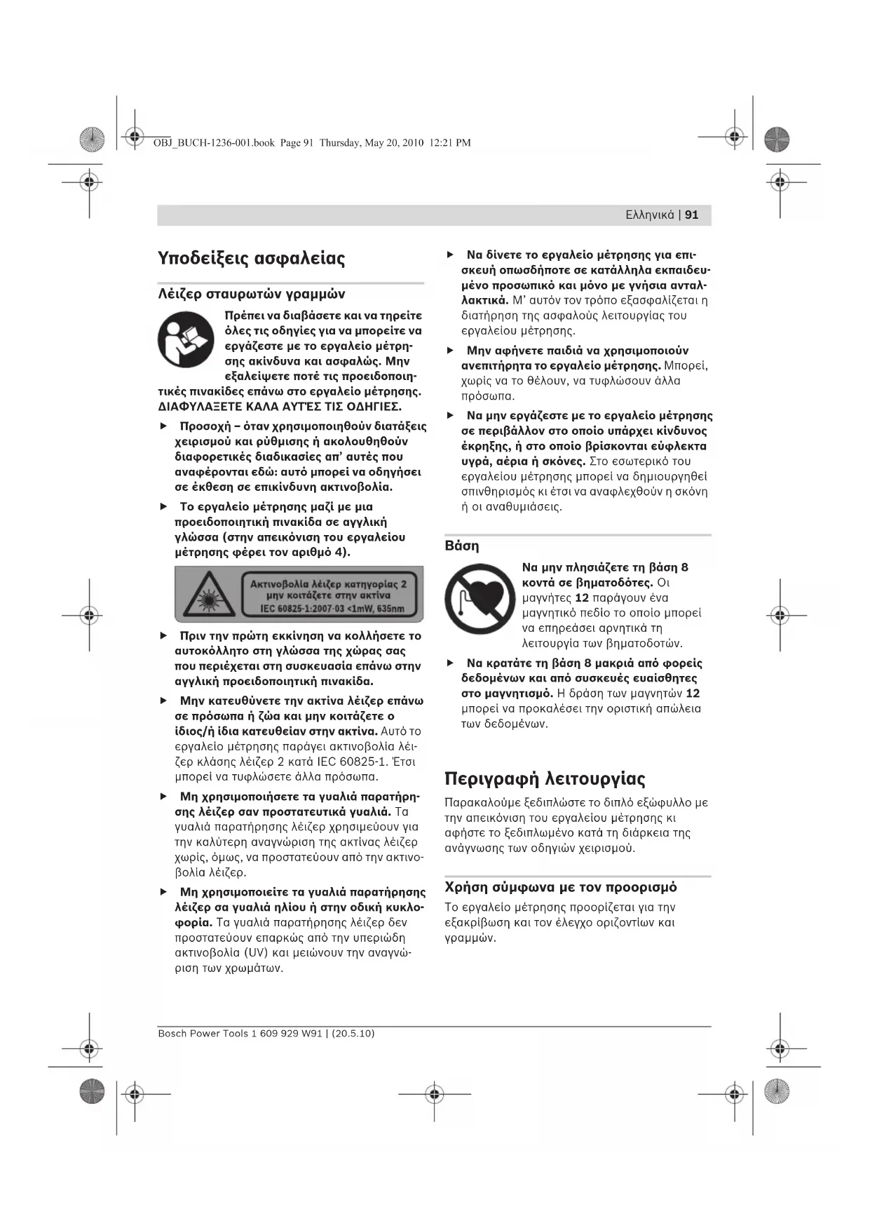 Τα εργαλεία μέτρησης, τα εξαρτήματα και οι συσκευασίες πρέπει να ανακυκλώνονται με τρόπο φιλικό προς το περιβάλλον. Μόνο για χώρες της ΕΕ: Μη ρίχνετε τα εργαλεία μέτρησης στα απορρίμματα του σπιτιού σας! Σύμφωνα με την Κοινοτική Οδηγία 2002/96/EΚ περί παλαιών ηλεκτρι- κών και ηλεκτρονικών συσκευών και με τη μεταφορά της σε εθνικό δίκαιο δεν είναι πλέον απαραίτητο, τα άχρηστα εργαλεία μέτρησης να συλλέγονται ξεχωριστά και να ανακυκλώνονται με τρόπο φιλικό προς το περιβάλλον. Μπαταρίες/Επαναφορτιζόμενες μπαταρίες: Να μην ρίχνετε τις μπαταρίες στα απορρίμματα του σπιτιού σας, στη φωτιά ή στο νερό. Οι μπατα- ρίες πρέπει, κατά το δυνατό εκφορτισμένες, να συλλέγονται, να ανακυκλώνονται ή να αποσύρο- νται με τρόπο φιλικό προς το περιβάλλον. Μόνο για χώρες της ΕΕ: Σύμφωνα με την Οδηγία 2006/66/EΚ οι χαλασ- μένες ή αναλωμένες μπαταρίες/οι επαναφορτι- ζόμενες μπαταρίες πρέπει να ανακυκλώνονται. Τηρούμε το δικαίωμα αλλαγών. OBJ_BUCH-1236-001.book Page 98 Thursday, May 20, 2010 12:21 PMTürkçe | 99 Bosch Power Tools 1 609 929 W91 | (20.5.10)