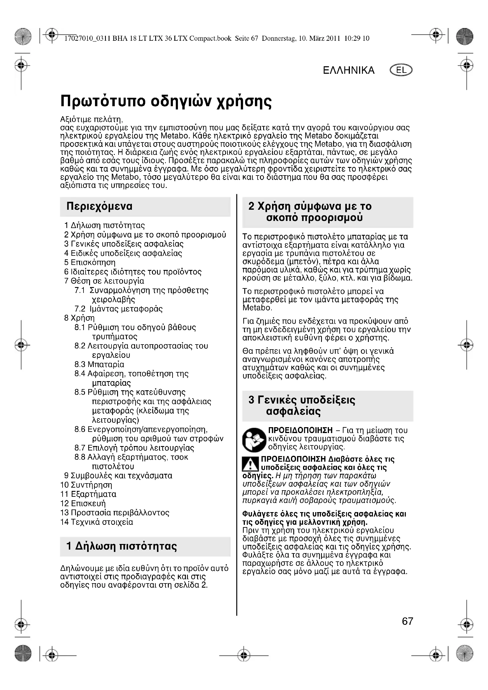 9 Συμβουλές και τεχνάσματα 10 Συντήρηση 11 Εξαρτήματα 12 Επισκευή 13 Προστασία περιβάλλοντος 14 Τεχνικά στοιχεία Δηλώνουμε με ιδία ευθύνη τι το προϊν αυτ αντιστοιχεί στις προδιαγραφές και στις οδηγίες που αναφέρονται στη σελίδα 2. Το περιστροφικ πιστολέτο μπαταρίας με τα αντίστοιχα εξαρτήματα είναι κατάλληλο για εργασία με τρυπάνια πιστολέτου σε σκυρδεμα (μπετν), πέτρα και άλλα παρμοια υλικά, καθώς και για τρύπημα χωρίς κρούση σε μέταλλο, ξύλο, κτλ. και για βίδωμα. Το περιστροφικ πιστολέτο μπορεί να μεταφερθεί με τον ιμάντα μεταφοράς της Metabo. Για ζημιές που ενδέχεται να προκύψουν απ τη μη ενδεδειγμένη χρήση του εργαλείου την αποκλειστική ευθύνη φέρει ο χρήστης. Θα πρέπει να ληφθούν υπ’ ψη οι γενικά αναγνωρισμένοι καννες αποτροπής ατυχημάτων καθώς και οι συνημμένες υποδείξεις ασφαλείας. ΠΡΟΕΙΔΟΠΟΙΗΣΗ – Για τη μείωση του κινδύνου τραυματισμού διαβάστε τις οδηγίες λειτουργίας. ΠΡΟΕΙΔΟΠΟΙΗΣΗ Διαβάστε λες τις υποδείξεις ασφαλείας και λες τις