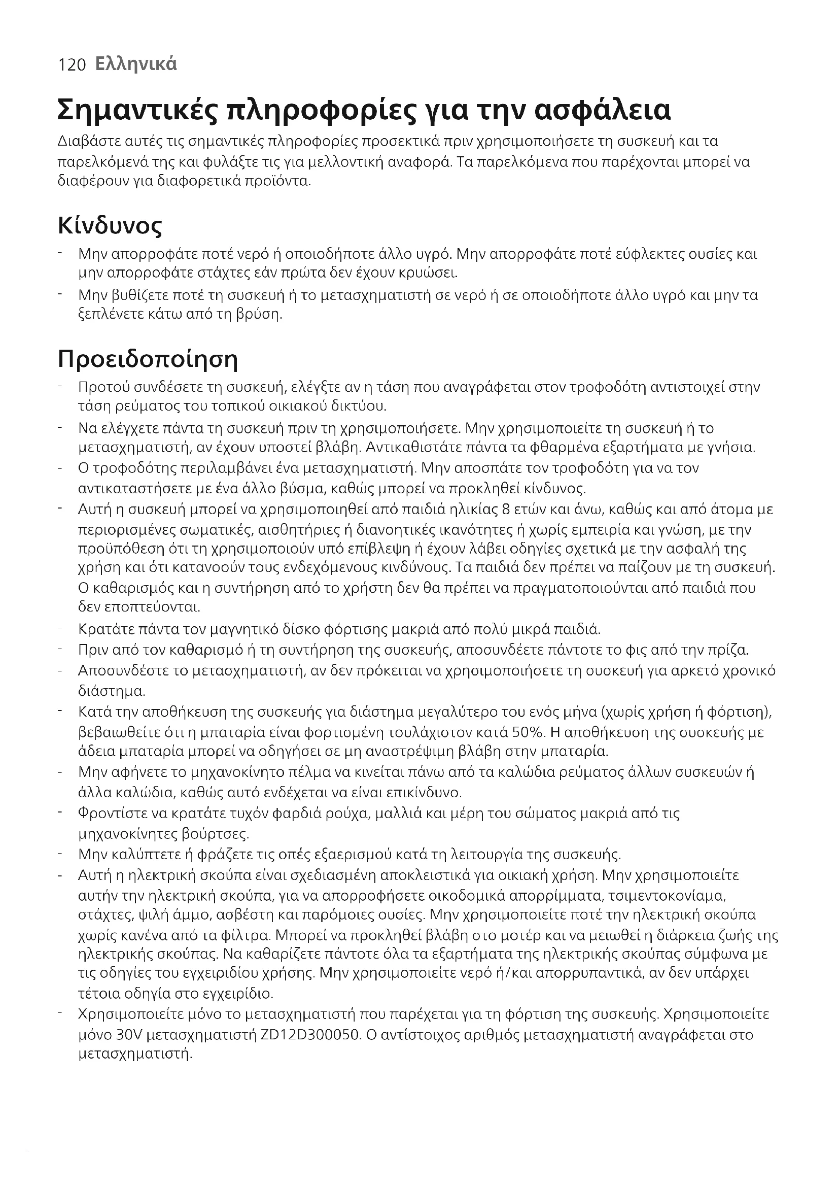 Χρησιμοποιείτε μόνο το μετασχηματιστή που παρέχεται για τη φόρτιση της συσκευής. Χρησιμοποιείτε μόνο 30V μετασχηματιστή ZD12D300050. Ο αντίστοιχος αριθμός μετασχηματιστή αναγράφεται στο μετασχηματιστή.121