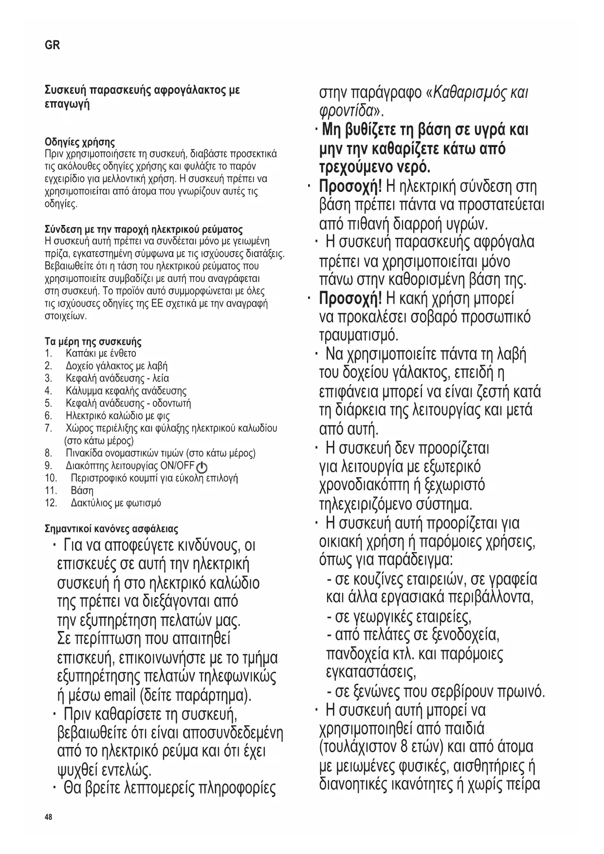 ∙ Μη βυθίζετε τη βάση σε υγρά και μην την καθαρίζετε κάτω από τρεχούμενο νερό. ∙ Προσοχή!Ηηλεκτρικήσύνδεσηστη βάσηπρέπειπάνταναπροστατεύεται απόπιθανήδιαρροήυγρών. ∙ Ησυσκευήπαρασκευήςαφρόγαλα πρέπειναχρησιμοποιείταιμόνο πάνωστηνκαθορισμένηβάσητης. ∙ Προσοχή!Ηκακήχρήσημπορεί ναπροκαλέσεισοβαρόπροσωπικό τραυματισμό. ∙ Ναχρησιμοποιείτεπάντατηλαβή τουδοχείουγάλακτος,επειδήη επιφάνειαμπορείναείναιζεστήκατά τηδιάρκειατηςλειτουργίαςκαιμετά