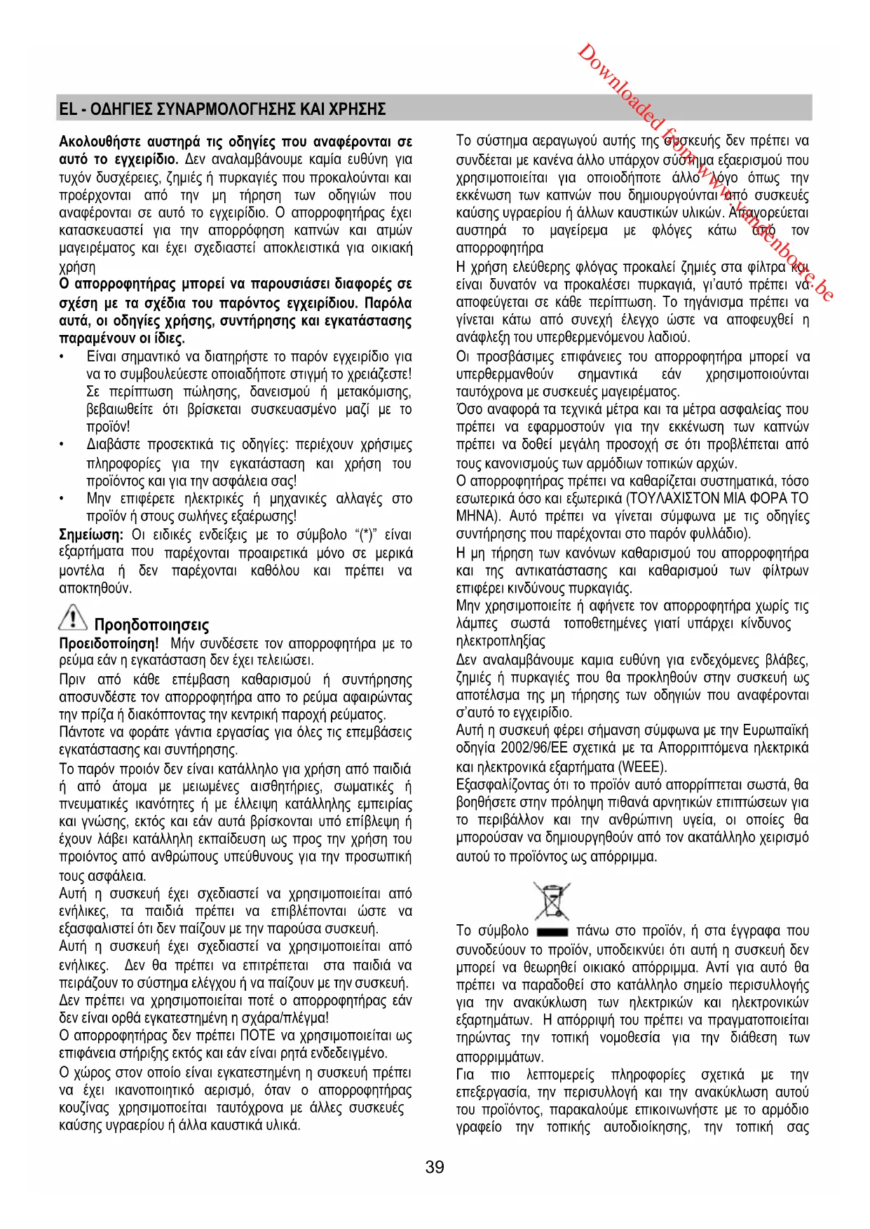 όσο και εξωτερικά (ΤΟΥΛΑΧΙΣΤΟΝ ΜΙΑ ΦΟΡΑ ΤΟ ΜΗΝΑ). Αυτό πρέπει να γίνεται σύμφωνα με τις οδηγίες συντήρησης που παρέχονται στο παρόν φυλλάδιο). Η μη τήρηση των κανόνων καθαρισμού του απορροφητήρα και της αντικατάστασης και καθαρισμού των φίλτρων επιφέρει κινδύνους πυρκαγιάς. Μην χρησιμοποιείτε ή αφήνετε τον απορροφητήρα χωρίς τις λάμπες σωστά τοποθετημένες γιατί υπάρχει κίνδυνος ηλεκτροπληξίας Δεν αναλαμβάνουμε καμια ευθύνη για ενδεχόμενες βλάβες, ζημιές ή πυρκαγιές που θα προκληθούν στην συσκευή ως αποτέλσμα της μη τήρησης των οδηγιών που αναφέρονται σ’αυτό το εγχειρίδιο. Αυτή η συσκευή φέρει σήμανση σύμφωνα με την Ευρωπαϊκή οδηγία 2002/96/ΕΕ σχετικά με τα Απορριπτόμενα ηλεκτρικά και ηλεκτρονικά εξαρτήματα (WEEE). Εξασφαλίζοντας ότι το προϊόν αυτό απορρίπτεται σωστά, θα βοηθήσετε στην πρόληψη πιθανά αρνητικών επιπτώσεων για το περιβάλλον και την ανθρώπινη υγεία, οι οποίες θα μπορούσαν να δημιουργηθούν από τον ακατάλληλο χειρισμό αυτού το προϊόντος ως απόρριμμα.