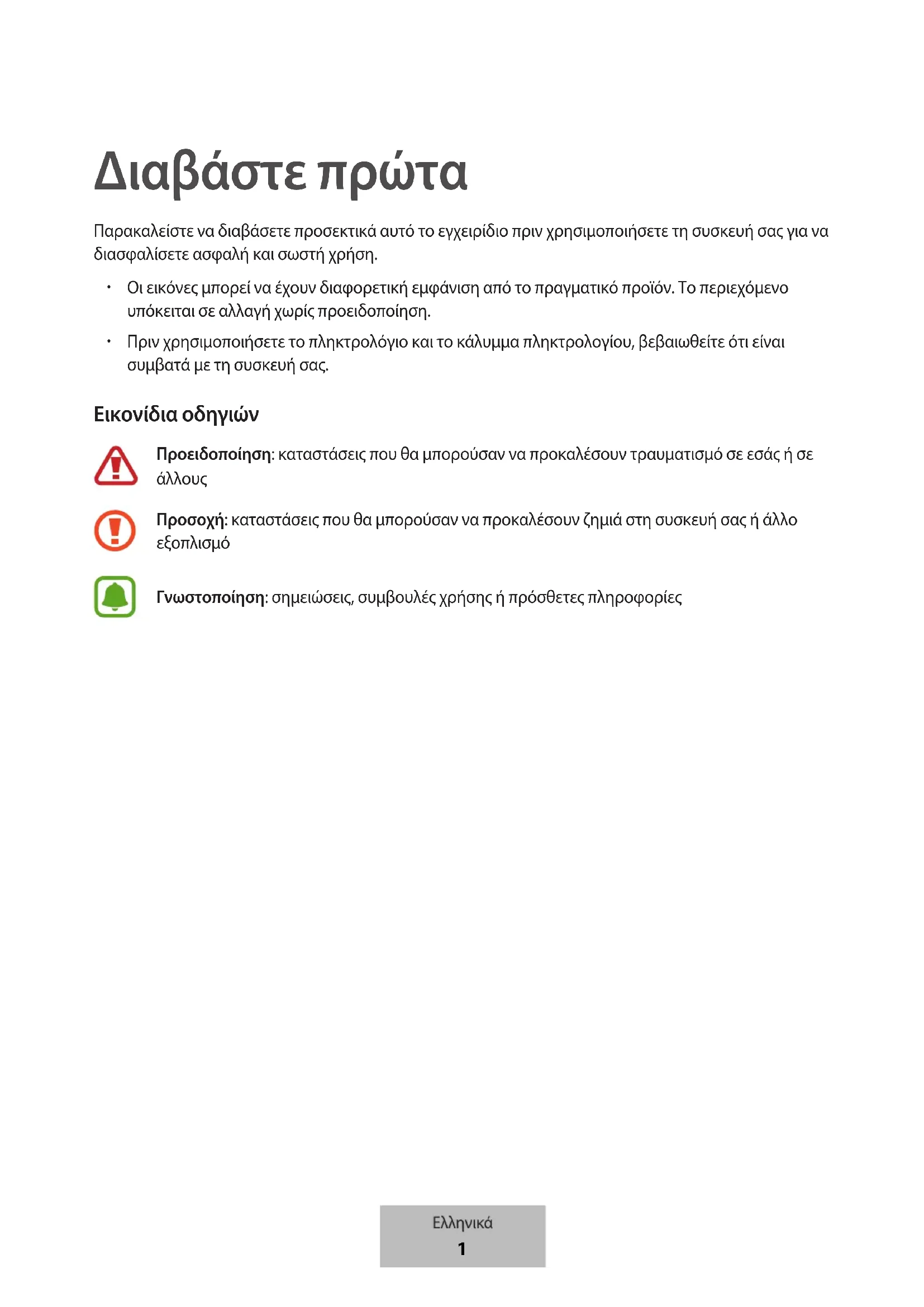 Διαβάστε πρώτα Παρακαλείστε να διαβάσετε προσεκτικά αυτό το εγχειρίδιο πριν χρησιμοποιήσετε τη συσκευή σας για να διασφαλίσετε ασφαλή και σωστή χρήση.