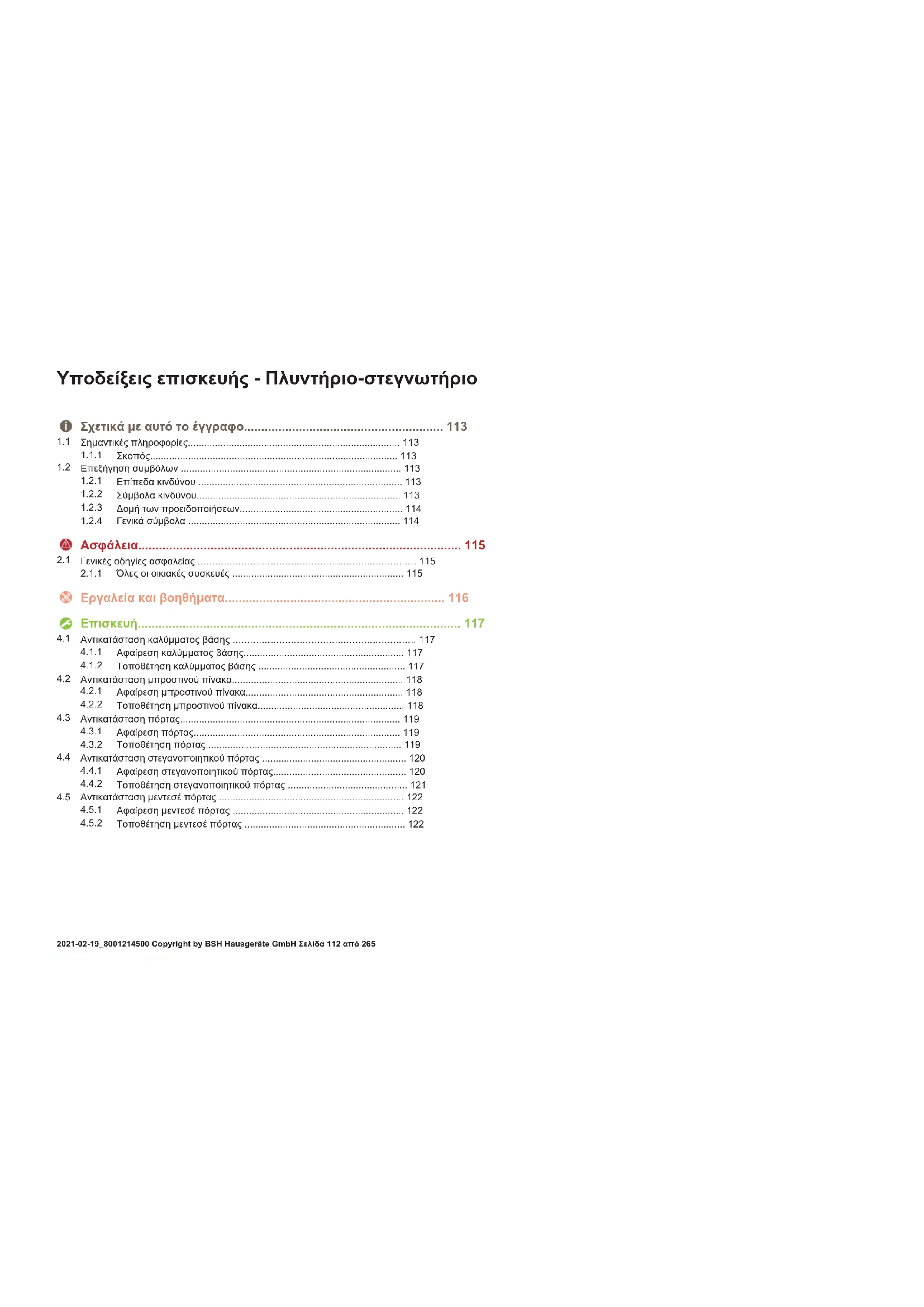 Ταυτοποίηση απαραίτητων εργαλείων Ταυτοποίηση απαραίτητων προϋποθέσεων Ταυτοποίηση μιας συνθήκης (αν ..., κατόπιν ...) Ταυτοποίηση αποτελέσματος Έναρξη Ταυτοποίηση ενός πλήκτρου ή κουμπιού [00123456] Ταυτοποίηση ενός κωδικού ανταλλακτικού Κατάσταση Ταυτοποίηση εμφανιζόμενου κειμένου/ παραθύρου (στην οθόνη της συσκευής) Πίνακας3: Γενικά σύμβολα Σχετικά με αυτό το έγγραφο 2021-02-19_8001214500 Copyright by BSH Hausgeräte GmbH Σελίδα114από265Ασφάλεια