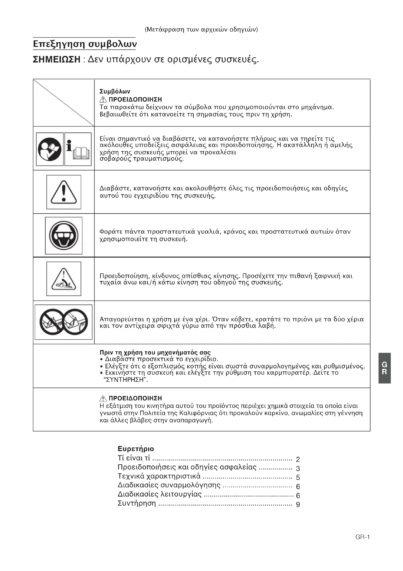 Τα παρακάτω δείχνουν τα σύμβολα που χρησιμοποιούνται στο μηχάνημα. Βεβαιωθείτε ότι κατανοείτε τη σημασίας τους πριν τη χρήση. Είναι σημαντικό να διαβάσετε, να κατανοήσετε πλήρως και να τηρείτε τις ακόλουθες υποδείξεις ασφάλειας και προειδοποίησης. Η ακατάλληλη ή αμελής χρήση της συσκευής μπορεί να προκαλέσει σοβαρούς τραυματισμούς. Διαβάστε, κατανοήστε και ακολουθήστε όλες τις προειδοποιήσεις και οδηγίες αυτού του εγχειριδίου της συσκευής. Φοράτε πάντα προστατευτικά γυαλιά, κράνος και προστατευτικά αυτιών όταν χρησιμοποιείτε τη συσκευή. Προειδοποίηση, κίνδυνος οπίσθιας κίνησης. Προσέχετε την πιθανή ξαφνική και τυχαία άνω και/ή κάτω κίνηση του οδηγού της συσκευής. Απαγορεύεται η χρήση με ένα χέρι. Όταν κόβετε, κρατάτε το πριόνι με τα δύο χέρια και τον αντίχειρα σφιχτά γύρω από την πρόσθια λαβή. ÓÊÏÕÉÙÓ½ÔÉÕÐÚÎÉÙÂϽÎÂÕ¿ØÔÂØ