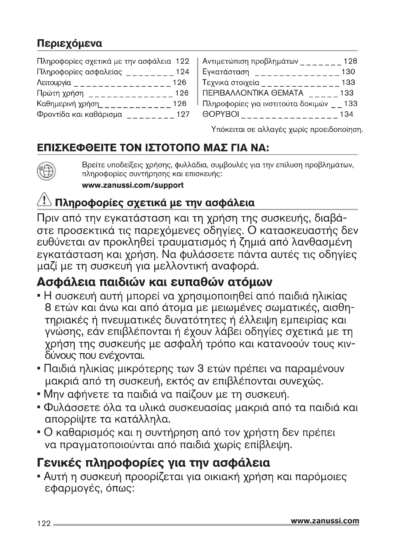 - Αυτή η συσκευή προορίζεται για οικιακή χρήση και παρόμοιες εφαρμογές, όπως: Πληροφορίες σχετικά με την ασφάλεια 122 Πληροφορίες ασφαλείας ________124 Λειτουργία ________________126 Πρώτη χρήση ______________126 Καθημερινή χρήση____________126 Φροντίδα και καθάρισμα ________127 Αντιμετώπιση προβλημάτων _______128 Εγκατάσταση ______________130 Τεχνικά στοιχεία _ _ _ _ _ _ _ _ _ _ _ _ _ 133 ΠΕΡΙΒΑΛΛΟΝΤΙΚΑ ΘΕΜΑΤΑ _____133 Πληροφορίες για ινστιτούτα δοκιμών __133 ΘΟΡΥΒΟΙ ________________134123 www.zanussi.com –Αγροικίες, χώρους κουζίνας προσωπικού σε καταστήματα, γρα- φεία και άλλα εργασιακά περιβάλλοντα, –Από πελάτες σε ξενοδοχεία, μοτέλ, πανσιόν (για ύπνο και πρωι- νό) και άλλα περιβάλλοντα στέγασης.