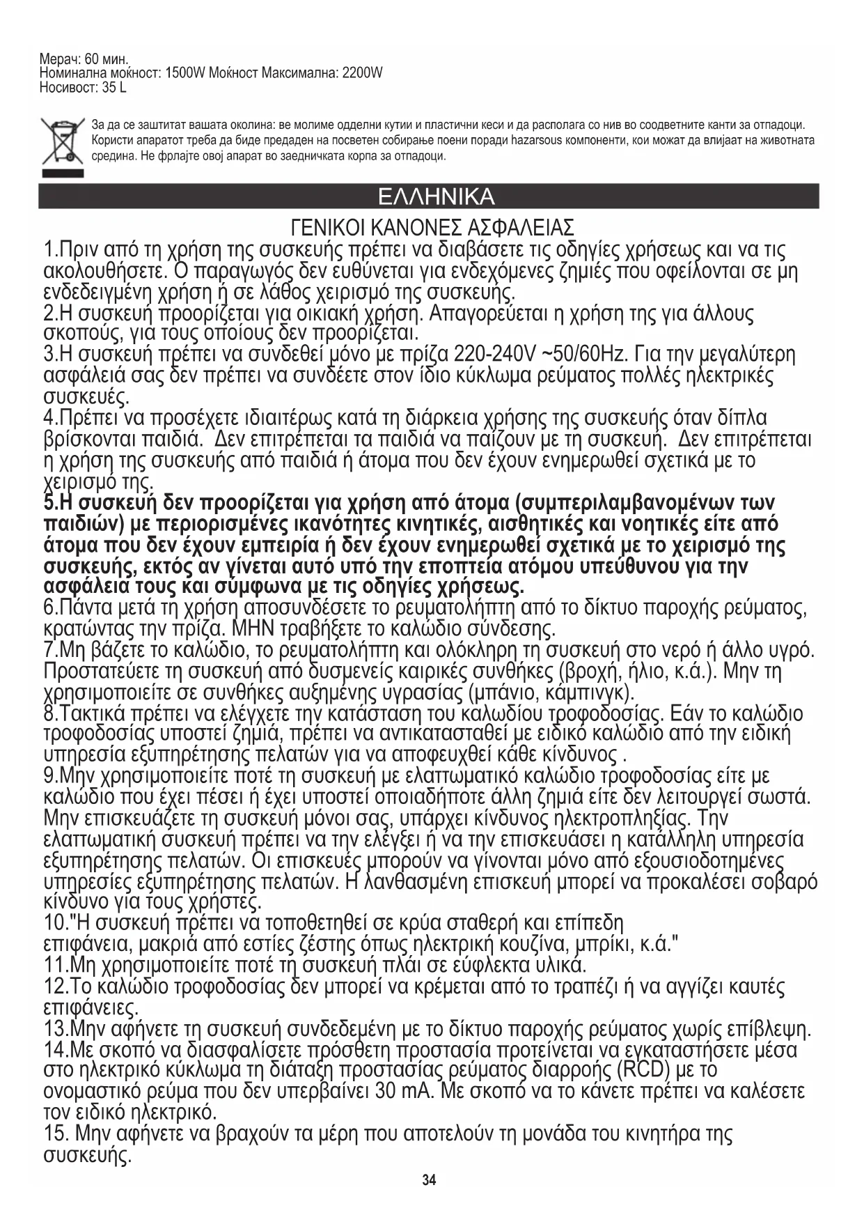 4.Πρέπει να προσέχετε ιδιαιτέρως κατά τη διάρκεια χρήσης της συσκευής όταν δίπλα βρίσκονται παιδιά. Δεν επιτρέπεται τα παιδιά να παίζουν με τη συσκευή. Δεν επιτρέπεται η χρήση της συσκευής από παιδιά ή άτομα που δεν έχουν ενημερωθεί σχετικά με το χειρισμό της. 5.Η συσκευή δεν προορίζεται για χρήση από άτομα (συμπεριλαμβανομένων των παιδιών) με περιορισμένες ικανότητες κινητικές, αισθητικές και νοητικές είτε από άτομα που δεν έχουν εμπειρία ή δεν έχουν ενημερωθεί σχετικά με το χειρισμό της συσκευής, εκτός αν γίνεται αυτό υπό την εποπτεία ατόμου υπεύθυνου για την ασφάλεια τους και σύμφωνα με τις οδηγίες χρήσεως. 8.Τακτικά πρέπει να ελέγχετε την κατάσταση του καλωδίου τροφοδοσίας. Εάν το καλώδιο τροφοδοσίας υποστεί ζημιά, πρέπει να αντικατασταθεί με ειδικό καλώδιο από την ειδική υπηρεσία εξυπηρέτησης πελατών για να αποφευχθεί κάθε κίνδυνος . 6.Πάντα μετά τη χρήση αποσυνδέσετε το ρευματολήπτη από το δίκτυο παροχής ρεύματος, κρατώντας την πρίζα. ΜΗΝ τραβήξετε το καλώδιο σύνδεσης. 7.Μη βάζετε το καλώδιο, το ρευματολήπτη και ολόκληρη τη συσκευή στο νερό ή άλλο υγρό. Προστατεύετε τη συσκευή από δυσμενείς καιρικές συνθήκες (βροχή, ήλιο, κ.ά.). Μην τη χρησιμοποιείτε σε συνθήκες αυξημένης υγρασίας (μπάνιο, κάμπινγκ). 9.Μην χρησιμοποιείτε ποτέ τη συσκευή με ελαττωματικό καλώδιο τροφοδοσίας είτε με καλώδιο που έχει πέσει ή έχει υποστεί οποιαδήποτε άλλη ζημιά είτε δεν λειτουργεί σωστά. Μην επισκευάζετε τη συσκευή μόνοι σας, υπάρχει κίνδυνος ηλεκτροπληξίας. Την ελαττωματική συσκευή πρέπει να την ελέγξει ή να την επισκευάσει η κατάλληλη υπηρεσία εξυπηρέτησης πελατών. Οι επισκευές μπορούν να γίνονται μόνο από εξουσιοδοτημένες υπηρεσίες εξυπηρέτησης πελατών. Η λανθασμένη επισκευή μπορεί να προκαλέσει σοβαρό κίνδυνο για τους χρήστες. 10."Η συσκευή πρέπει να τοποθετηθεί σε κρύα σταθερή και επίπεδη ΓΕΝΙΚΟΙ ΚΑΝΟΝΕΣ ΑΣΦΑΛΕΙΑΣ 1.Πριν από τη χρήση της συσκευής πρέπει να διαβάσετε τις οδηγίες χρήσεως και να τις ακολουθήσετε. Ο παραγωγός δεν ευθύνεται για ενδεχόμενες ζημιές που οφείλονται σε μη ενδεδειγμένη χρήση ή σε λάθος χειρισμό της συσκευής. επιφάνεια, μακριά από εστίες ζέστης όπως ηλεκτρική κουζίνα, μπρίκι, κ.ά." 11.Μη χρησιμοποιείτε ποτέ τη συσκευή πλάι σε εύφλεκτα υλικά. 13.Μην αφήνετε τη συσκευή συνδεδεμένη με το δίκτυο παροχής ρεύματος χωρίς επίβλεψη. 14.Με σκοπό να διασφαλίσετε πρόσθετη προστασία προτείνεται να εγκαταστήσετε μέσα στο ηλεκτρικό κύκλωμα τη διάταξη προστασίας ρεύματος διαρροής (RCD) με το ονομαστικό ρεύμα που δεν υπερβαίνει 30 mA. Με σκοπό να το κάνετε πρέπει να καλέσετε τον ειδικό ηλεκτρικό.