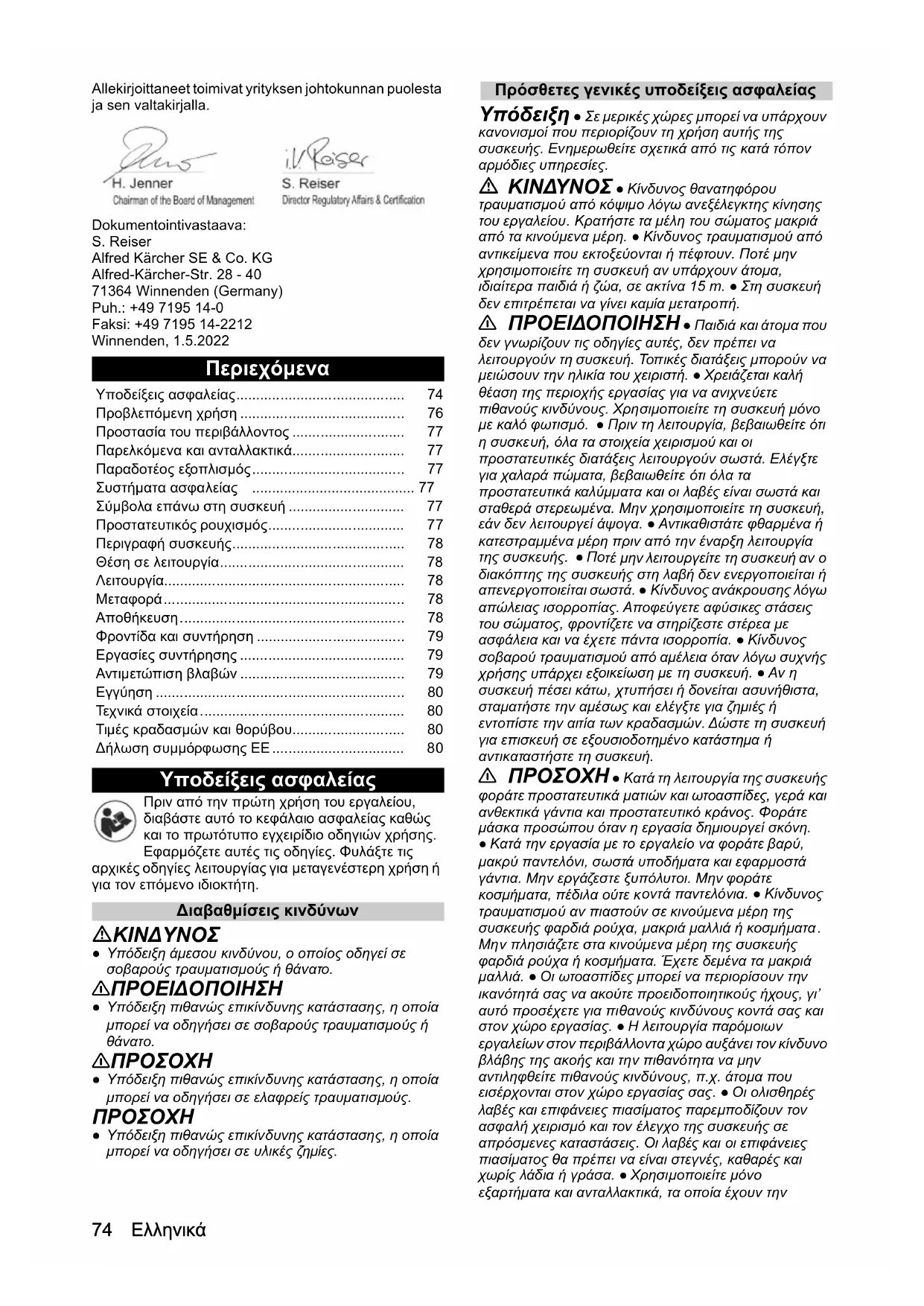 1,574 Ελληνικά Allekirjoittaneet toimivat yrityksen johtokunnan puolesta ja sen valtakirjalla. Dokumentointivastaava: S. Reiser Alfred Kärcher SE & Co. KG Alfred-Kärcher-Str. 28 - 40 71364 Winnenden (Germany) Puh.: +49 7195 14-0 Faksi: +49 7195 14-2212 Winnenden, 1.5.2022 Περιεχόμενα Υποδείξεις ασφαλείας Πριν από την πρώτη χρήση του εργαλείου, διαβάστε αυτό το κεφάλαιο ασφαλείας καθώς και το πρωτότυπο εγχειρίδιο οδηγιών χρήσης. Εφαρμόζετε αυτές τις οδηγίες. Φυλάξτε τις αρχικές οδηγίες λειτουργίας για μεταγενέστερη χρήση ή για τον επόμενο ιδιοκτήτη. Διαβαθμίσεις κινδύνων