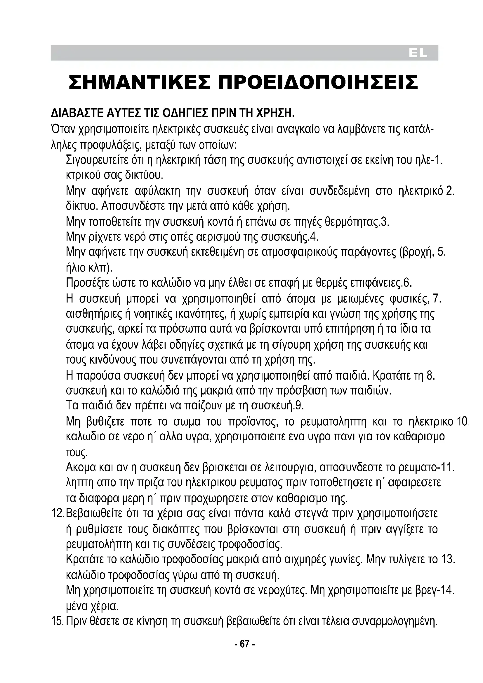 Ακομα και αν η συσκευη δεν βρισκεται σε λειτουργια, αποσυνδεστε το ρευματο-11. ληπτη απο την πριζα του ηλεκτρικου ρευματος πριν τοποθετησετε η΄ αφαιρεσετε τα διαφορα μερη η΄ πριν προχωρησετε στον καθαρισμο της. Βεβαιωθείτε ότι τα χέρια σας είναι πάντα καλά στεγνά πριν χρησιμοποιήσετε 12. ή ρυθμίσετε τους διακόπτες που βρίσκονται στη συσκευή ή πριν αγγίξετε το ρευματολήπτη και τις συνδέσεις τροφοδοσίας. Κρατάτε το καλώδιο τροφοδοσίας μακριά από αιχμηρές γωνίες. Μην τυλίγετε το 13. καλώδιο τροφοδοσίας γύρω από τη συσκευή. Μη χρησιμοποιείτε τη συσκευή κοντά σε νεροχύτες. Μη χρησιμοποιείτε με βρεγ-14. μένα χέρια. Πριν θέσετε σε κίνηση τη συσκευή βεβαιωθείτε ότι είναι τέλεια συναρμολογημένη.15.EL