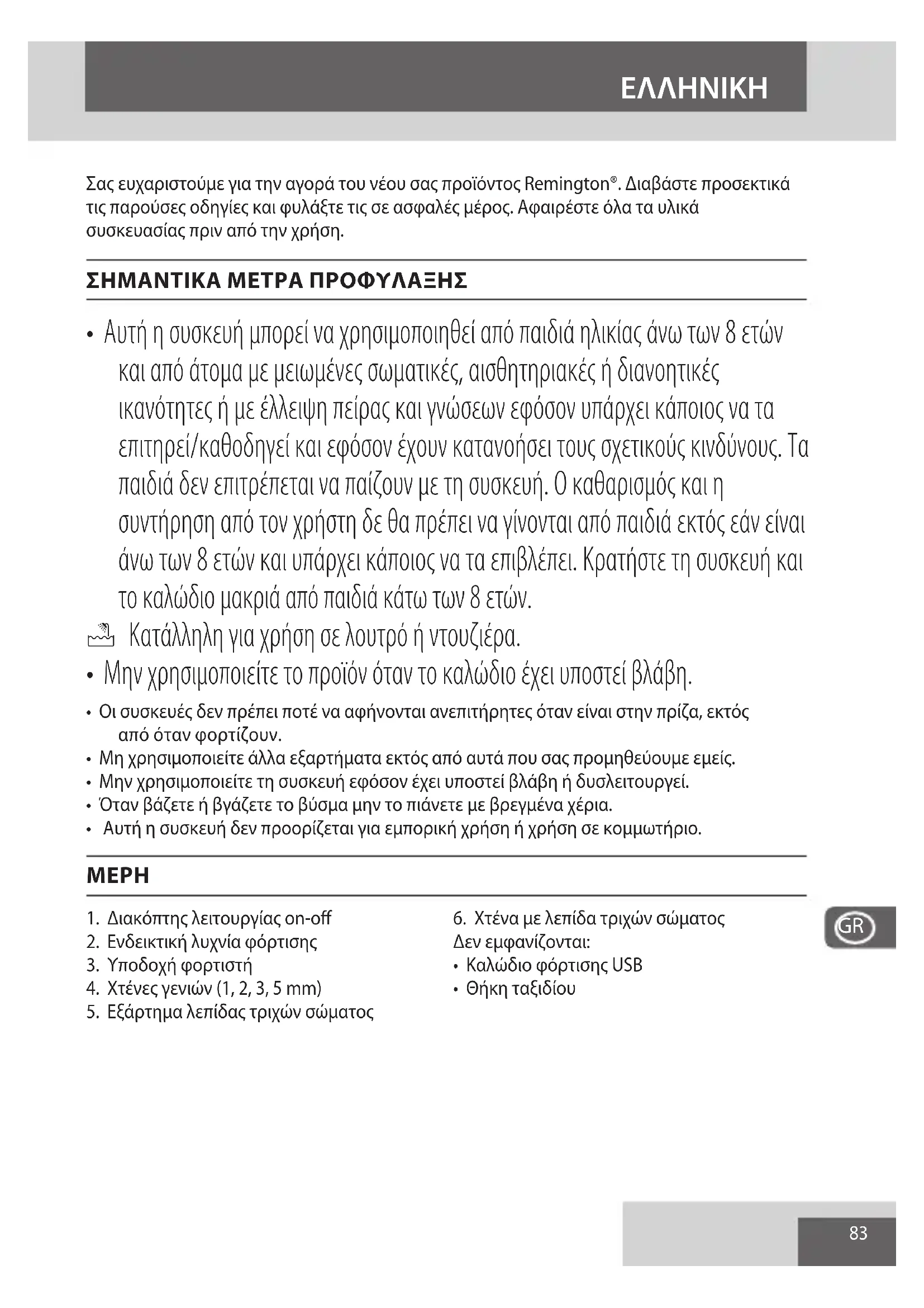Σaç ευχαριστούμε γία την αγορά του θέου σας προίντος Remington®. Διαβάστε προσεκτικά τις παρούσες Οδηγίες και φυλάξτε τις σε ασφαλές μέρος. Αφαipéότε ὅλα ταυλίκα συσκευασίας πριν από την χρήση.
