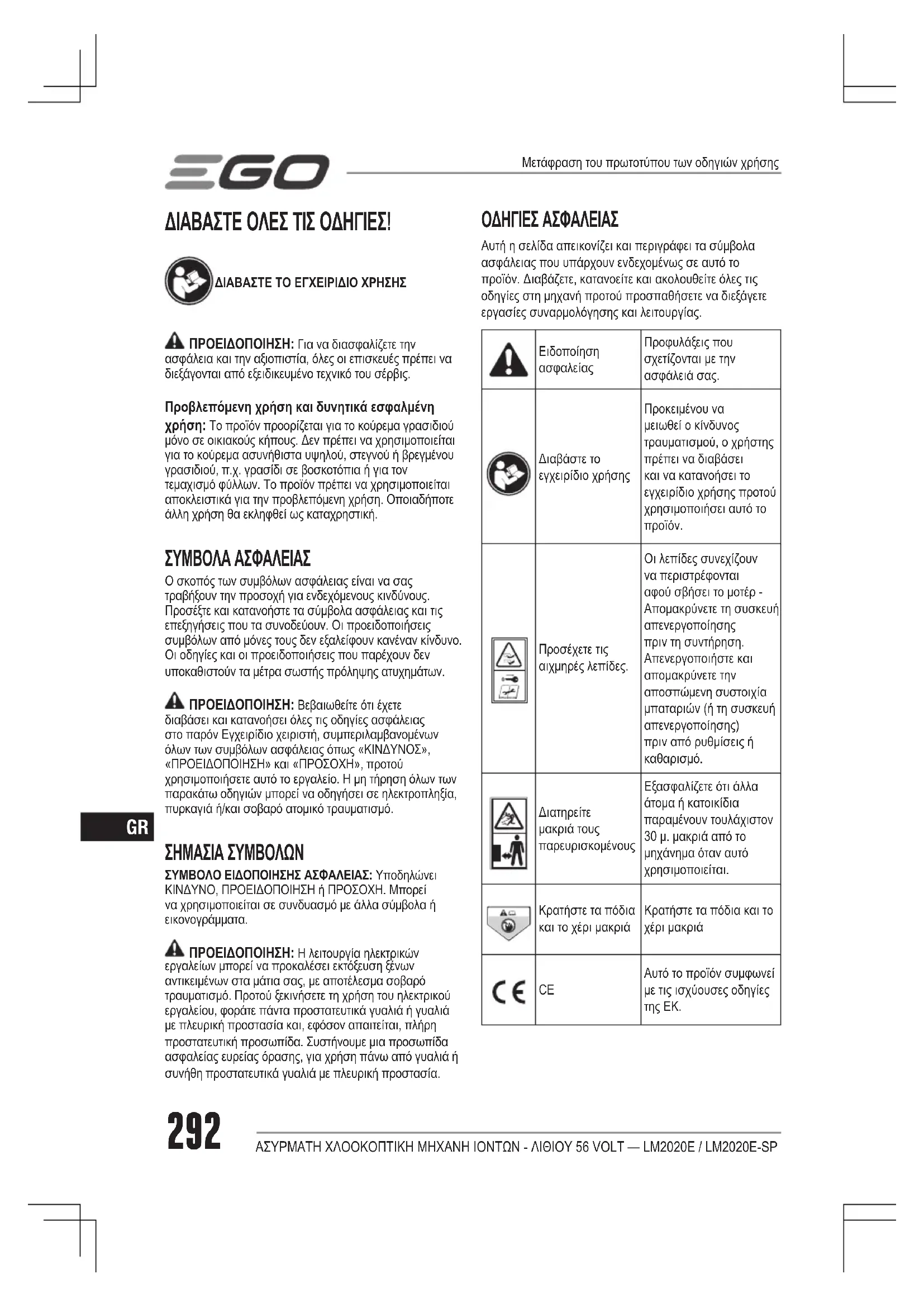 ΔΙΑΒΑΣΤΕ ΟΛΕΣ ΤΙΣ ΟΔΗΓΙΕΣ! ΔΙΑΒΑΣΤΕ ΤΟ ΕΓΧΕΙΡΙΔΙΟ ΧΡΗΣΗΣ ΠΡΟΕΙΔΟΠΟΙΗΣΗ: Για να διασφαλίζετε την ασφάλεια και την αξιοπιστία, όλες οι επισκευές πρέπει να διεξάγονται από εξειδικευμένο τεχνικό του σέρβις. Προβλεπόμενη χρήση και δυνητικά εσφαλμένη χρήση: Το προϊόν προορίζεται για το κούρεμα γρασιδιού μόνο σε οικιακούς κήπους. Δεν πρέπει να χρησιμοποιείται για το κούρεμα ασυνήθιστα υψηλού, στεγνού ή βρεγμένου γρασιδιού, π.χ. γρασίδι σε βοσκοτόπια ή για τον τεμαχισμό φύλλων. Το προϊόν πρέπει να χρησιμοποιείται αποκλειστικά για την προβλεπόμενη χρήση. Οποιαδήποτε άλλη χρήση θα εκληφθεί ως καταχρηστική. ΣΥΜΒΟΛΑ ΑΣΦΑΛΕΙΑΣ Ο σκοπός των συμβόλων ασφάλειας είναι να σας τραβήξουν την προσοχή για ενδεχόμενους κινδύνους. Προσέξτε και κατανοήστε τα σύμβολα ασφάλειας και τις επεξηγήσεις που τα συνοδεύουν. Οι προειδοποιήσεις συμβόλων από μόνες τους δεν εξαλείφουν κανέναν κίνδυνο. Οι οδηγίες και οι προειδοποιήσεις που παρέχουν δεν υποκαθιστούν τα μέτρα σωστής πρόληψης ατυχημάτων. ΠΡΟΕΙΔΟΠΟΙΗΣΗ: Βεβαιωθείτε ότι έχετε διαβάσει και κατανοήσει όλες τις οδηγίες ασφάλειας στο παρόν Εγχειρίδιο χειριστή, συμπεριλαμβανομένων όλων των συμβόλων ασφάλειας όπως «ΚΙΝΔΥΝΟΣ», «ΠΡΟΕΙΔΟΠΟΙΗΣΗ» και «ΠΡΟΣΟΧΗ», προτού χρησιμοποιήσετε αυτό το εργαλείο. Η μη τήρηση όλων των παρακάτω οδηγιών μπορεί να οδηγήσει σε ηλεκτροπληξία, πυρκαγιά ή/και σοβαρό ατομικό τραυματισμό. ΣΗΜΑΣΙΑ ΣΥΜΒΟΛΩΝ ΣΥΜΒΟΛΟ ΕΙΔΟΠΟΙΗΣΗΣ ΑΣΦΑΛΕΙΑΣ: Υποδηλώνει ΚΙΝΔΥΝΟ, ΠΡΟΕΙΔΟΠΟΙΗΣΗ ή ΠΡΟΣΟΧΗ. Μπορεί να χρησιμοποιείται σε συνδυασμό με άλλα σύμβολα ή εικονογράμματα. ΠΡΟΕΙΔΟΠΟΙΗΣΗ: Η λειτουργία ηλεκτρικών εργαλείων μπορεί να προκαλέσει εκτόξευση ξένων αντικειμένων στα μάτια σας, με αποτέλεσμα σοβαρό τραυματισμό. Προτού ξεκινήσετε τη χρήση του ηλεκτρικού εργαλείου, φοράτε πάντα προστατευτικά γυαλιά ή γυαλιά με πλευρική προστασία και, εφόσον απαιτείται, πλήρη προστατευτική προσωπίδα. Συστήνουμε μια προσωπίδα ασφαλείας ευρείας όρασης, για χρήση πάνω από γυαλιά ή συνήθη προστατευτικά γυαλιά με πλευρική προστασία. ΟΔΗΓΙΕΣ ΑΣΦΑΛΕΙΑΣ Αυτή η σελίδα απεικονίζει και περιγράφει τα σύμβολα ασφάλειας που υπάρχουν ενδεχομένως σε αυτό το προϊόν. Διαβάζετε, κατανοείτε και ακολουθείτε όλες τις οδηγίες στη μηχανή προτού προσπαθήσετε να διεξάγετε εργασίες συναρμολόγησης και λειτουργίας.Ειδοποίηση ασφαλείαςΠροφυλάξεις που σχετίζονται με την ασφάλειά σας.Διαβάστε το εγχειρίδιο χρήσηςΠροκειμένου να μειωθεί ο κίνδυνος τραυματισμού, ο χρήστης πρέπει να διαβάσει και να κατανοήσει το εγχειρίδιο χρήσης προτού χρησιμοποιήσει αυτό το προϊόν.Προσέχετε τις αιχμηρές λεπίδες.Οι λεπίδες συνεχίζουν να περιστρέφονται αφού σβήσει το μοτέρ - Απομακρύνετε τη συσκευή απενεργοποίησης πριν τη συντήρηση. Απενεργοποιήστε και απομακρύνετε την αποσπώμενη συστοιχία μπαταριών (ή τη συσκευή απενεργοποίησης) πριν από ρυθμίσεις ή καθαρισμό.Διατηρείτε μακριά τους παρευρισκομένουςΕξασφαλίζετε ότι άλλα άτομα ή κατοικίδια παραμένουν τουλάχιστον 30 μ. μακριά από το μηχάνημα όταν αυτό χρησιμοποιείται.Κρατήστε τα πόδια και το χέρι μακριάΚρατήστε τα πόδια και το χέρι μακριά Αυτό το προϊόν συμφωνεί με τις ισχύουσες οδηγίες της ΕΚ.Μετάφραση του πρωτοτύπου των οδηγιών χρήσηςΑΣΥΡΜΑΤΗ ΧΛΟΟΚΟΠΤΙΚΗ ΜΗΧΑΝΗ ΙΟΝΤΩΝ - ΛΙΘΙΟΥ 56 VOLT — LM2020E / LM2020E-SP 293
