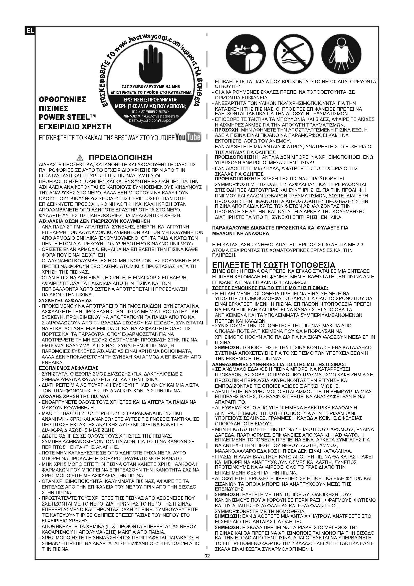 POWER STEEL™ ΕΓΧΕΙΡΙΔΙΟ ΧΡΗΣΤΗ - ΕΠΙΒΛΕΠΕΤΕ ΤΑ ΠΑΙΔΙΑ ΠΟΥ ΒΡΙΣΚΟΝΤΑΙ ΣΤΟ ΝΕΡΟ. ΑΠΑΓΟΡΕΥΟΝΤΑΙ ΟΙ ΒΟΥΤΙΕΣ.- ΟΙ ΑΦΑΙΡΟΥΜΕΝΕΣ ΣΚΑΛΕΣ ΠΡΕΠΕΙ ΝΑ ΤΟΠΟΘΕΤΟΥΝΤΑΙ ΣΕ ΟΡΙΖΟΝΤΙΑ ΕΠΙΦΑΝΕΙΑ.- ΑΝΕΞΑΡΤΗΤΑ ΤΩΝ ΥΛΙΚΩΝ ΠΟΥ ΧΡΗΣΙΜΟΠΟΙΟΥΝΤΑΙ ΓΙΑ ΤΗΝ ΚΑΤΑΣΚΕΥΗ ΤΗΣ ΠΙΣΙΝΑΣ, ΟΙ ΠΡΟΣΙΤΕΣ ΕΠΙΦΑΝΕΙΕΣ ΠΡΕΠΕΙ ΝΑ ΕΛΕΓΧΟΝΤΑΙ ΤΑΚΤΙΚΑ ΓΙΑ ΤΗΝ ΑΠΟΦΥΓΗ ΤΡΑΥΜΑΤΙΣΜΩΝ.- ΕΠΙΘΕΩΡΕΙΤΕ ΤΑΚΤΙΚΑ ΤΑ ΜΠΟΥΛΟΝΙΑ ΚΑΙ ΒΙΔΕΣ, ΑΦΑΙΡΕΙΤΕ ΑΚΙΔΕΣ Η ΑΙΧΜΗΡΕΣ ΑΚΜΕΣ ΓΙΑ ΤΗΝ ΑΠΟΦΥΓΗ ΤΡΑΥΜΑΤΙΣΜΩΝ.- ΠΡΟΣΟΧΗ: ΜΗΝ ΑΦΗΝΕΤΕ ΤΗΝ ΑΠΟΣΤΡΑΓΓΙΣΜΕΝΗ ΠΙΣΙΝΑ ΕΞΩ. Η ΑΔΕΙΑ ΠΙΣΙΝΑ ΕΙΝΑΙ ΠΙΘΑΝΟ ΝΑ ΠΑΡΑΜΟΡΦΩΘΕΙ ΚΑΙ/Η ΝΑ ΕΚΤΟΠΙΣΤΕΙ ΛΟΓΩ ΤΟΥ ΑΝΕΜΟΥ.- ΕΑΝ ΔΙΑΘΕΤΕΤΕ ΜΙΑ ΑΝΤΛΙΑ ΦΙΛΤΡΟΥ, ΑΝΑΤΡΕΞΤΕ ΣΤΟ ΕΓΧΕΙΡΙΔΙΟ ΤΗΣ ΑΝΤΛΙΑΣ ΓΙΑ ΟΔΗΓΙΕΣ. ΠΡΟΕΙΔΟΠΟΙΗΣΗ! Η ΑΝΤΛΙΑ ΔΕΝ ΜΠΟΡΕΙ ΝΑ ΧΡΗΣΙΜΟΠΟΙΗΘΕΙ, ΕΝΩ ΥΠΑΡΧΟΥΝ ΑΝΘΡΩΠΟΙ ΜΕΣΑ ΣΤΗΝ ΠΙΣΙΝΑ!- ΕΑΝ ΔΙΑΘΕΤΕΤΕ ΜΙΑ ΣΚΑΛΑ, ΑΝΑΤΡΕΞΤΕ ΣΤΟ ΕΓΧΕΙΡΙΔΙΟ ΤΗΣ ΣΚΑΛΑΣ ΓΙΑ ΟΔΗΓΙΕΣ. ΠΡΟΕΙΔΟΠΟΙΗΣΗ! Η ΧΡΗΣΗ ΤΗΣ ΠΙΣΙΝΑΣ ΠΡΟΫΠΟΘΕΤΕΙ ΣΥΜΜΟΡΦΩΣΗ ΜΕ ΤΙΣ ΟΔΗΓΙΕΣ ΑΣΦΑΛΕΙΑΣ ΠΟΥ ΠΕΡΙΓΡΑΦΟΝΤΑΙ ΣΤΙΣ ΟΔΗΓΙΕΣ ΛΕΙΤΟΥΡΓΙΑΣ ΚΑΙ ΣΥΝΤΗΡΗΣΗΣ. ΓΙΑ ΤΗΝ ΠΡΟΛΗΨΗ ΠΝΙΓΜΟΥ ΚΑΙ ΑΛΛΩΝ ΣΟΒΑΡΩΝ ΤΡΑΥΜΑΤΙΣΜΩΝ, ΔΩΣΤΕ ΙΔΙΑΙΤΕΡΗ ΠΡΟΣΟΧΗ ΣΤΗΝ ΠΙΘΑΝΟΤΗΤΑ ΑΠΡΟΣΔΟΚΗΤΗΣ ΠΡΟΣΒΑΣΗΣ ΣΤΗΝ ΠΙΣΙΝΑ ΑΠΟ ΠΑΙΔΙΑ ΚΑΤΩ ΤΩΝ 5 ΕΤΩΝ ΑΣΦΑΛΙΖΟΝΤΑΣ ΤΗΝ ΠΡΟΣΒΑΣΗ ΣΕ ΑΥΤΗΝ, ΚΑΙ, ΚΑΤΑ ΤΗ ΔΙΑΡΚΕΙΑ ΤΗΣ ΚΟΛΥΜΒΗΣΗΣ, ΔΙΑΤΗΡΗΣΤΕ ΤΑ ΥΠΟ ΤΗ ΣΥΝΕΧΗ ΕΠΙΤΗΡΗΣΗ ΕΝΗΛΙΚΑ.ΠΑΡΑΚΑΛΟΥΜΕ ΔΙΑΒΑΣΤΕ ΠΡΟΣΕΚΤΙΚΑ ΚΑΙ ΦΥΛΑΞΤΕ ΓΙΑ ΜΕΛΛΟΝΤΙΚΗ ΑΝΑΦΟΡΑΗ ΕΓΚΑΤΑΣΤΑΣΗ ΣΥΝΗΘΩΣ ΑΠΑΙΤΕΙ ΠΕΡΙΠΟΥ 20-30 ΛΕΠΤΑ ΜΕ 2-3 ΑΤΟΜΑ ΕΞΑΙΡΩΝΤΑΣ ΤΙΣ ΧΩΜΑΤΟΥΡΓΙΚΕΣ ΕΡΓΑΣΙΕΣ ΚΑΙ ΤΗΝ ΠΛΗΡΩΣΗ. ΕΠΙΛΕΞΤΕ ΤΗ ΣΩΣΤΗ ΤΟΠΟΘΕΣΙΑ ΣΗΜΕΙΩΣΗ: Η ΠΙΣΙΝΑ ΘΑ ΠΡΕΠΕΙ ΝΑ ΕΓΚΑΘΙΣΤΑΤΑΙ ΣΕ ΜΙΑ ΕΝΤΕΛΩΣ ΕΠΙΠΕΔΗ ΚΑΙ ΟΜΑΛΗ ΕΠΙΦΑΝΕΙΑ. ΜΗΝ ΕΓΚΑΘΙΣΤΑΤΕ ΤΗΝ ΠΙΣΙΝΑ ΑΝ Η ΕΠΙΦΑΝΕΙΑ ΕΙΝΑΙ ΕΠΙΚΛΙΝΗΣ 'H ΑΝΩΜΑΛΗ.ΣΩΣΤΕΣ ΣΥΝΘΗΚΕΣ ΓΙΑ ΤΟ ΣΤΗΣΙΜΟ ΤΗΣ ΠΙΣΙΝΑΣ:• Η ΕΠΙΛΕΓΜΕΝΗ ΤΟΠΟΘΕΣΙΑ ΠΡΕΠΕΙ ΝΑ ΕΙΝΑΙ ΣΕ ΘΕΣΗ ΝΑ ΥΠΟΣΤΗΡΙΖΕΙ ΟΜΟΙΟΜΟΡΦΑ ΤΟ ΒΑΡΟΣ ΓΙΑ ΟΛΟ ΤΟ ΧΡΟΝΟ ΠΟΥ ΘΑ ΕΙΝΑΙ ΕΓΚΑΤΕΣΤΗΜΕΝΗ Η ΠΙΣΙΝΑ, ΕΠΙΠΛΕΟΝ Η ΤΟΠΟΘΕΣΙΑ ΠΡΕΠΕΙ ΝΑ ΕΙΝΑΙ ΕΠΙΠΕΔΗ ΚΑΙ ΠΡΕΠΕΙ ΝΑ ΚΑΘΑΡΙΣΤΕΙ ΑΠΟ ΟΛΑ ΤΑ ΑΝΤΙΚΕΙΜΕΝΑ ΚΑΙ ΤΑ ΥΠΟΛΕΙΜΜΑΤΑ ΣΥΜΠΕΡΙΛΑΜΒΑΝΟΜΕΝΩΝ ΠΕΤΡΩΝ ΚΑΙ ΚΛΑΔΙΩΝ.• ΣΥΝΙΣΤΟΥΜΕ ΤΗΝ ΤΟΠΟΘΕΤΗΣΗ ΤΗΣ ΠΙΣΙΝΑΣ ΜΑΚΡΙΑ ΑΠΟ ΟΠΟΙΑΔΗΠΟΤΕ ΑΝΤΙΚΕΙΜΕΝΑ ΠΟΥ ΘΑ ΜΠΟΡΟΥΣΑΝ ΝΑ ΧΡΗΣΙΜΟΠΟΙΗΘΟΥΝ ΑΠΟ ΠΑΙΔΙΑ ΓΙΑ ΝΑ ΣΚΑΡΦΑΛΩΣΟΥΝ ΜΕΣΑ ΣΤΗΝ ΠΙΣΙΝΑ. ΣΗΜΕΙΩΣΗ: ΤΟΠΟΘΕΤΗΣΤΕ ΤΗΝ ΠΙΣΙΝΑ ΚΟΝΤΑ ΣΕ ΕΝΑ ΚΑΤΑΛΛΗΛΟ ΣΥΣΤΗΜΑ ΑΠΟΧΕΤΕΥΣΗΣ ΓΙΑ ΤΟ ΧΕΙΡΙΣΜΟ ΤΩΝ ΥΠΕΡΧΕΙΛΙΣΕΩΝ Η ΤΗΝ ΕΚΚΕΝΩΣΗ ΤΗΣ ΠΙΣΙΝΑΣ.ΛΑΝΘΑΣΜΕΝΕΣ ΣΥΝΘΗΚΕΣ ΓΙΑ ΤΟ ΣΤΗΣΙΜΟ ΤΗΣ ΠΙΣΙΝΑΣ:• ΣΕ ΑΝΩΜΑΛΟ ΕΔΑΦΟΣ Η ΠΙΣΙΝΑ ΜΠΟΡΕΙ ΝΑ ΚΑΤΑΡΡΕΥΣΕΙ ΠΡΟΚΑΛΩΝΤΑΣ ΣΟΒΑΡΟ ΠΡΟΣΩΠΙΚΟ ΤΡΑΥΜΑΤΙΣΜΟ ΚΑΙ/Η ΖΗΜΙΑ ΣΕ ΠΡΟΣΩΠΙΚΗ ΠΕΡΙΟΥΣΙΑ ΑΚΥΡΩΝΟΝΤΑΣ ΤΗΝ ΕΓΓΥΗΣΗ ΚΑΙ ΕΜΠΟΔΙΖΟΝΤΑΣ ΤΙΣ ΟΠΟΙΕΣ ΑΞΙΩΣΕΙΣ ΑΠΟΖΗΜΙΩΣΗΣ.• ΔΕΝ ΠΡΕΠΕΙ ΝΑ ΧΡΗΣΙΜΟΠΟΙΕΙΤΑΙ ΑΜΜΟΣ ΓΙΑ ΤΗ ΔΗΜΙΟΥΡΓΙΑ ΜΙΑΣ ΕΠΙΠΕΔΗΣ ΒΑΣΗΣ, ΤΟ ΕΔΑΦΟΣ ΠΡΕΠΕΙ ΝΑ ΑΝΑΣΚΑΦΕΙ ΕΑΝ ΕΙΝΑΙ ΑΠΑΡΑΙΤΗΤΟ.• ΑΠΕΥΘΕΙΑΣ ΚΑΤΩ ΑΠΟ ΥΠΕΡΚΕΙΜΕΝΑ ΗΛΕΚΤΡΙΚΑ ΚΑΛΩΔΙΑ Η ΔΕΝΤΡΑ. ΒΕΒΑΙΩΘΕΙΤΕ ΟΤΙ Η ΤΟΠΟΘΕΣΙΑ ΔΕΝ ΠΕΡΙΛΑΜΒΑΝΕΙ ΥΠΟΓΕΙΟΥΣ ΣΩΛΗΝΕΣ, ΓΡΑΜΜΕΣ Η ΚΑΛΩΔΙΑ ΚΟΙΝΗΣ ΩΦΕΛΕΙΑΣ ΟΠΟΙΟΥΔΗΠΟΤΕ ΕΙΔΟΥΣ.• ΜΗΝ ΕΓΚΑΤΑΣΤΗΣΕΤΕ ΤΗΝ ΠΙΣΙΝΑ ΣΕ ΙΔΙΩΤΙΚΟΥΣ ΔΡΟΜΟΥΣ, ΞΥΛΙΝΑ ΔΑΠΕΔΑ, ΠΛΑΤΦΟΡΜΕΣ, ΕΠΙΦΑΝΕΙΕΣ ΑΠΟ ΧΑΛΙΚΙ Η ΑΣΦΑΛΤΟ. Η ΕΠΙΛΕΓΜΕΝΗ ΤΟΠΟΘΕΣΙΑ ΠΡΕΠΕΙ ΝΑ ΕΙΝΑΙ ΑΡΚΕΤΑ ΣΥΜΠΑΓΗΣ ΓΙΑ ΝΑ ΑΝΤΕΧΕΙ ΤΗΝ ΠΙΕΣΗ ΤΟΥ ΝΕΡΟΥ. ΛΑΣΠΗ, ΑΜΜΟΣ, ΜΑΛΑΚΟ/ΧΑΛΑΡΟ ΕΔΑΦΟΣ Η ΠΙΣΣΑ ΔΕΝ ΕΙΝΑΙ ΚΑΤΑΛΛΗΛΑ.• ΓΡΑΣΙΔΙ Η ΑΛΛΗ ΒΛΑΣΤΗΣΗ ΚΑΤΩ ΑΠΟ ΤΗΝ ΠΙΣΙΝΑ ΘΑ ΚΑΤΑΣΤΡΑΦΕΙ ΚΑΙ ΜΠΟΡΕΙ ΝΑ ΑΝΑΠΤΥΧΘΟΥΝ ΟΣΜΕΣ ΚΑΙ ΛΑΣΠΗ, ΣΥΝΕΠΩΣ ΠΡΟΤΕΙΝΟΥΜΕ ΝΑ ΑΦΑΙΡΕΘΕΙ ΟΛΟ ΤΟ ΓΡΑΣΙΔΙ ΑΠΟ ΤΗΝ ΕΠΙΛΕΓΜΕΝΗ ΘΕΣΗ ΓΙΑ ΤΗΝ ΠΙΣΙΝΑ.• Α