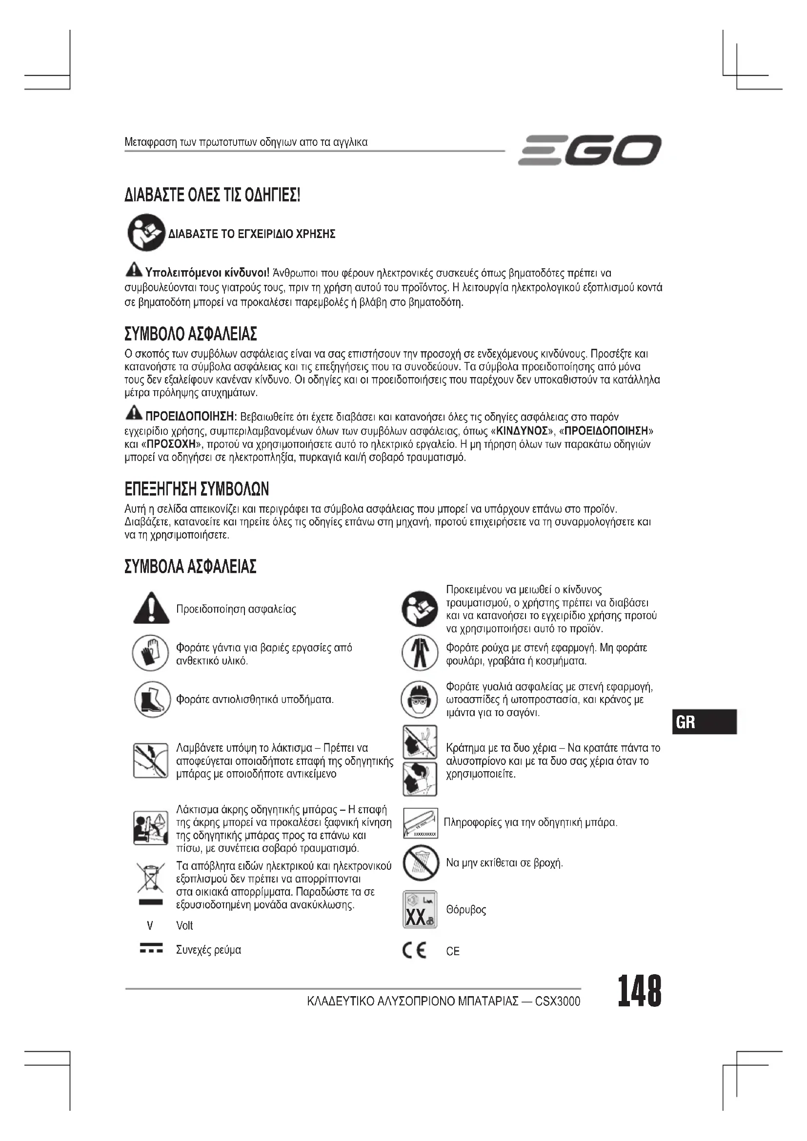 ΚΛΑΔΕΥΤΙΚΟ ΑΛΥΣΟΠΡΙΟΝΟ ΜΠΑΤΑΡΙΑΣ — CSX3000 ΔΙΑΒΑΣΤΕ ΟΛΕΣ ΤΙΣ ΟΔΗΓΙΕΣ! ΔΙΑΒΑΣΤΕ ΤΟ ΕΓΧΕΙΡΙΔΙΟ ΧΡΗΣΗΣ Υπολειπόμενοι κίνδυνοι! Άνθρωποι που φέρουν ηλεκτρονικές συσκευές όπως βηματοδότες πρέπει να συμβουλεύονται τους γιατρούς τους, πριν τη χρήση αυτού του προϊόντος. Η λειτουργία ηλεκτρολογικού εξοπλισμού κοντά σε βηματοδότη μπορεί να προκαλέσει παρεμβολές ή βλάβη στο βηματοδότη. ΣΥΜΒΟΛΟ ΑΣΦΑΛΕΙΑΣ Ο σκοπός των συμβόλων ασφάλειας είναι να σας επιστήσουν την προσοχή σε ενδεχόμενους κινδύνους. Προσέξτε και κατανοήστε τα σύμβολα ασφάλειας και τις επεξηγήσεις που τα συνοδεύουν. Τα σύμβολα προειδοποίησης από μόνα τους δεν εξαλείφουν κανέναν κίνδυνο. Οι οδηγίες και οι προειδοποιήσεις που παρέχουν δεν υποκαθιστούν τα κατάλληλα μέτρα πρόληψης ατυχημάτων. ΠΡΟΕΙΔΟΠΟΙΗΣΗ: Βεβαιωθείτε ότι έχετε διαβάσει και κατανοήσει όλες τις οδηγίες ασφάλειας στο παρόν εγχειρίδιο χρήσης, συμπεριλαμβανομένων όλων των συμβόλων ασφάλειας, όπως «ΚΙΝΔΥΝΟΣ», «ΠΡΟΕΙΔΟΠΟΙΗΣΗ» και «ΠΡΟΣΟΧΗ», προτού να χρησιμοποιήσετε αυτό το ηλεκτρικό εργαλείο. Η μη τήρηση όλων των παρακάτω οδηγιών μπορεί να οδηγήσει σε ηλεκτροπληξία, πυρκαγιά και/ή σοβαρό τραυματισμό. ΕΠΕΞΗΓΗΣΗ ΣΥΜΒΟΛΩΝ Αυτή η σελίδα απεικονίζει και περιγράφει τα σύμβολα ασφάλειας που μπορεί να υπάρχουν επάνω στο προϊόν. Διαβάζετε, κατανοείτε και τηρείτε όλες τις οδηγίες επάνω στη μηχανή, προτού επιχειρήσετε να τη συναρμολογήσετε και να τη χρησιμοποιήσετε. ΣΥΜΒΟΛΑ ΑΣΦΑΛΕΙΑΣ Προειδοποίηση ασφαλείαςΠροκειμένου να μειωθεί ο κίνδυνος τραυματισμού, ο χρήστης πρέπει να διαβάσει και να κατανοήσει το εγχειρίδιο χρήσης προτού να χρησιμοποιήσει αυτό το προϊόν.Φοράτε γάντια για βαριές εργασίες από ανθεκτικό υλικό.Φοράτε ρούχα με στενή εφαρμογή. Μη φοράτε φουλάρι, γραβάτα ή κοσμήματα.Φοράτε αντιολισθητικά υποδήματα.Φοράτε γυαλιά ασφαλείας με στενή εφαρμογή, ωτοασπίδες ή ωτοπροστασία, και κράνος με ιμάντα για το σαγόνι.Λαμβάνετε υπόψη το λάκτισμα – Πρέπει να αποφεύγεται οποιαδήποτε επαφή της οδηγητικής μπάρας με οποιοδήποτε αντικείμενοΚράτημα με τα δυο χέρια – Να κρατάτε πάντα το αλυσοπρίονο και με τα δυο σας χέρια όταν το χρησιμοποιείτε.Λάκτισμα άκρης οδηγητικής μπάρας – Η επαφή της άκρης μπορεί να προκαλέσει ξαφνική κίνηση της οδηγητικής μπάρας προς τα επάνω και πίσω, με συνέπεια σοβαρό τραυματισμό.Τα απόβλητα ειδών ηλεκτρικού και ηλεκτρονικού εξοπλισμού δεν πρέπει να απορρίπτονται στα οικιακά απορρίμματα. Παραδώστε τα σε εξουσιοδοτημένη μονάδα ανακύκλωσης.