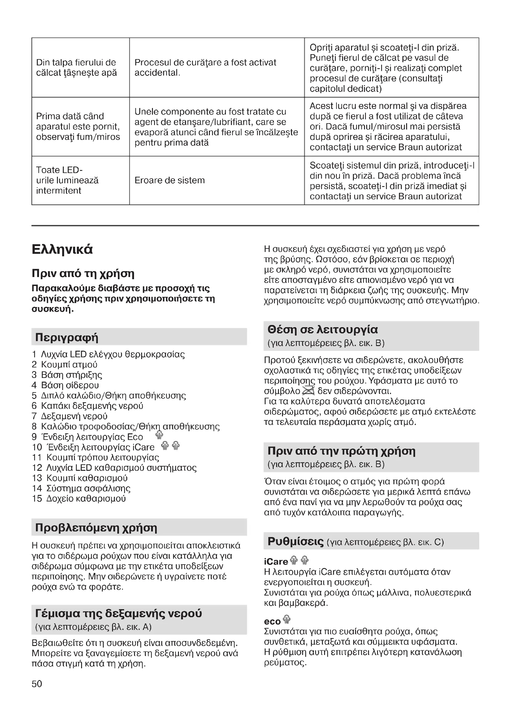 δεν σιδερώνονται. Για τα καλύτερα δυνατά αποτελέσµατα σιδερώµατος, αφού σιδερώσετε µε ατµό εκτελέστε τα τελευταία περάσµατα χωρίς ατµό. Πριν από την πρώτη χρήση (για λεπτοµέρειες βλ. εικ. B) Όταν είναι έτοιµος ο ατµός για πρώτη φορά συνιστάται να σιδερώσετε για µερικά λεπτά επάνω από ένα πανί για να µην λερωθούν τα ρούχα σας από τυχόν κατάλοιπα παραγωγής. Ρυθμίσεις (για λεπτοµέρειες βλ. εικ. C) iCare Η λειτουργία iCare επιλέγεται αυτόµατα όταν ενεργοποιείται η συσκευή. Συνιστάται για ρούχα όπως µάλλινα, πολυεστερικά και βαµβακερά. eco Συνιστάται για πιο ευαίσθητα ρούχα, όπως συνθετικά, µεταξωτά και σύµµεικτα υφάσµατα. Η ρύθµιση αυτή επιτρέπει λιγότερη κατανάλωση