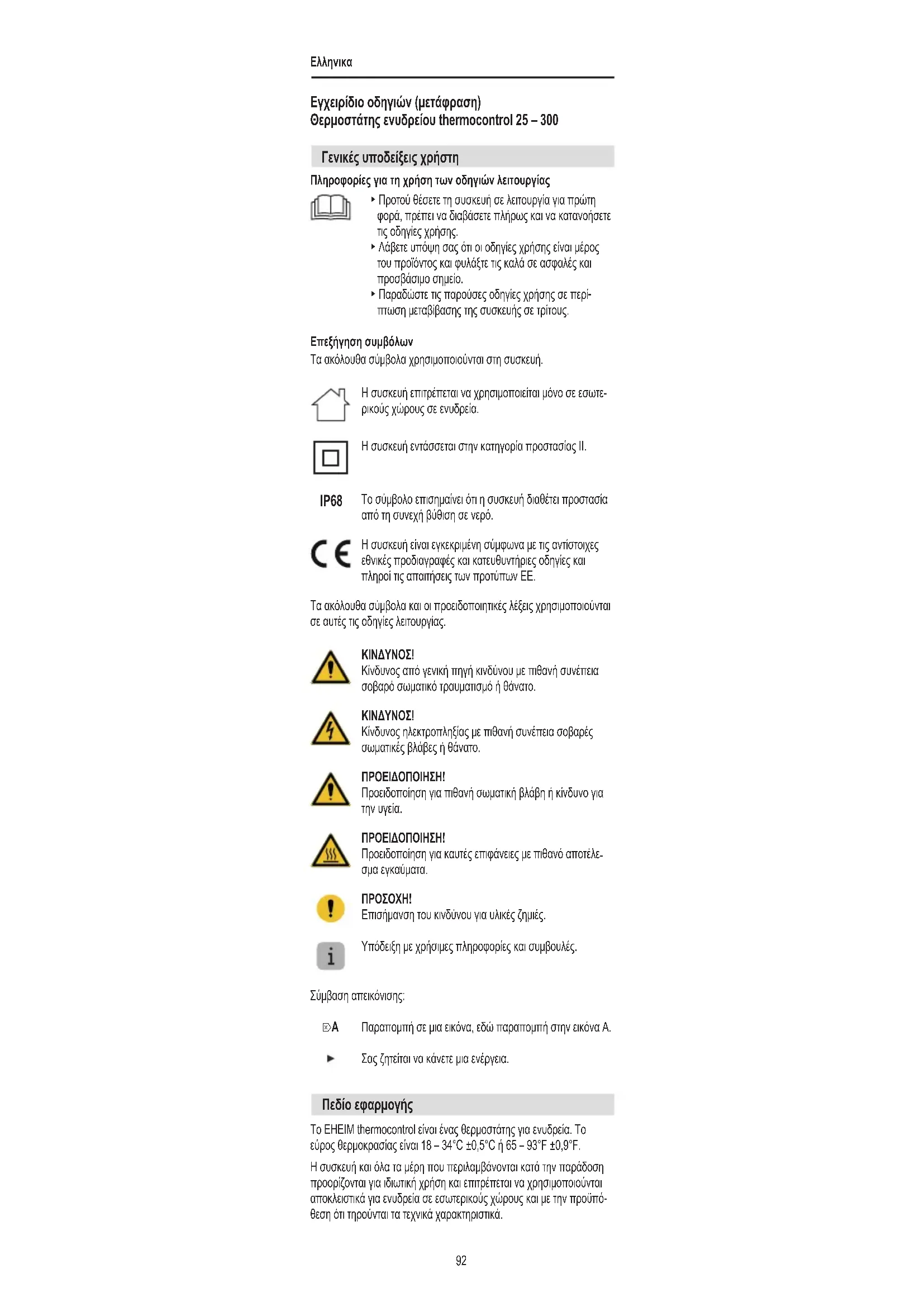 Πεδίο εφαρμογής Το EHEIM thermocontrol είναι ένας θερμοστάτης για ενυδρεία. Το εύρος θερμοκρασίας είναι 18 – 34°C ±0,5°C ή 65 – 93°F ±0,9°F. Η συσκευή και όλα τα μέρη που περιλαμβάνονται κατά την παράδοση προορίζονται για ιδιωτική χρήση και επιτρέπεται να χρησιμοποιούνται αποκλειστικά για ενυδρεία σε εσωτερικούς χώρους και με την προϋπό- θεση ότι τηρούνται τα τεχνικά χαρακτηριστικά.Ελληνικα