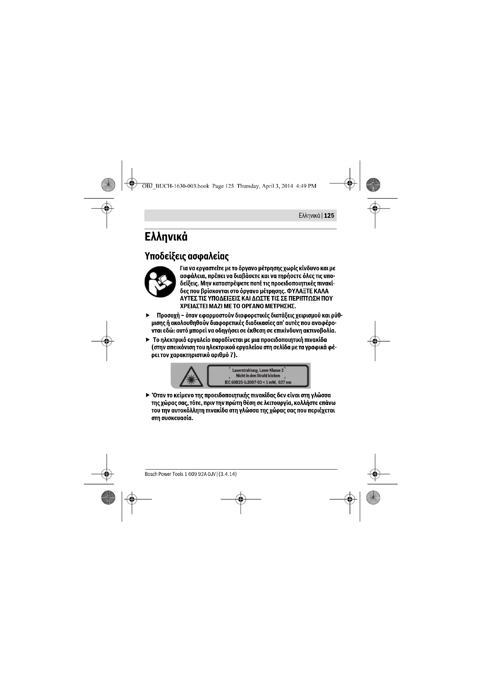 Υποδείξεις ασφαλείας Για να εργαστείτε με το όργανο μέτρησης χωρίς κίνδυνο και με ασφάλεια, πρέπει να διαβάσετε και να τηρήσετε όλες τις υπο- δείξεις. Μην καταστρέψετε ποτέ τις προειδοποιητικές πινακί- δες που βρίσκονται στο όργανο μέτρησης. ΦΥΛΑΞΤΕ ΚΑΛΑ ΑΥΤΕΣ ΤΙΣ ΥΠΟΔΕΙΞΕΙΣ ΚΑΙ ΔΩΣΤΕ ΤΙΣ ΣΕ ΠΕΡΙΠΤΩΣΗ ΠΟΥ ΧΡΕΙΑΣΤΕΙ ΜΑΖΙ ΜΕ ΤΟ ΟΡΓΑΝΟ ΜΕΤΡΗΣΗΣ. Προσοχή – όταν εφαρμοστούν διαφορετικές διατάξεις χειρισμού και ρύθ- μισης ή ακολουθηθούν διαφορετικές διαδικασίες απ’ αυτές που αναφέρο- νται εδώ: αυτό μπορεί να οδηγήσει σε έκθεση σε επικίνδυνη ακτινοβολία. Το ηλεκτρικό εργαλείο παραδίνεται με μια προειδοποιητική πινακίδα (στην απεικόνιση του ηλεκτρικού εργαλείου στη σελίδα με τα γραφικά φέ- ρει τον χαρακτηριστικό αριθμό 7). Όταν το κείμενο της προειδοποιητικής πινακίδας δεν είναι στη γλώσσα της χώρας σας, τότε, πριν την πρώτη θέση σε λειτουργία, κολλήστε επάνω του την αυτοκόλλητη πινακίδα στη γλώσσα της χώρας σας που περιέχεται στη συσκευασία. OBJ_BUCH-1630-003.book Page 125 Thursday, April 3, 2014 4:49 PM1 609 92A 0JV | (3.4.14) Bosch Power Tools 126 | Ελληνικά Μην κατευθύνετε την ακτίνα λέιζερ επάνω σε πρόσωπα ή ζώα και μην κοιτάξετε οι ίδιοι κατευθείαν στην άμεση ή ανα- κλώμενη ακτίνα λέιζερ. Έτσι μπορεί να τυφλώσετε άτομα, να προκαλέσετε ατυχήματα ή να βλάψετε τα μάτια σας.