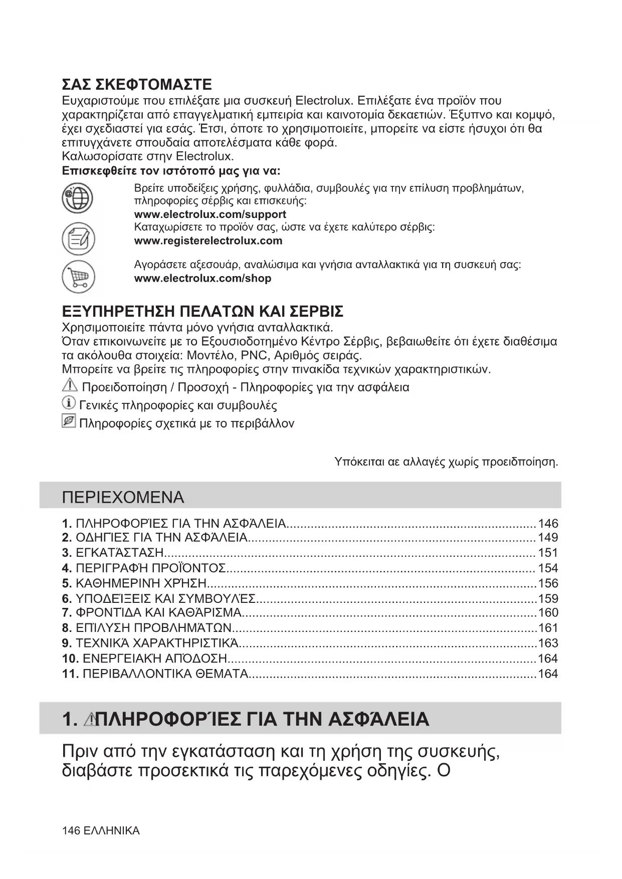 Recyceln Sie Materialien mit dem Symbol . Entsorgen Sie die Verpackung in den entsprechenden Recyclingbehältern. Recyceln Sie zum Umwelt- und Gesundheitsschutz elektrische und elektronische Geräte. Entsorgen Sie Geräte mit diesem Symbol nicht mit dem Hausmüll. Bringen Sie das Gerät zu Ihrer örtlichen Sammelstelle oder wenden Sie sich an Ihr Gemeindeamt. DEUTSCH 145ΣΑΣ ΣΚΕΦΤΟΜΑΣΤΕ Ευχαριστούμε που επιλέξατε μια συσκευή Electrolux. Επιλέξατε ένα προϊόν που χαρακτηρίζεται από επαγγελματική εμπειρία και καινοτομία δεκαετιών. Έξυπνο και κομψό, έχει σχεδιαστεί για εσάς. Έτσι, όποτε το χρησιμοποιείτε, μπορείτε να είστε ήσυχοι ότι θα επιτυγχάνετε σπουδαία αποτελέσματα κάθε φορά. Καλωσορίσατε στην Electrolux. Επισκεφθείτε τον ιστότοπό μας για να:Βρείτε υποδείξεις χρήσης, φυλλάδια, συμβουλές για την επίλυση προβλημάτων,πληροφορίες σέρβις και επισκευής:www.electrolux.com/supportΚαταχωρίσετε το προϊόν σας, ώστε να έχετε καλύτερο σέρβις:www.registerelectrolux.comΑγοράσετε αξεσουάρ, αναλώσιμα και γνήσια ανταλλακτικά για τη συσκευή σας:www.electrolux.com/shop ΕΞΥΠΗΡΕΤΗΣΗ ΠΕΛΑΤΩΝ ΚΑΙ ΣΕΡΒΙΣ Χρησιμοποιείτε πάντα μόνο γνήσια ανταλλακτικά. Όταν επικοινωνείτε με το Εξουσιοδοτημένο Κέντρο Σέρβις, βεβαιωθείτε ότι έχετε διαθέσιμα τα ακόλουθα στοιχεία: Μοντέλο, PNC, Αριθμός σειράς. Μπορείτε να βρείτε τις πληροφορίες στην πινακίδα τεχνικών χαρακτηριστικών. Προειδοποίηση / Προσοχή - Πληροφορίες για την ασφάλεια Γενικές πληροφορίες και συμβουλές Πληροφορίες σχετικά με το περιβάλλον Υπόκειται αε αλλαγές χωρίς προειδποίηση. ΠΕΡΙΕΧΟΜΕΝΑ