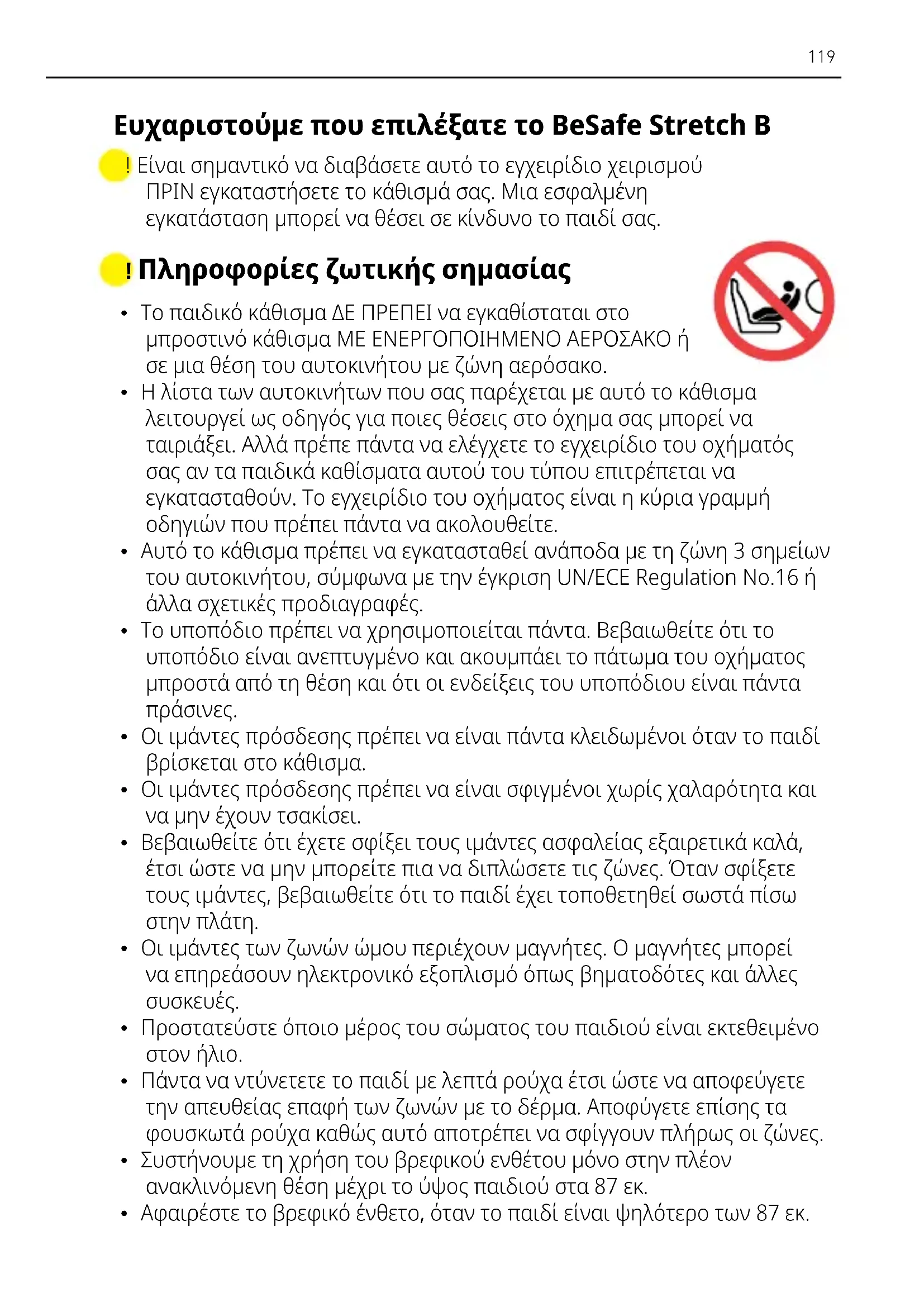 - Αφαιρέστε το βρεφικό ένθετο, όταν το παιδί είναι ψηλότερο των 87 εκ. ! Είναι σημαντικό να διαβάσετε αυτό το εγχειρίδιο χειρισμού ΠΡΙΝ εγκαταστήσετε το κάθισμά σας. Μια εσφαλμένη εγκατάσταση μπορεί να θέσει σε κίνδυνο το παιδί σας. Ευχαριστούμε που επιλέξατε το BeSafe Stretch B120