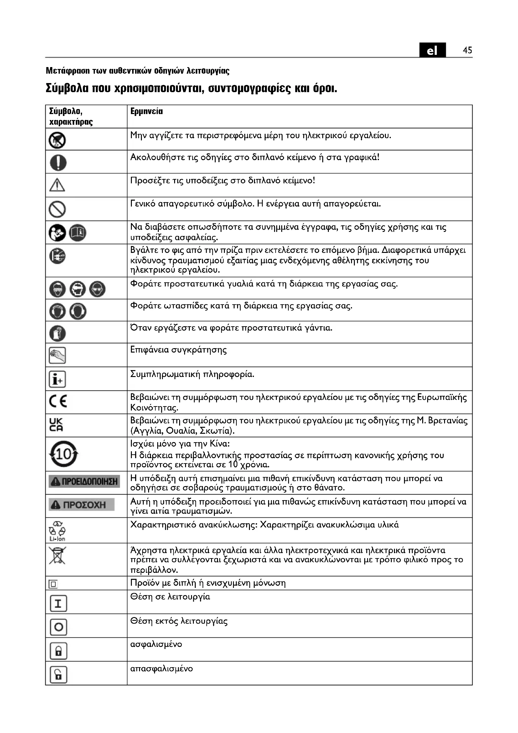 Μην αγγίζετε τα περιστρεφόμενα μέρη του ηλεκτρικού εργαλείου. Ακολουθήστε τις οδηγίες στο διπλανό κείμενο ή στα γραφικά! Προσέξτε τις υποδείξεις στο διπλανό κείμενο! Γενικό απαγορευτικό σύμβολο. Η ενέργεια αυτή απαγορεύεται. Να διαβάσετε οπωσδήποτε τα συνημμένα έγγραφα, τις οδηγίες χρήσης και τις υποδείξεις ασφαλείας. Βγάλτε το φις από την πρίζα πριν εκτελέσετε το επόμενο βήμα. Διαφορετικά υπάρχει κίνδυνος τραυματισμού εξαιτίας μιας ενδεχόμενης αθέλητης εκκίνησης του ηλεκτρικού εργαλείου. Φοράτε προστατευτικά γυαλιά κατά τη διάρκεια της εργασίας σας. Φοράτε ωτασπίδες κατά τη διάρκεια της εργασίας σας. Όταν εργάζεστε να φοράτε προστατευτικά γάντια. Επιφάνεια συγκράτησης Συμπληρωματική πληροφορία. Βεβαιώνει τη συμμόρφωση του ηλεκτρικού εργαλείου με τις οδηγίες της Ευρωπαϊκής Κοινότητας. Βεβαιώνει τη συμμόρφωση του ηλεκτρικού εργαλείου με τις οδηγίες της Μ. Βρετανίας (Αγγλία, Ουαλία, Σκωτία). Ισχύει μόνο για την Κίνα: Η διάρκεια περιβαλλοντικής προστασίας σε περίπτωση κανονικής χρήσης του προϊόντος εκτείνεται σε 10 χρόνια. Η υπόδειξη αυτή επισημαίνει μια πιθανή επικίνδυνη κατάσταση που μπορεί να οδηγήσει σε σοβαρούς τραυματισμούς ή στο θάνατο. Αυτή η υπόδειξη προειδοποιεί για μια πιθανώς επικίνδυνη κατάσταση που μπορεί να γίνει αιτία τραυματισμών. Χαρακτηριστικό ανακύκλωσης: Χαρακτηρίζει ανακυκλώσιμα υλικά Άχρηστα ηλεκτρικά εργαλεία και άλλα ηλεκτροτεχνικά και ηλεκτρικά προϊόντα πρέπει να συλλέγονται ξεχωριστά και να ανακυκλώνονται με τρόπο φιλικό προς το περιβάλλον. Προϊόν με διπλή ή ενισχυμένη μόνωση Θέση σε λειτουργία Θέση εκτός λειτουργίας ασφαλισμένο απασφαλισμένο46