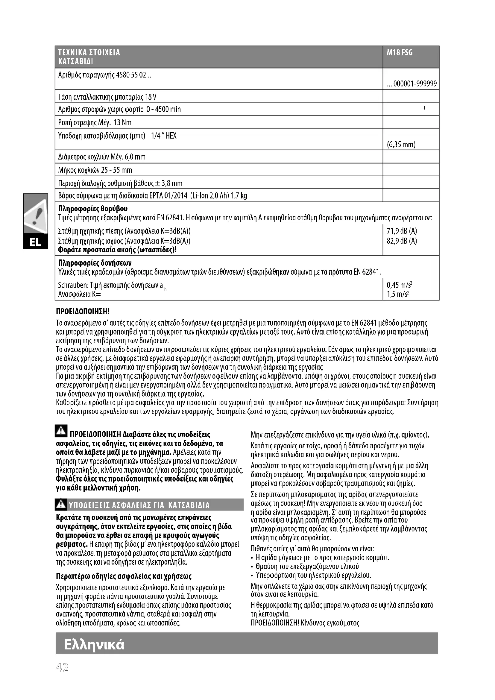 ΠΡΟΣΟΧΗ! ΠΡΟEIΔΟΠΟIΗΣΗ! ΚΙΝΔΥΝΟΣ! Πριν από κάθε εργασία στη μηχανή αφαιρείτε την ανταλλακτική μπαταρία. Παρακαλώ διαβάστε σχολαστικά τις οδηγίες χρήσης πριν από την έναρξη λειτουργίας. Εξαρτήματα - Δεν περιλαμβάνονται στα υλικά παράδοσης, συνιστούμενη προσθήκη από το πρόγραμμα εξαρτημάτων. Ηλεκτρικά μηχανήματα δεν επιτρέπεται να απορρίπτονται μαζί με τα οικιακά απορρίμματα. Ηλεκτρικά και ηλεκτρονικά μηχανήματα συλλέγονται ξεχωριστά και παραδίδονται προς ανακύκλωση με τρόπο φιλικό προς το περιβάλλον σε επιχείρηση επεξεργασίας απορριμμάτων. Ενημερωθείτε από τις τοπικές υπηρεσίες ή από ειδικευμένους εμπόρους σχετικά με κέντρα ανακύκλωσης και συλλογής απορριμμάτων. Ηλεκτρικό εργαλείο κατηγορίας ασφάλειας ΙΙ. Ηλεκτρικό εργαλείο στο οποίο η προστασία από ηλεκτροπληξία δεν εξαρτάται μόνο από την βασική μόνωση αλλά και από συμπληρωματικά μέτρα ασφάλειας όπως διπλή ή ενισχυμένη μόνωση. Ευρωπαϊκό σήμα πιστότητας Βρετανικό σήμα πιστότητας Ουκρανικό σήμα πιστότητας Ευρασιατικό σήμα πιστότητας Ελληνικά4545 Tür TEKNIK VERILER İnşaat vidası M18 FSG Üretim numarası 4580 55 02... ... 000001-999999 Kartuş akü gerilimi 18 V Boştaki devir sayısı 0 - 4500 min