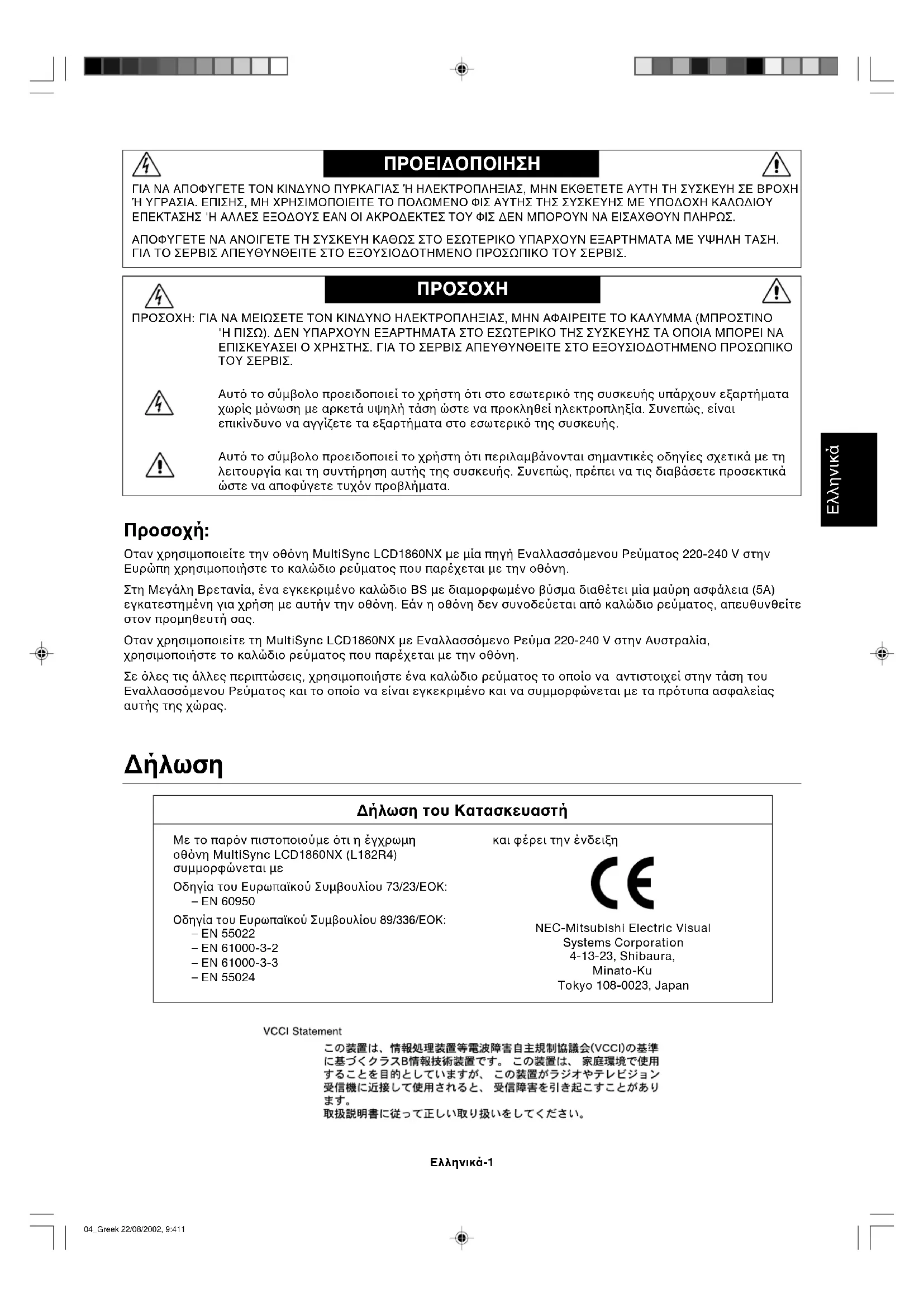 ∆ήλωση του Κατασκευαστή Με το παρν πιστοποιούµε τι η έγχρωµη οθνη MultiSync LCD1860NX (L182R4) συµµορφώνεται µε Οδηγία του Ευρωπαϊκού Συµβουλίου 73/23/ΕΟΚ: – EN 60950 Οδηγία του Ευρωπαϊκού Συµβουλίου 89/336/ΕΟΚ: – EN 55022 – EN 61000-3-2 – EN 61000-3-3 – EN 55024 και φέρει την ένδειξη NEC-Mitsubishi Electric Visual Systems Corporation 4-13-23, Shibaura, Minato-Ku Tokyo 108-0023, Japan 04_Greek 22/08/2002, 9:411Ελληνικά-2 MultiSync LCD1860NX Περιεχ µενα Η συσκευασία* της νέας σας οθνης NEC MultiSync LCD πρέπει να περιλαµβάνει τα ακλουθα: