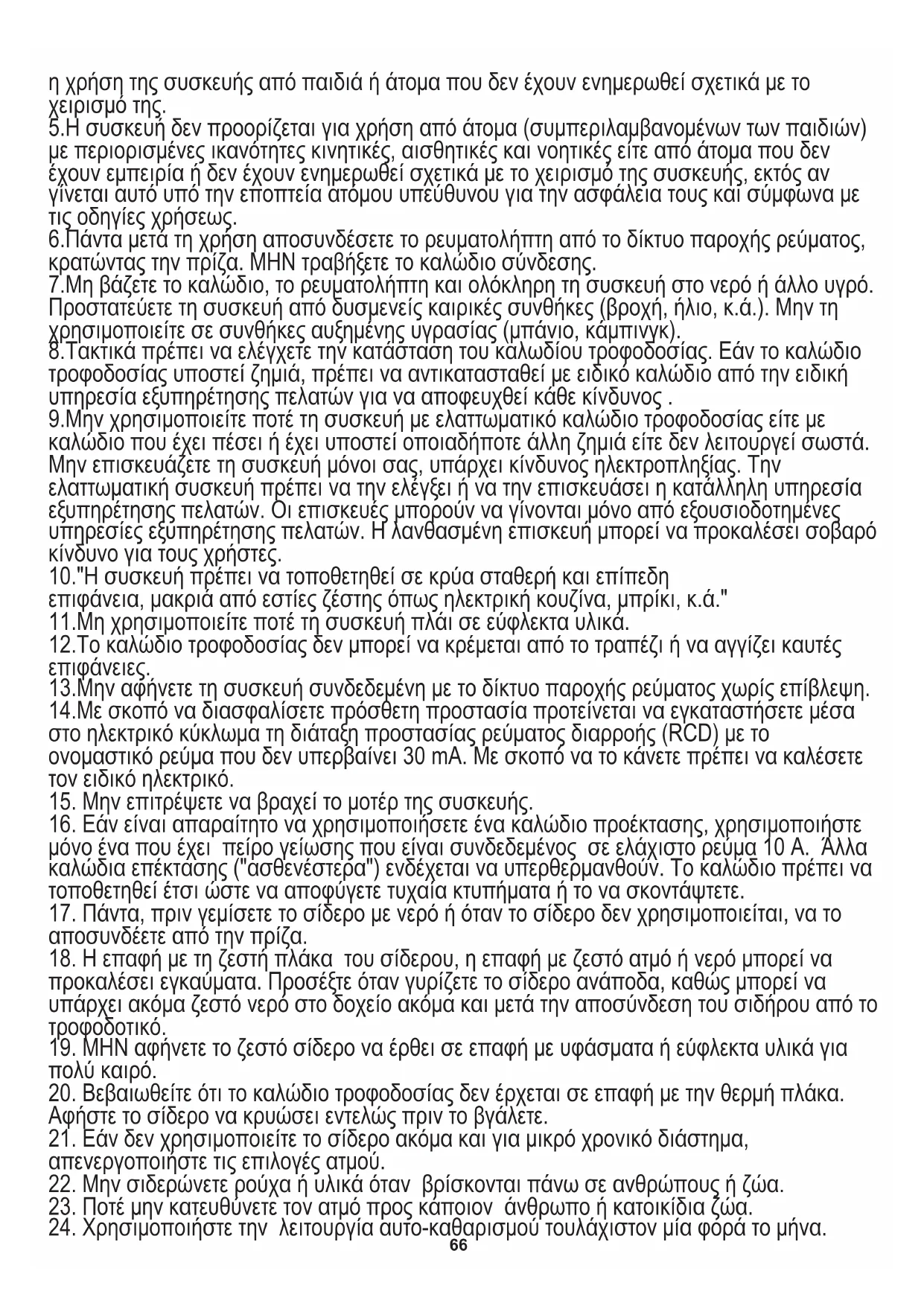 4.Πρέπει να προσέχετε ιδιαιτέρως κατά τη διάρκεια χρήσης της συσκευής όταν δίπλα βρίσκονται παιδιά. Δεν επιτρέπεται τα παιδιά να παίζουν με τη συσκευή. Δεν επιτρέπεται 1.Πριν από τη χρήση της συσκευής πρέπει να διαβάσετε τις οδηγίες χρήσεως και να τις ακολουθήσετε. Ο παραγωγός δεν ευθύνεται για ενδεχόμενες ζημιές που οφείλονται σε μη ενδεδειγμένη χρήση ή σε λάθος χειρισμό της συσκευής. 2.Η συσκευή προορίζεται για οικιακή χρήση. Απαγορεύεται η χρήση της για άλλους σκοπούς, για τους οποίους δεν προορίζεται. ΓΕΝΙΚΟΙ ΚΑΝΟΝΕΣ ΑΣΦΑΛΕΙΑΣ 65επιφάνεια, μακριά από εστίες ζέστης όπως ηλεκτρική κουζίνα, μπρίκι, κ.ά." 8.Τακτικά πρέπει να ελέγχετε την κατάσταση του καλωδίου τροφοδοσίας. Εάν το καλώδιο τροφοδοσίας υποστεί ζημιά, πρέπει να αντικατασταθεί με ειδικό καλώδιο από την ειδική υπηρεσία εξυπηρέτησης πελατών για να αποφευχθεί κάθε κίνδυνος . η χρήση της συσκευής από παιδιά ή άτομα που δεν έχουν ενημερωθεί σχετικά με το χειρισμό της. 6.Πάντα μετά τη χρήση αποσυνδέσετε το ρευματολήπτη από το δίκτυο παροχής ρεύματος, κρατώντας την πρίζα. ΜΗΝ τραβήξετε το καλώδιο σύνδεσης. 5.Η συσκευή δεν προορίζεται για χρήση από άτομα (συμπεριλαμβανομένων των παιδιών) με περιορισμένες ικανότητες κινητικές, αισθητικές και νοητικές είτε από άτομα που δεν έχουν εμπειρία ή δεν έχουν ενημερωθεί σχετικά με το χειρισμό της συσκευής, εκτός αν γίνεται αυτό υπό την εποπτεία ατόμου υπεύθυνου για την ασφάλεια τους και σύμφωνα με τις οδηγίες χρήσεως.