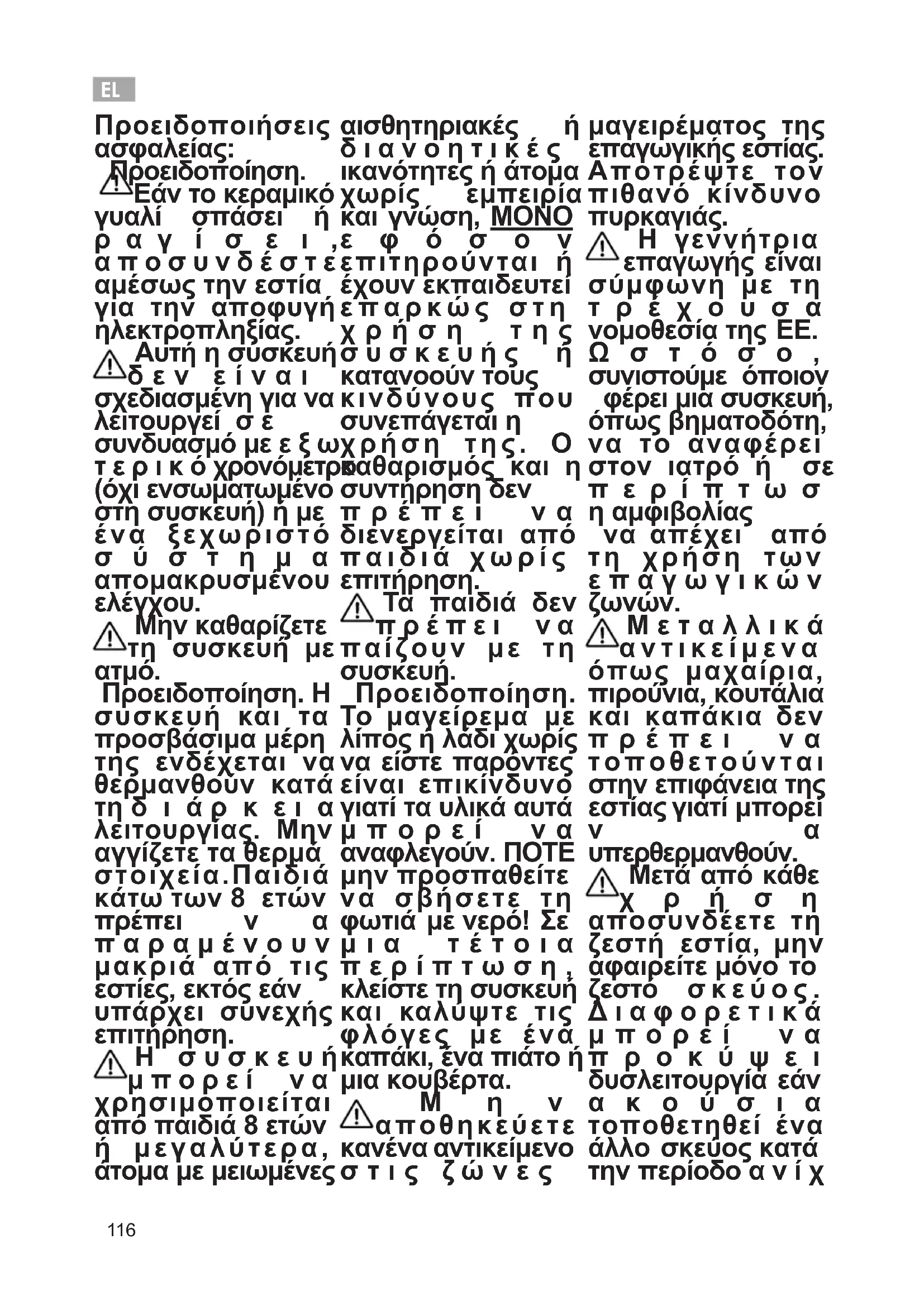 Προειδοποίηση. Εάν το κεραμικό γυαλί σπάσει ή ρ α γ ί σ ε ι , α π ο σ υ ν δ έ σ τ ε αμέσως την εστία για την αποφυγή ηλεκτροπληξίας. Αυτή η συσκευή