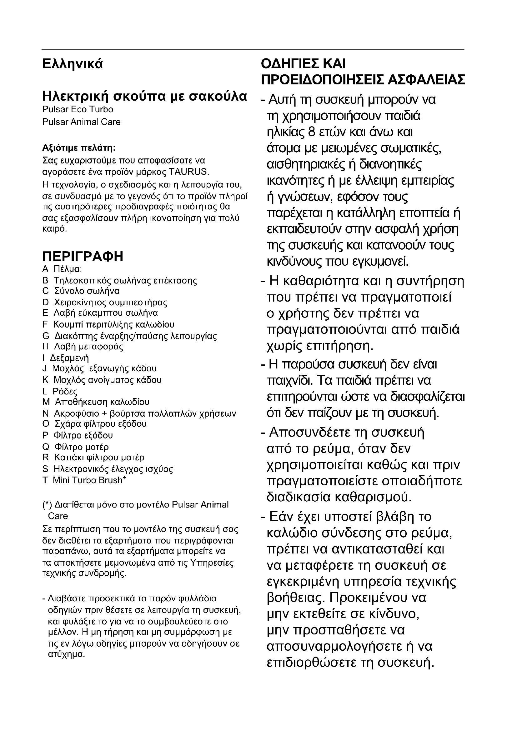 A Πέλμα: B Τηλεσκοπικός σωλήνας επέκτασης C Σύνολο σωλήνα D Χειροκίνητος συμπιεστήρας E Λαβή εύκαμπτου σωλήνα F Κουμπί περιτύλιξης καλωδίου G Διακόπτης έναρξης/παύσης λειτουργίας H Λαβή μεταφοράς I Δεξαμενή J Μοχλός εξαγωγής κάδου K Μοχλός ανοίγματος κάδου L Ρόδες M Αποθήκευση καλωδίου N Ακροφύσιο + βούρτσα πολλαπλών χρήσεων O Σχάρα φίλτρου εξόδου P Φίλτρο εξόδου Q Φίλτρο μοτέρ R Καπάκι φίλτρου μοτέρ S Ηλεκτρονικός έλεγχος ισχύος T Mini Turbo Brush* (*) Διατίθεται μόνο στο μοντέλο Pulsar Animal Care Σε περίπτωση που το μοντέλο της συσκευή σας δεν διαθέτει τα εξαρτήματα που περιγράφονται παραπάνω, αυτά τα εξαρτήματα μπορείτε να τα αποκτήσετε μεμονωμένα από τις Υπηρεσίες τεχνικής συνδρομής. - Διαβάστε προσεκτικά το παρόν φυλλάδιο οδηγιών πριν θέσετε σε λειτουργία τη συσκευή, και φυλάξτε το για να το συμβουλεύεστε στο μέλλον. Η μη τήρηση και μη συμμόρφωση με τις εν λόγω οδηγίες μπορούν να οδηγήσουν σε