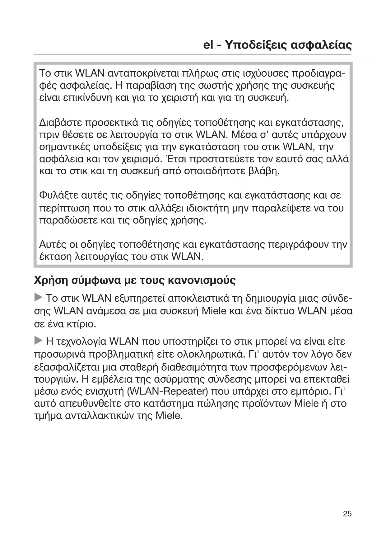 Το στικ WLAN ανταποκρίνεται πλήρως στις ισχύουσες προδιαγρα- φές ασφαλείας. Η παραβίαση της σωστής χρήσης της συσκευής είναι επικίνδυνη και για το χειριστή και για τη συσκευή. Διαβάστε προσεκτικά τις οδηγίες τοποθέτησης και εγκατάστασης, πριν θέσετε σε λειτουργία το στικ WLAN. Μέσα σ' αυτές υπάρχουν σημαντικές υποδείξεις για την εγκατάσταση του στικ WLAN, την ασφάλεια και τον χειρισμό. Έτσι προστατεύετε τον εαυτό σας αλλά και το στικ και τη συσκευή από οποιαδήποτε βλάβη. Φυλάξτε αυτές τις οδηγίες τοποθέτησης και εγκατάστασης και σε περίπτωση που το στικ αλλάξει ιδιοκτήτη μην παραλείψετε να του παραδώσετε και τις οδηγίες χρήσης. Αυτές οι οδηγίες τοποθέτησης και εγκατάστασης περιγράφουν την έκταση λειτουργίας του στικ WLAN. Χρήση σύμφωνα με τους κανονισμούς Το στικ WLAN εξυπηρετεί αποκλειστικά τη δημιουργία μιας σύνδε- σης WLAN ανάμεσα σε μια συσκευή Miele και ένα δίκτυο WLAN μέσα σε ένα κτίριο. Η τεχνολογία WLAN που υποστηρίζει το στικ μπορεί να είναι είτε προσωρινά προβληματική είτε ολοκληρωτικά. Γι' αυτόν τον λόγο δεν εξασφαλίζεται μια σταθερή διαθεσιμότητα των προσφερόμενων λει- τουργιών. Η εμβέλεια της ασύρματης σύνδεσης μπορεί να επεκταθεί μέσω ενός ενισχυτή (WLAN-Repeater) που υπάρχει στο εμπόριο. Γι' αυτό απευθυνθείτε στο κατάστημα πώλησης προϊόντων Miele ή στο τμήμα ανταλλακτικών της Miele.el - Υποδείξεις ασφαλείας