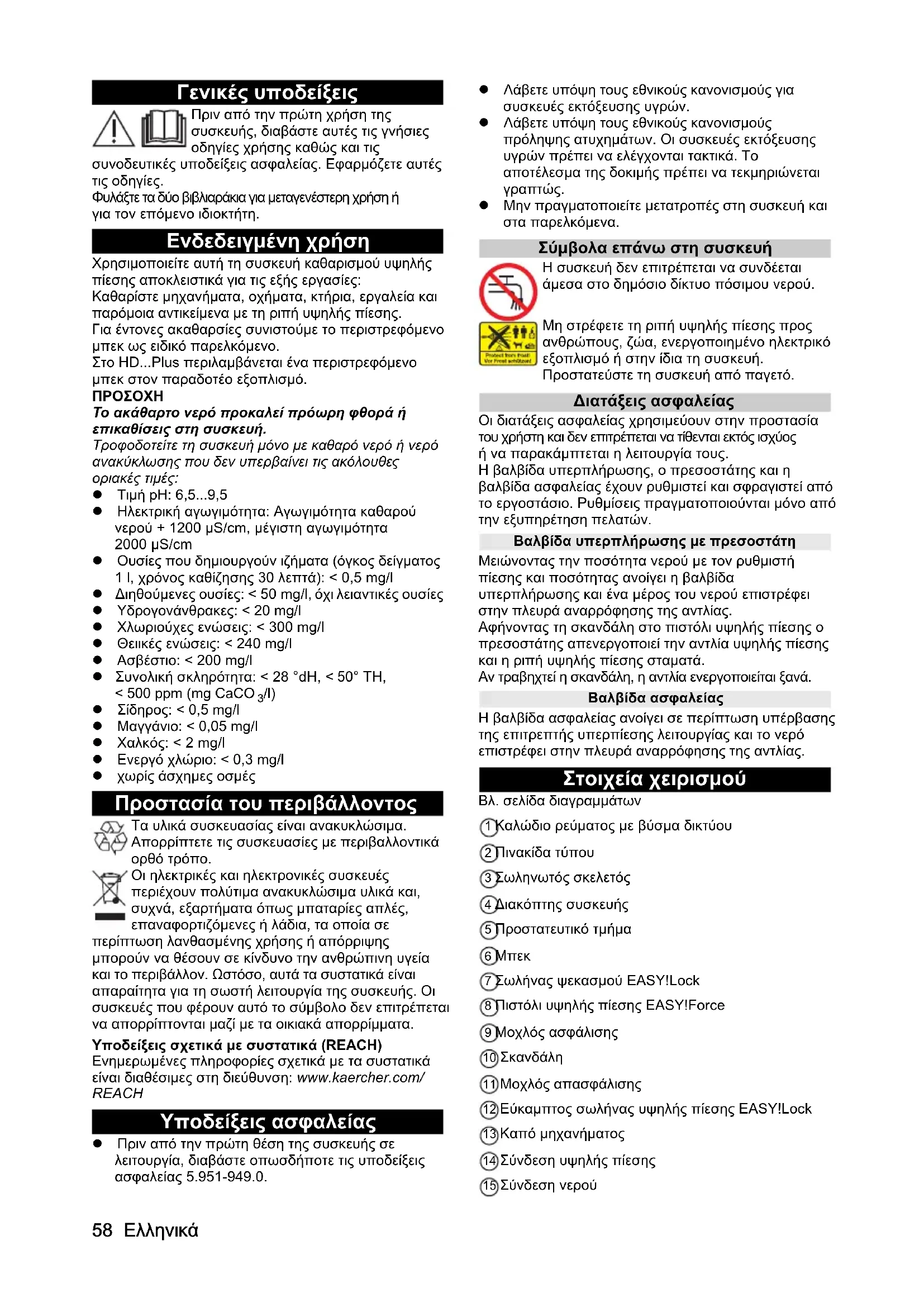 /l) Σίδηρος: < 0,5 mg/l Μαγγάνιο: < 0,05 mg/l Χαλκός: < 2 mg/l Ενεργό χλώριο: < 0,3 mg/l χωρίς άσχημες οσμές Προστασία του περιβάλλοντος Τα υλικά συσκευασίας είναι ανακυκλώσιμα. Απορρίπτετε τις συσκευασίες με περιβαλλοντικά ορθό τρόπο. Οι ηλεκτρικές και ηλεκτρονικές συσκευές περιέχουν πολύτιμα ανακυκλώσιμα υλικά και, συχνά, εξαρτήματα όπως μπαταρίες απλές, επαναφορτιζόμενες ή λάδια, τα οποία σε περίπτωση λανθασμένης χρήσης ή απόρριψης μπορούν να θέσουν σε κίνδυνο την ανθρώπινη υγεία και το περιβάλλον. Ωστόσο, αυτά τα συστατικά είναι απαραίτητα για τη σωστή λειτουργία της συσκευής. Οι συσκευές που φέρουν αυτό το σύμβολο δεν επιτρέπεται να απορρίπτονται μαζί με τα οικιακά απορρίμματα. Υποδείξεις σχετικά με συστατικά (REACH) Ενημερωμένες πληροφορίες σχετικά με τα συστατικά είναι διαθέσιμες στη διεύθυνση: www.kaercher.com/ REACH Υποδείξεις ασφαλείας Πριν από την πρώτη θέση της συσκευής σε λειτουργία, διαβάστε οπωσδήποτε τις υποδείξεις ασφαλείας 5.951-949.0. Λάβετε υπόψη τους εθνικούς κανονισμούς για συσκευές εκτόξευσης υγρών. Λάβετε υπόψη τους εθνικούς κανονισμούς πρόληψης ατυχημάτων. Οι συσκευές εκτόξευσης υγρών πρέπει να ελέγχονται τακτικά. Το αποτέλεσμα της δοκιμής πρέπει να τεκμηριώνεται